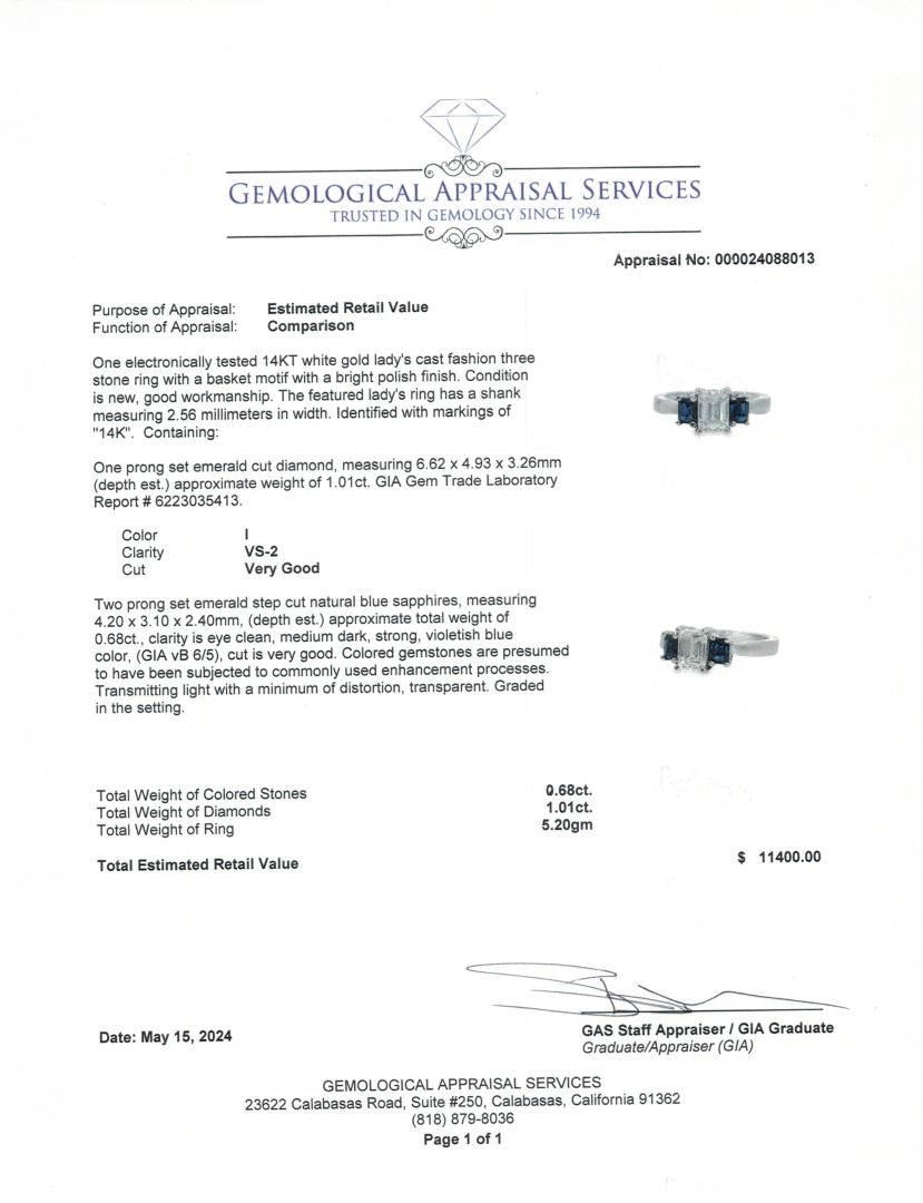 This BEAUTIFUL three-stone ring features a GIA-certified 1.01ct emerald cut diamond with VS-2 clarity, accented by 0.68ct of vibrant natural blue sapphires. A timeless and sophisticated design! One electronically tested 14KT white gold lady's cast fashion three stone ring with a basket motif with a bright polish finish. Condition is new, good workmanship. The featured lady's ring has a shank measuring 2.56 millimeters in width. Identified with markings of 14K. Containing: One prong set emerald cut diamond, measuring 6.62 x 4.93 x 3.26mm (depth est.) approximate weight of 1.01ct. GIA Gem Trade Laboratory Report # 6223035413. Color: I Clarity: VS-2 Cut: Very Good Two prong set emerald step cut natural blue sapphires, measuring 4.20 x 3.10 x 2.40mm (depth est.) approximate total weight of 0.68ct., clarity is eye clean, medium dark, strong, violetish blue color, (GIA vB 6/5), cut is very good. Colored gemstones are presumed to have been subjected to commonly used enhancement processes. Transmitting light with a minimum of distortion, transparent. Graded in the setting. Total Weight of Colored Stones: 0.68ct. Total Weight of Diamonds: 1.01ct. Total Weight of Ring: 5.20gm Total Estimated Retail Value: $11400.00 Appraisal No: 000024088013