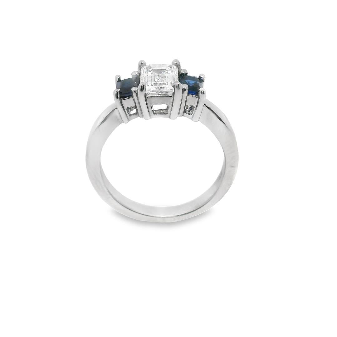 This BEAUTIFUL three-stone ring features a GIA-certified 1.01ct emerald cut diamond with VS-2 clarity, accented by 0.68ct of vibrant natural blue sapphires. A timeless and sophisticated design! One electronically tested 14KT white gold lady's cast fashion three stone ring with a basket motif with a bright polish finish. Condition is new, good workmanship. The featured lady's ring has a shank measuring 2.56 millimeters in width. Identified with markings of 14K. Containing: One prong set emerald cut diamond, measuring 6.62 x 4.93 x 3.26mm (depth est.) approximate weight of 1.01ct. GIA Gem Trade Laboratory Report # 6223035413. Color: I Clarity: VS-2 Cut: Very Good Two prong set emerald step cut natural blue sapphires, measuring 4.20 x 3.10 x 2.40mm (depth est.) approximate total weight of 0.68ct., clarity is eye clean, medium dark, strong, violetish blue color, (GIA vB 6/5), cut is very good. Colored gemstones are presumed to have been subjected to commonly used enhancement processes. Transmitting light with a minimum of distortion, transparent. Graded in the setting. Total Weight of Colored Stones: 0.68ct. Total Weight of Diamonds: 1.01ct. Total Weight of Ring: 5.20gm Total Estimated Retail Value: $11400.00 Appraisal No: 000024088013