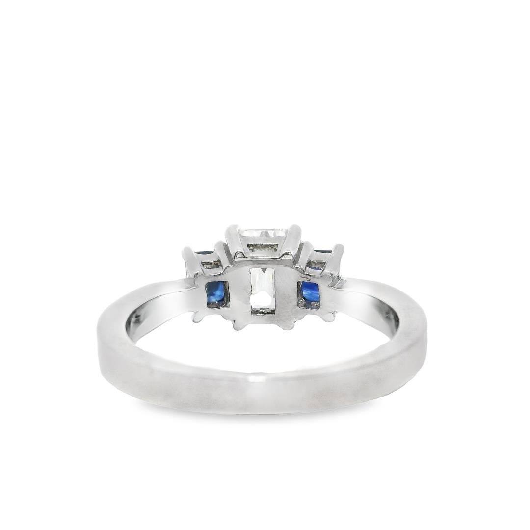 This BEAUTIFUL three-stone ring features a GIA-certified 1.01ct emerald cut diamond with VS-2 clarity, accented by 0.68ct of vibrant natural blue sapphires. A timeless and sophisticated design! One electronically tested 14KT white gold lady's cast fashion three stone ring with a basket motif with a bright polish finish. Condition is new, good workmanship. The featured lady's ring has a shank measuring 2.56 millimeters in width. Identified with markings of 14K. Containing: One prong set emerald cut diamond, measuring 6.62 x 4.93 x 3.26mm (depth est.) approximate weight of 1.01ct. GIA Gem Trade Laboratory Report # 6223035413. Color: I Clarity: VS-2 Cut: Very Good Two prong set emerald step cut natural blue sapphires, measuring 4.20 x 3.10 x 2.40mm (depth est.) approximate total weight of 0.68ct., clarity is eye clean, medium dark, strong, violetish blue color, (GIA vB 6/5), cut is very good. Colored gemstones are presumed to have been subjected to commonly used enhancement processes. Transmitting light with a minimum of distortion, transparent. Graded in the setting. Total Weight of Colored Stones: 0.68ct. Total Weight of Diamonds: 1.01ct. Total Weight of Ring: 5.20gm Total Estimated Retail Value: $11400.00 Appraisal No: 000024088013