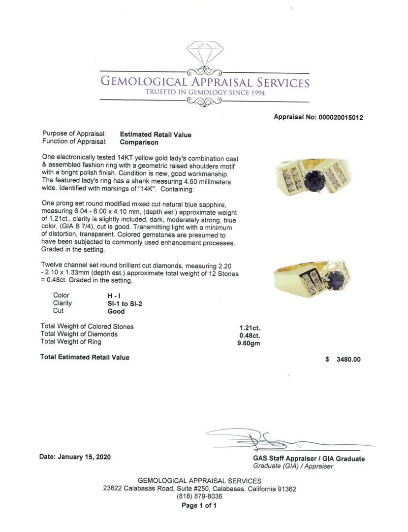 One electronically tested 14KT yellow gold lady's combination cast & assembled fashion ring with a geometric raised shoulders motif with a bright polish finish. The featured lady's ring has a shank measuring 4.60 millimeters wide. Identified with markings of '14K'. Condition is new, good workmanship. Containing: One prong set round modified mixed cut natural blue sapphire, measuring 6.04 - 6.00 x 4.10 mm, (depth est.) approximate weight of 1.21ct., clarity is slightly included, dark, moderately strong, blue color, (GIA B 7/4), cut is good. Transmitting light with a minimum of distortion, transparent. Colored gemstones are presumed to have been subjected to commonly used enhancement processes. Graded in the setting. Twelve channel set round brilliant cut diamonds, measuring 2.20 - 2.10 x 1.33mm (depth est.) approximate total weight of 12 Stones = 0.48ct. Graded in the setting. Color H - I Clarity SI-1 to SI-2 Cut Good. Total Weight of Colored Stones 1.21ct.. Total Weight of Diamonds 0.48ct.. Total Weight of Ring 9.60gm GAS Appraised at $3480.00. GAS Appraised.