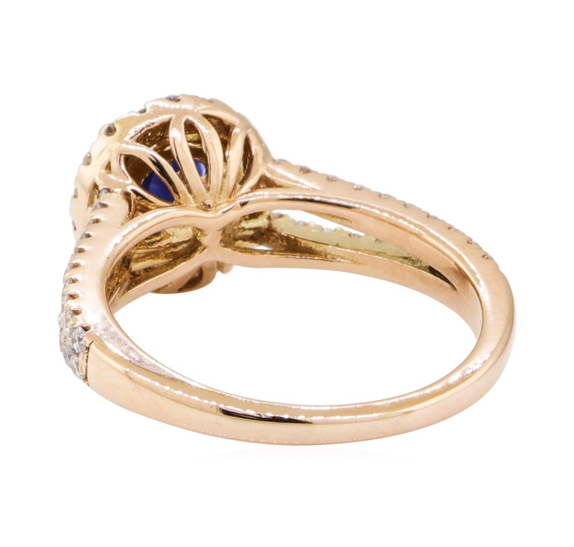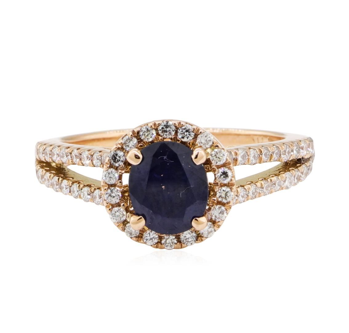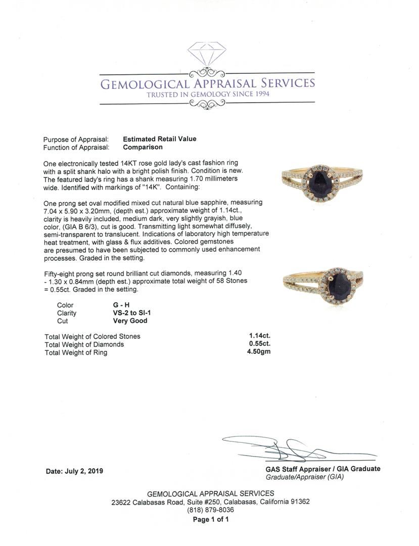One electronically tested 14KT rose gold lady's cast fashion ring with a split shank halo with a bright polish finish. The featured lady's ring has a shank measuring 1.70 millimeters wide. Identified with markings of '14K'. Condition is new. Containing: One prong set oval modified mixed cut natural blue sapphire, measuring 7.04 x 5.90 x 3.20mm, (depth est.) approximate weight of 1.14ct., clarity is heavily included, medium dark, very slightly grayish, blue color, (GIA B 6/3), cut is good. Transmitting light somewhat diffusely, semi-transparent to translucent. Indications of laboratory high temperature heat treatment, with glass & flux additives. Colored gemstones are presumed to have been subjected to commonly used enhancement processes. Graded in the setting. Fifty-Eight prong set round brilliant cut diamonds, measuring 1.40 - 1.30 x 0.84mm (depth est.) approximate total weight of 58 Stones = 0.55ct. Graded in the setting. Color G - H Clarity VS-2 to SI-1 Cut Very Good. Total Weight of Colored Stones 1.14ct.. Total Weight of Diamonds 0.55ct.. Total Weight of Ring 4.50gm GAS Appraised at $3405.00. GAS Appraised.