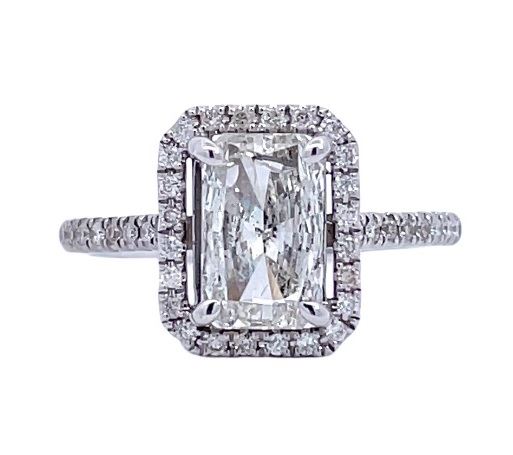 One electronically tested 14KT white gold lady's cast fashion emerald shaped halo wedding ring with a cathedral shank with a bright polish finish. The featured lady's ring has a shank measuring 1.70 millimeters wide. Identified with markings of "14K". Condition is new, good workmanship. Containing: One prong set radiant shaped cut diamond, measuring 8.80 x 5.48 x 3.30mm (depth est.), 10.00% GTCF approximate weight of 1.50ct. Graded in the setting. Color H - I Clarity SI-1 Cut Very Good Forty prong set round brilliant cut diamonds, measuring 1.10 - 1.05 x 0.67mm (depth est.) approximate total weight of 40 Stones = 0.20ct. Graded in the setting. Color G - H Clarity VS-1 to SI-1 Cut Very Good Total Weight of Diamonds 1.70ct. Total Weight of Wedding Ring 2.80gm