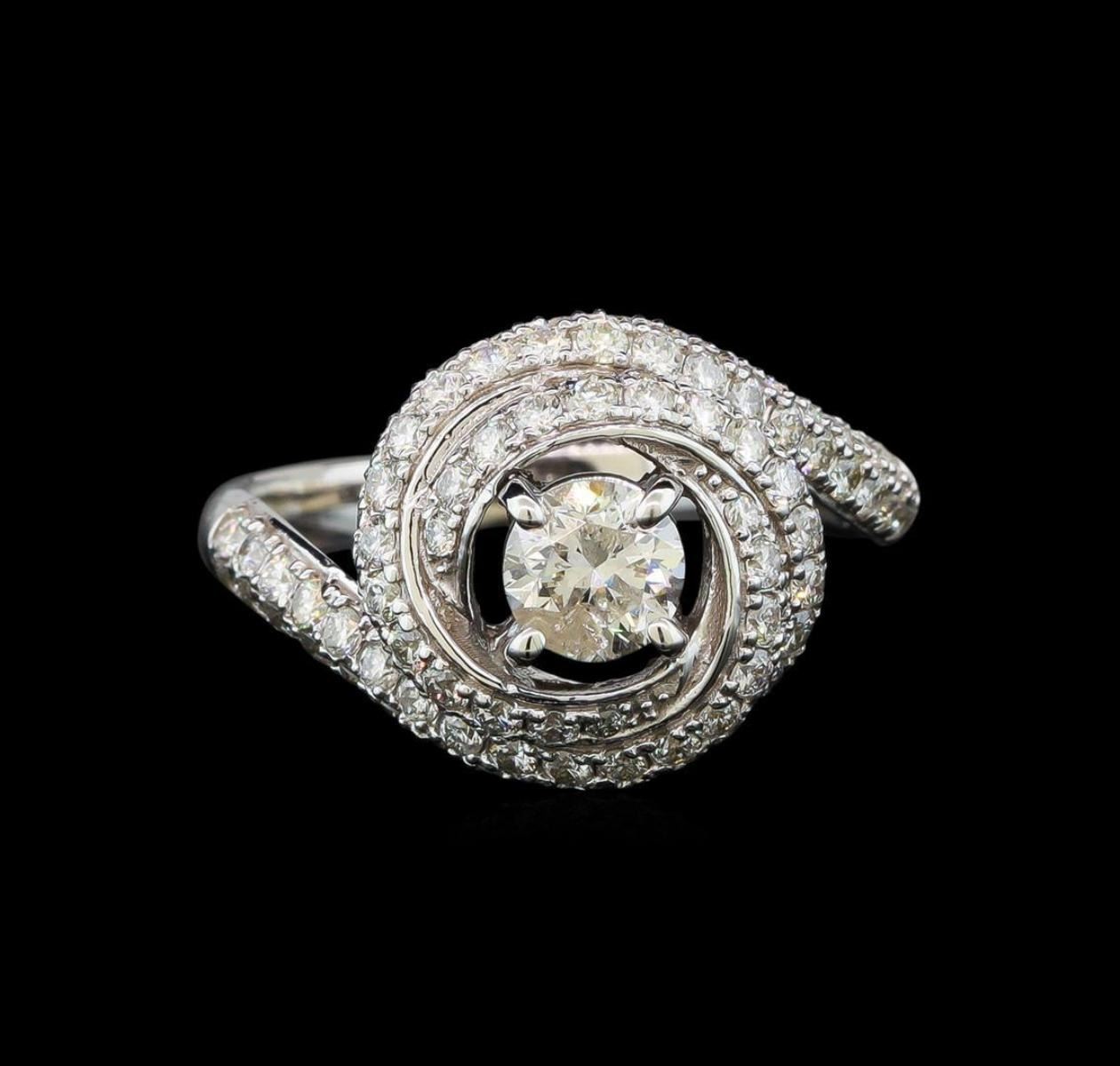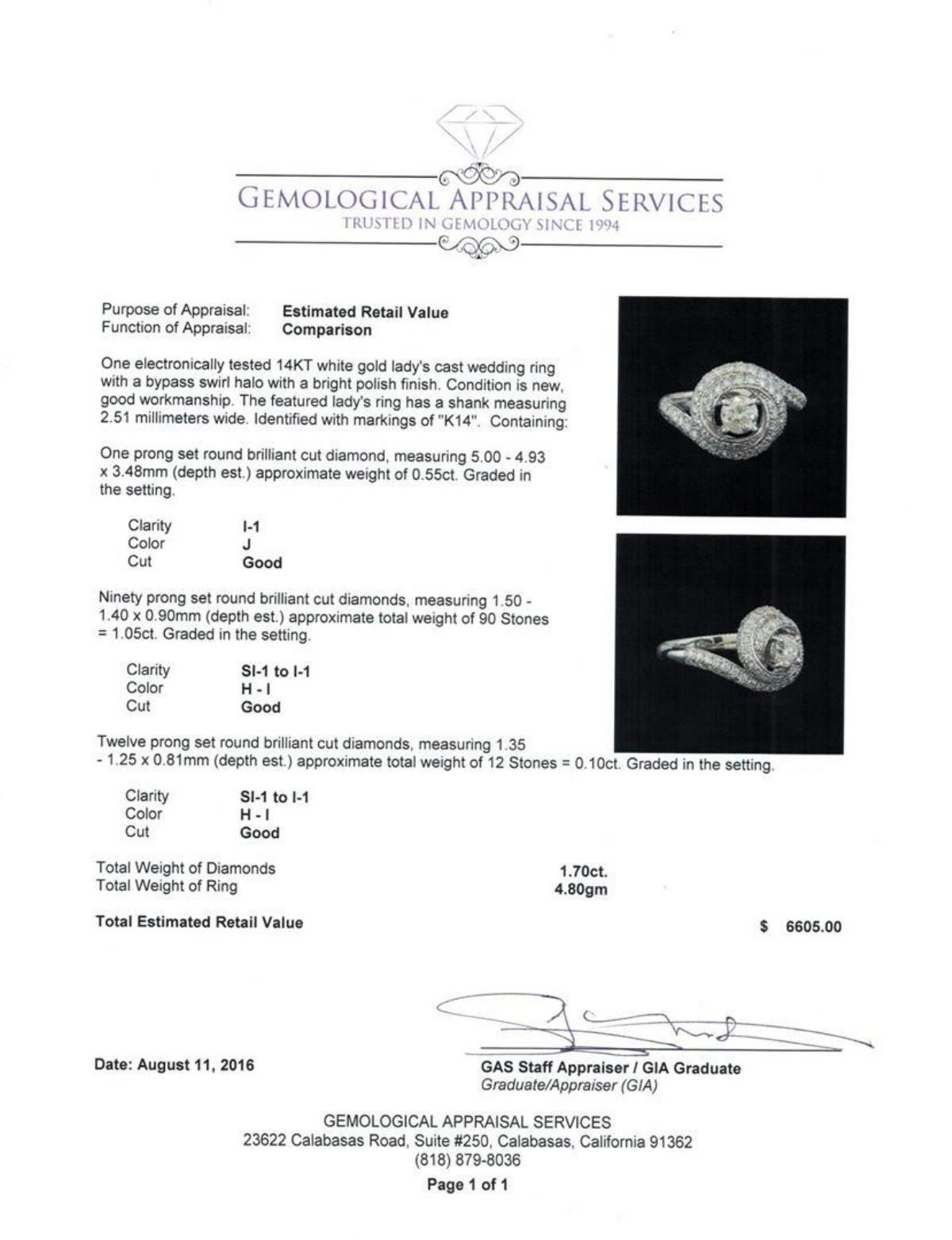 One electronically tested 14KT white gold lady's cast wedding ring with a bypass swirl halo with a bright polish finish. The featured lady's ring has a shank measuring 2.51 millimeters wide. Identified with markings of 'K14'. Condition is new, good workmanship. Containing: One prong set round brilliant cut diamond, measuring 5.00 - 4.93 x 3.48mm (depth est.) approximate weight of 0.55ct. Graded in the setting. Clarity I-1. Color: J Cut Good Ninety prong set round brilliant cut diamonds, measuring 1.50 - 1.40 x 0.90mm (depth est.) approximate total weight of 90 Stones = 1.05ct. Graded in the setting. Clarity SI-1 to I-1. Color: H - I Cut Good Twelve prong set round brilliant cut diamonds, measuring 1.35 - 1.25 x 0.81mm (depth est.) approximate total weight of 12 Stones = 0.10ct. Graded in the setting. Clarity SI-1 to I-1. Color: H - I Cut Good. Total Weight of Diamonds 1.70ct.. Total Weight of Ring 4.80gm. GAS Appraised.