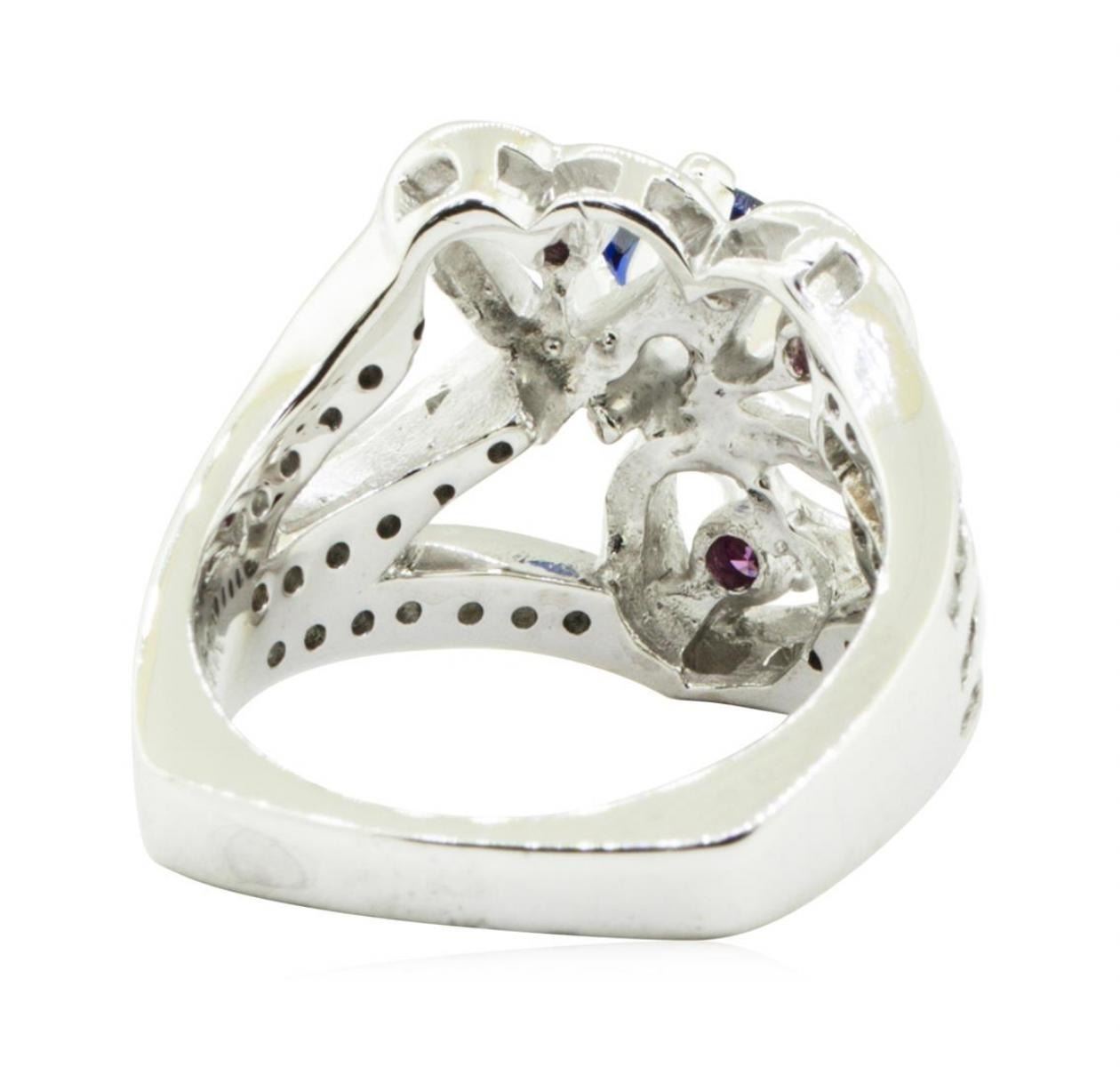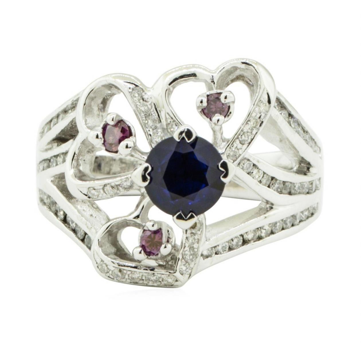 One electronically tested 14KT white gold lady's combination cast & assembled fashion heart ring with a freeform split shank with a bright polish finish. The featured lady's ring has a Euro-shank measuring 3.00 millimeters in width. Identified with markings of '14K'. Condition is like new, good workmanship. Containing: One prong set round modified brilliant cut natural blue sapphire, measuring 6.10 - 6.07 x 3.96 mm, (depth est.) approximate weight of 1.15ct., clarity is slightly included, dark, moderately strong, blue color, (GIA B 7/4), cut is very good. Transmitting light with a minimum of distortion, transparent. Colored gemstones are presumed to have been subjected to commonly used enhancement processes. Graded in the setting. Three prong set round brilliant cut treated diamonds, measuring 2.20 - 1.90 x 1.27mm (depth est.) approximate total weight of 3 Stones = 0.10 ct. Colored gemstones are presumed to have been subjected to commonly used enhancement processes. Graded in the setting. Color Fancy Dark Purple Clarity VS-2 to SI-1 Cut Good Seventy-Eight channel and prong set round brilliant cut diamonds, measuring 1.30 - 1.00 x 0.71mm (depth est.) approximate total weight of 78 Stones = 0.45ct. Graded in the setting. Color H - I Clarity SI-1 to SI-2 Cut Good. Total Weight of Colored Stones 1.15ct.. Total Weight of Diamonds 0.55ct.. Total Weight of Ring 10.00gm GAS Appraised at $3590.00. GAS Appraised.