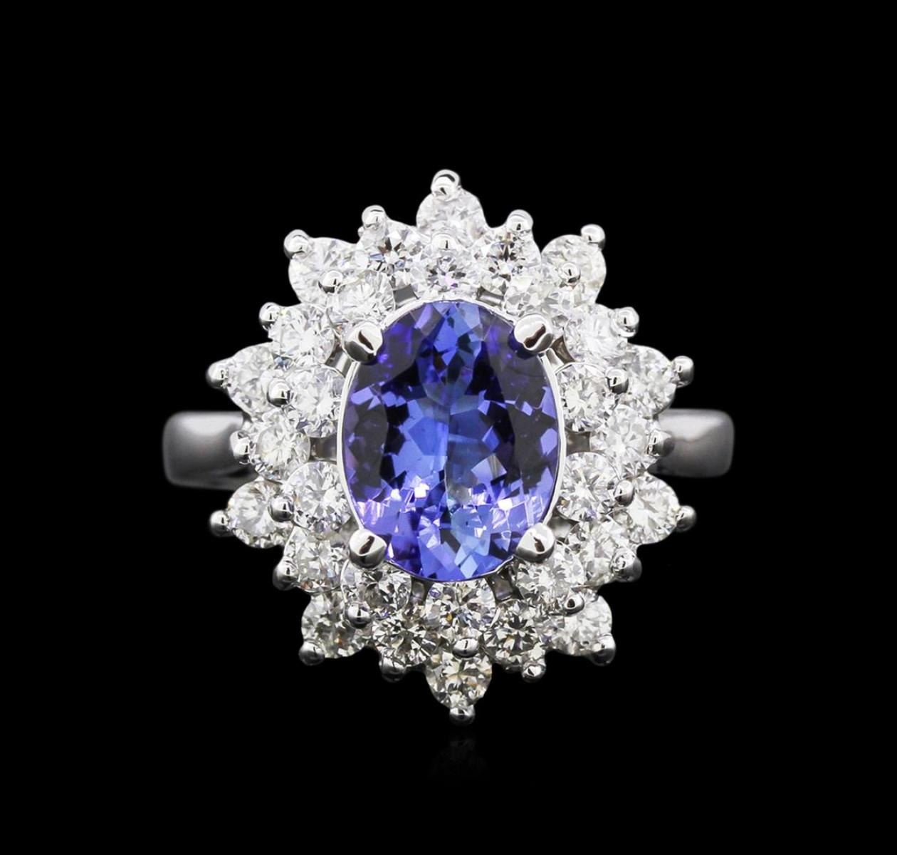 One stamped & tested 14KT white gold lady's cast cocktail ring with a tapered shank with a bright polish finish. Condition is new. Containing: One prong set oval standard brilliant cut natural tanzanite, measuring 9.40 x 7.00 x 3.90mm, approximate weight of 1.70ct., clarity is eye clean, type I, medium, very slightly grayish, bluish violet color, (GIA bV 5/3), cut is very good. Thirty prong set round brilliant cut diamonds, measuring 2.40 - 2.30 x 1.41mm (depth est.) approximate total weight of 30 Stones = 1.32ct. Clarity: VS-2 to SI-2. Color: G - I. Cut: Very Good. Total Weight of Colored Stones: 1.70ct. Total Weight of Diamonds: 1.32ct. Total Weight of Ring: 6.00 gm. GAS Appraised at $5,775.00.