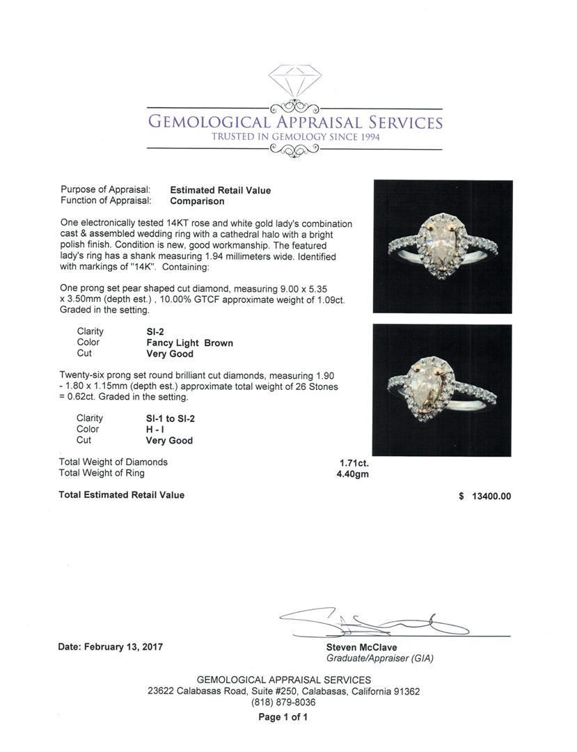 One electronically tested 14KT rose and white gold lady's combination cast & assembled wedding ring with a cathedral halo with a bright polish finish. The featured lady's ring has a shank measuring 1.94 millimeters wide. Identified with markings of '14K'. Condition is new, good workmanship. Containing: One prong set pear shaped cut diamond, measuring 9.00 x 5.35 x 3.50mm (depth est.) , 10.00.%. GTCF approximate weight of 1.09ct. Graded in the setting. Clarity SI-2 Cut Very Good Twenty-Six prong set round brilliant cut diamonds, measuring 1.90 - 1.80 x 1.15mm (depth est.) approximate total weight of 26 Stones = 0.62ct. Graded in the setting. Clarity SI-1 to SI-2. Color: H - I Cut Very Good. Total Weight of Diamonds 1.71ct.. Total Weight of Ring 4.40gm. GAS Appraised.