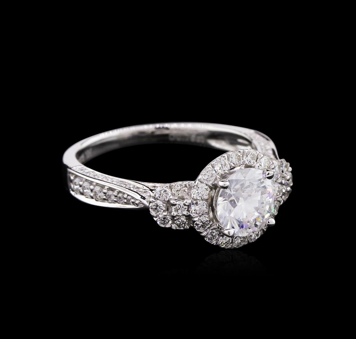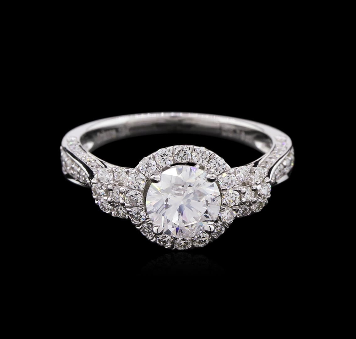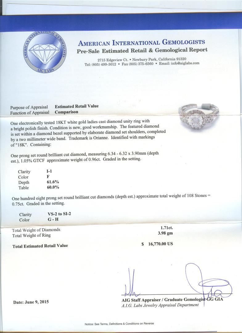 One electronically tested 18KT white gold ladies cast diamond ring with a bright polish finish. Condition is new, good workmanship. The featured diamond is set within a diamond bezel supported by elaborate diamond set shoulders, completed by a two millimeter wide band. Trademark is Orianne. Identified with markings of "19K". Containing: One prong set round brilliant cut diamond, measuring 3.34-6.32 x x3.90mm (depth est.), 1.05% GTCF approximate weight of 0.96ct. Graded in the setting. Clarity I-1, Clolor F, Depth 61.6%, Table 60.0%. One hundred eight prong set round rilliant cut diamonds (depth est.) approximate total weight of 108 stones = 0.75ct. Graded in the setting. Clarity VS-2 to SI-2, Color G-H. Total weight of diamonds 1.71ct. Total weight of ring 3.98gm Total estimated retail value $16,770.00 AIG Appraised.