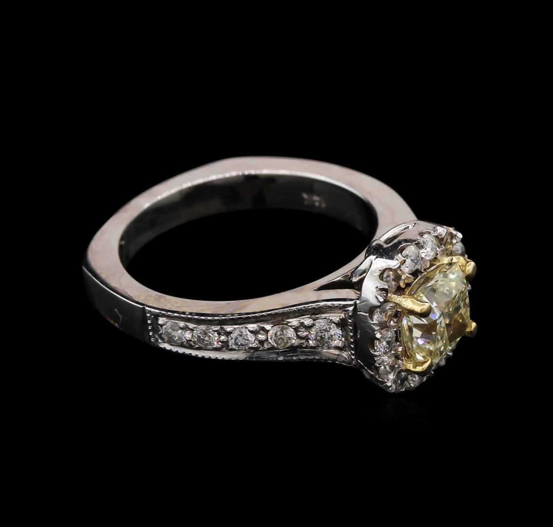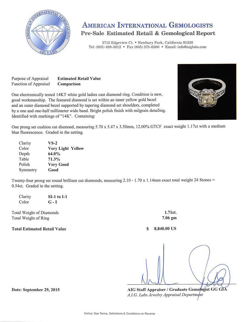 One electronically tested 14KT white gold ladies cast diamond ring. The featured diamond is set within an inner yellow gold bezel and an outer diamond bezel supported by tapering diamond set shoulders, completed by a one and one-half millimeter wide band. Bright polish finish with milgrain detailing. Identified with markings of "14K". Condition is new, good workmanship. Containing: One prong set cushion cut diamond, measuring 5.70 x 5.47 x 3.50mm, 12.00.%. GTCF exact weight 1.17ct with a medium blue fluorescence. Graded in the setting. Clarity: VS-2. Depth: 64.0%. Table 71.3%. Twenty-Four prong set round brilliant cut diamonds, measuring 2.10 - 1.70 x 1.14mm exact total weight 24 Stones = 0.54ct. Graded in the setting. Clarity: SI-1 to I-1. Color: G - I. Total Weight of Diamonds 1.71ct. Total Weight of Ring 7.06gm. AIG Appraised.