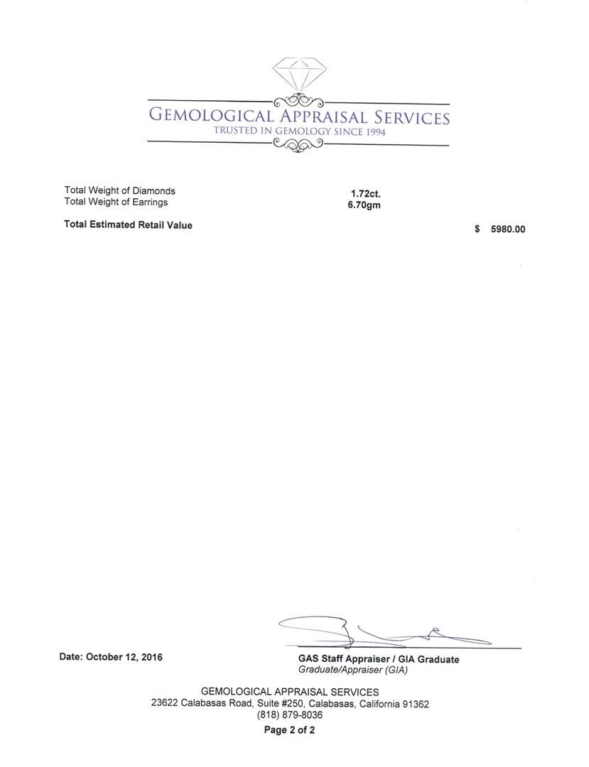 One pair electronically tested 14KT white gold lady's combination cast & assembled inside out hoop earrings with hinged clip backs with a bright polish finish. The featured lady's earring have a drop of approximately 39 millimeters. Identified with markings of 'K14'. Condition is new, good workmanship. Containing: Eight prong set round brilliant cut diamonds, measuring 3.00 - 2.90 x 1.77mm (depth est.) approximate total weight of 8 Stones = 0.74ct. Graded in the setting. Clarity SI-1 to I-1. Color: H - I Cut Good Two prong set round brilliant cut diamonds, measuring 2.40 - 2.35 x 1.45mm (depth est.) approximate total weight of 2 Stones = 0.10 ct. Graded in the setting. Clarity SI-1 to SI-2. Color: H - I Cut Good Eighty-Six prong set round brilliant cut diamonds, measuring 1.30 - 1.20 x 0.76mm (depth est.) approximate total weight of 86 Stones = 0.62ct. Graded in the setting. Clarity SI-1 to I-1. Color: H - I Cut Good Fifty-Six prong set round brilliant cut diamonds, measuring 1.10 - 1.05 x 0.67mm (depth est.) approximate total weight of 56 Stones = 0.26ct. Graded in the setting. Clarity SI-1 to SI-2. Color: H - I Cut Good. Total Weight of Diamonds 1.72ct.. Total Weight of Earrings 6.70gm. GAS Appraised.