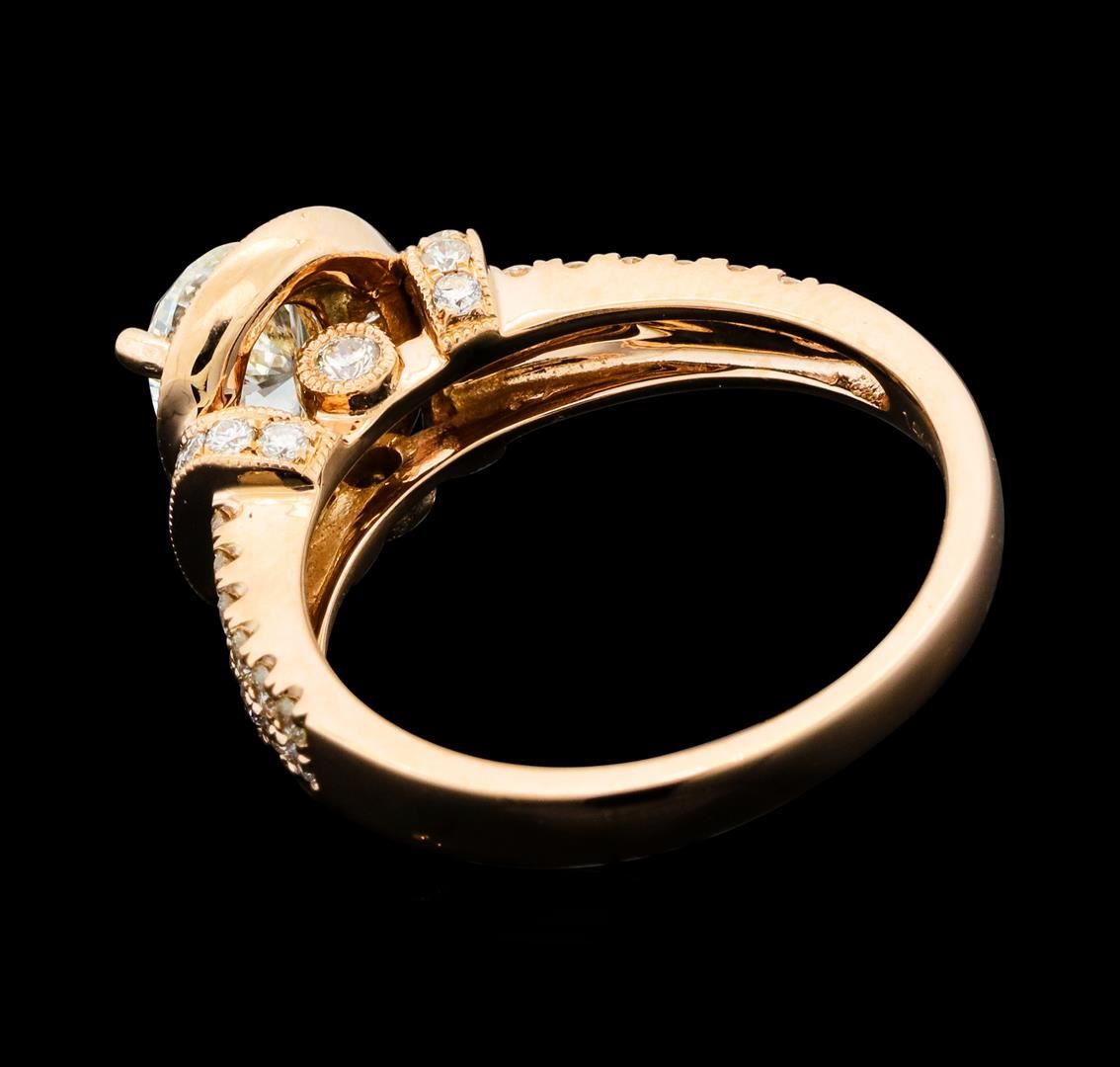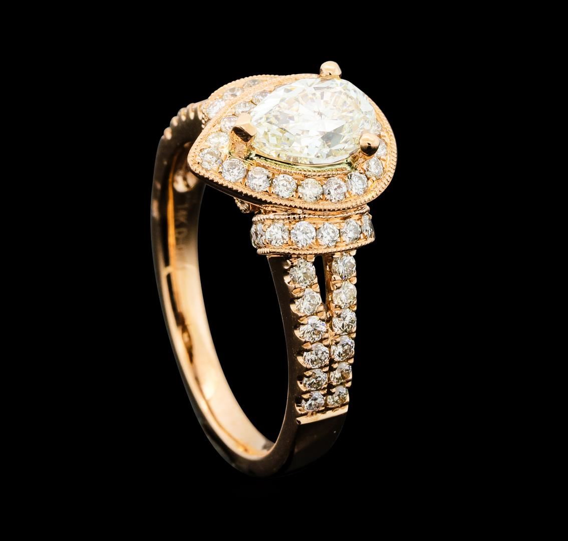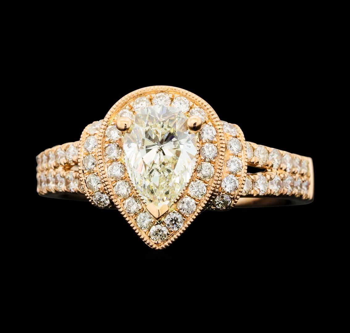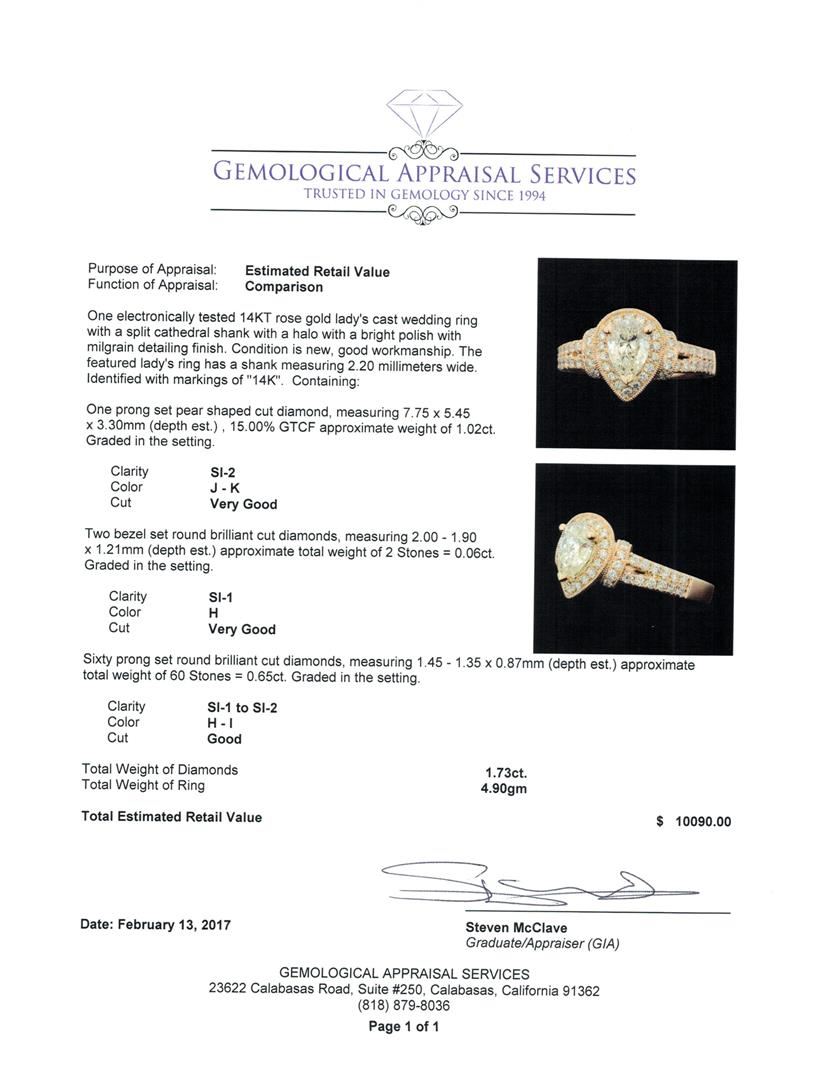 One electronically tested 14KT rose gold lady's cast wedding ring with a split cathedral shank with a halo with a bright polish with milgrain detailing finish. The featured lady's ring has a shank measuring 2.20 millimeters wide. Identified with markings of '14K'. Condition is new, good workmanship. Containing: One prong set pear shaped cut diamond, measuring 7.75 x 5.45 x 3.30mm (depth est.) , 15.00.%. GTCF approximate weight of 1.02ct. Graded in the setting. Clarity SI-2. Color: J - K Cut Very Good Two bezel set round brilliant cut diamonds, measuring 2.00 - 1.90 x 1.21mm (depth est.) approximate total weight of 2 Stones = 0.06ct. Graded in the setting. Clarity SI-1. Color: H Cut Very Good Sixty prong set round brilliant cut diamonds, measuring 1.45 - 1.35 x 0.87mm (depth est.) approximate total weight of 60 Stones = 0.65ct. Graded in the setting. Clarity SI-1 to SI-2. Color: H - I Cut Good. Total Weight of Diamonds 1.73ct.. Total Weight of Ring 4.90gm. GAS Appraised.