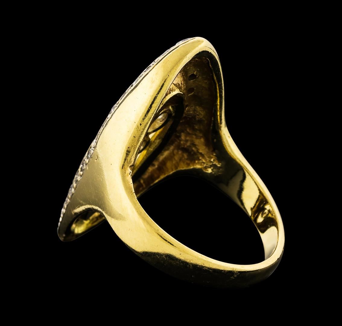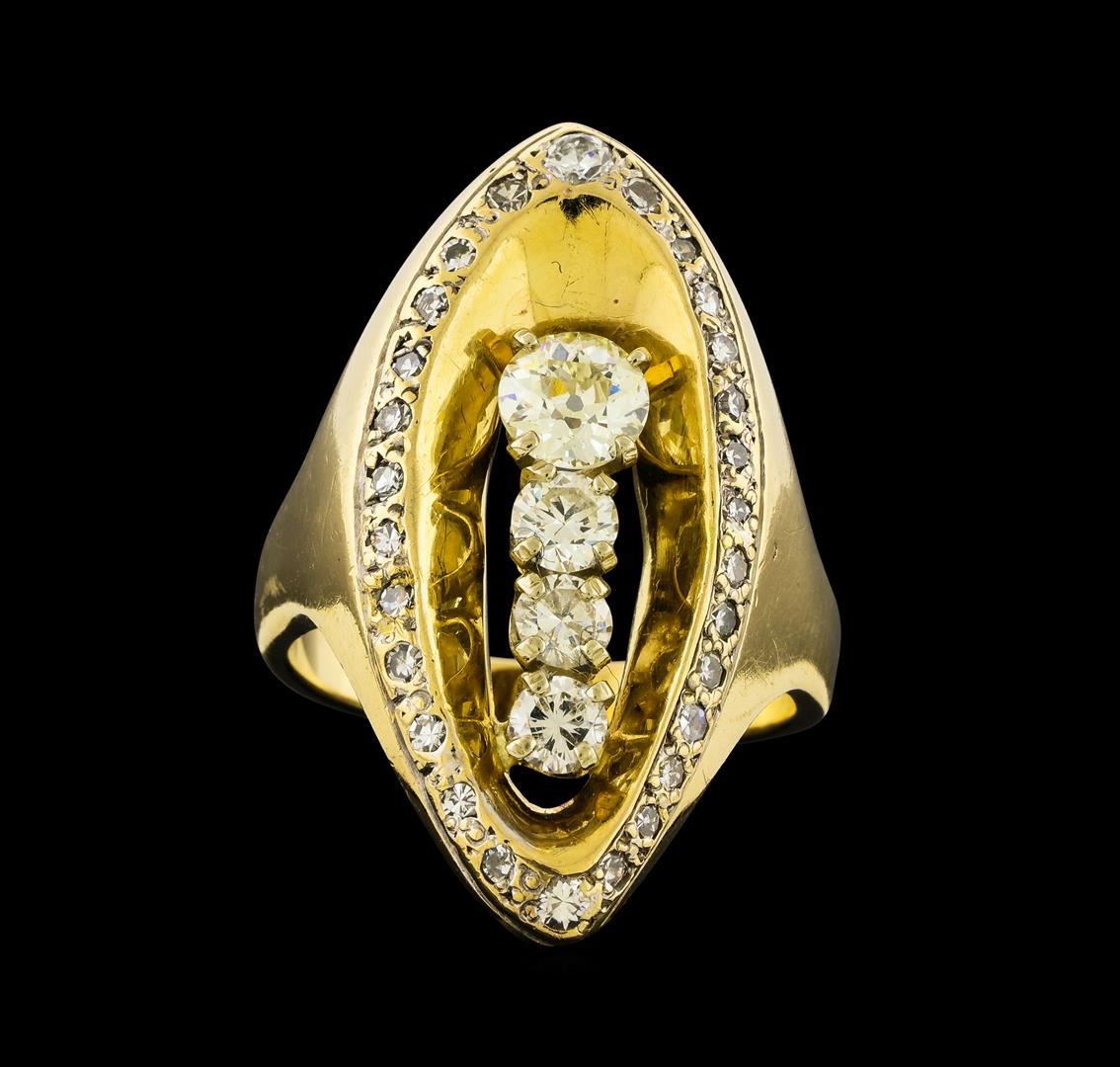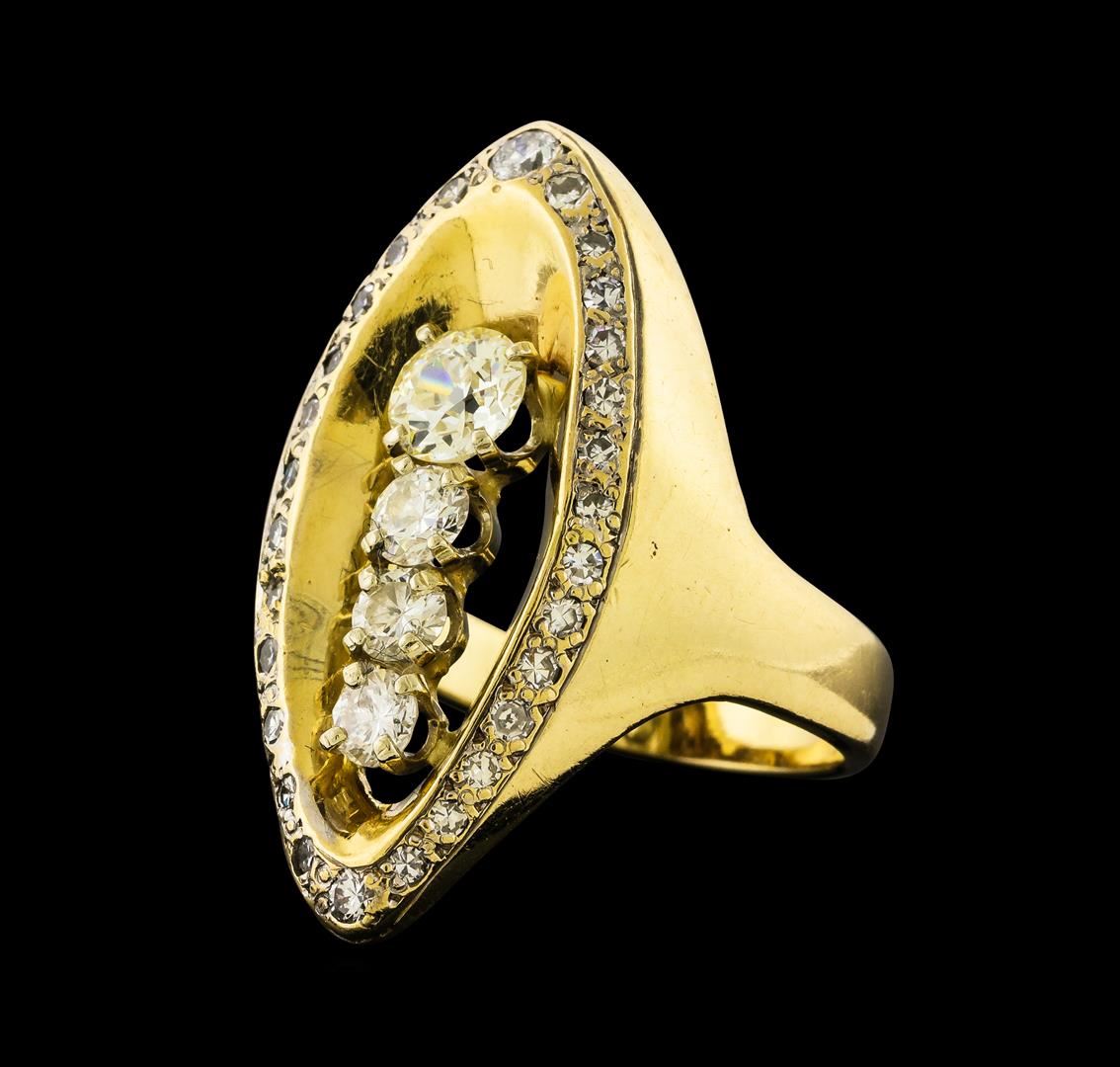 One electronically tested 14KT yellow gold ladies cast & assembled diamond ring. The ring features a vertical ribbon of diamonds set within a diamond bezel supported by tapering shoulders, completed by a three millimeter wide band. Bright polish finish. Condition is good. Containing: Four prong set round brilliant and transitional cut diamonds approximate total weight of 4 Stones = 1.20ct. Graded in the setting. Clarity VS-1 to SI-2. Color: H - K Twenty-Eight prong set transitional and single cut diamonds approximate total weight of 28 Stones = 0.53ct. The clarity grade reflects the overall average for the group. Graded in the setting. Clarity SI-1 to SI-2. Color: G - I. Total Weight of Diamonds 1.73ct.. Total Weight of Ring 13.48gm. AIG Appraised.