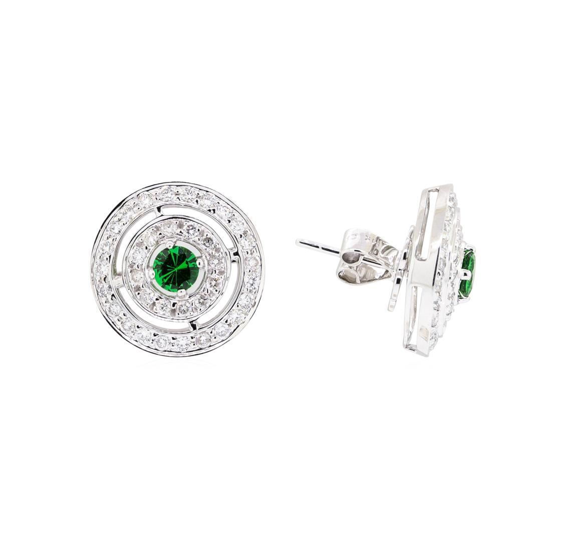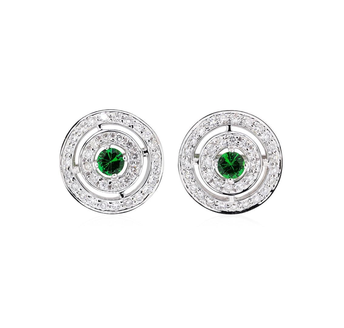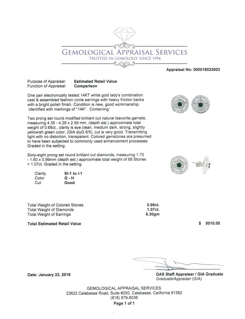 One pair electronically tested 14KT white gold lady's combination cast & assembled fashion circle earrings with heavy friction backs with a bright polish finish. Identified with markings of '14K'. Condition is new, good workmanship. Containing: Two prong set round modified brilliant cut natural tsavorite garnets, measuring 4.35 - 4.29 x 2.59 mm, (depth est.) approximate total weight of 0.66ct., clarity is eye clean, medium dark, strong, slightly yellowish green color, (GIA slyG 6/5), cut is very good. Transmitting light with no distortion, transparent. Colored gemstones are presumed to have been subjected to commonly used enhancement processes. Graded in the setting. Sixty-Eight prong set round brilliant cut diamonds, measuring 1.70 - 1.60 x 0.99mm (depth est.) approximate total weight of 68 Stones = 1.07ct. Graded in the setting. Color G - H Clarity SI-1 to I-1 Cut Good. Total Weight of Colored Stones 0.66ct.. Total Weight of Diamonds 1.07ct.. Total Weight of Earrings 6.30gm GAS Appraised at $5010.00. GAS Appraised.
