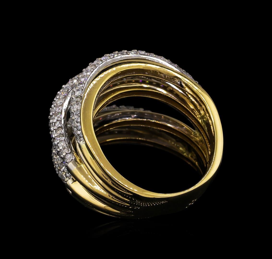 One electronically tested 14KT white and yellow gold lady's cast fashion ring with a tapered split shank with a bright polish finish. The featured lady's ring has a shank measuring 5.44 millimeters wide. Identified with markings of "K14". Condition is new, good workmanship. Containing: Two Hundred Fifty prong set round brilliant cut diamonds, measuring 1.40 - 1.10 x 0.75mm (depth est.) approximate total weight of 250 Stones = 1.74ct. Graded in the setting. Clarity: SI-1 to I-1. Color: H - I. Cut Good. Total Weight of Diamonds 1.74ct. Total Weight of Ring 10.60gm. GAS Appraised.