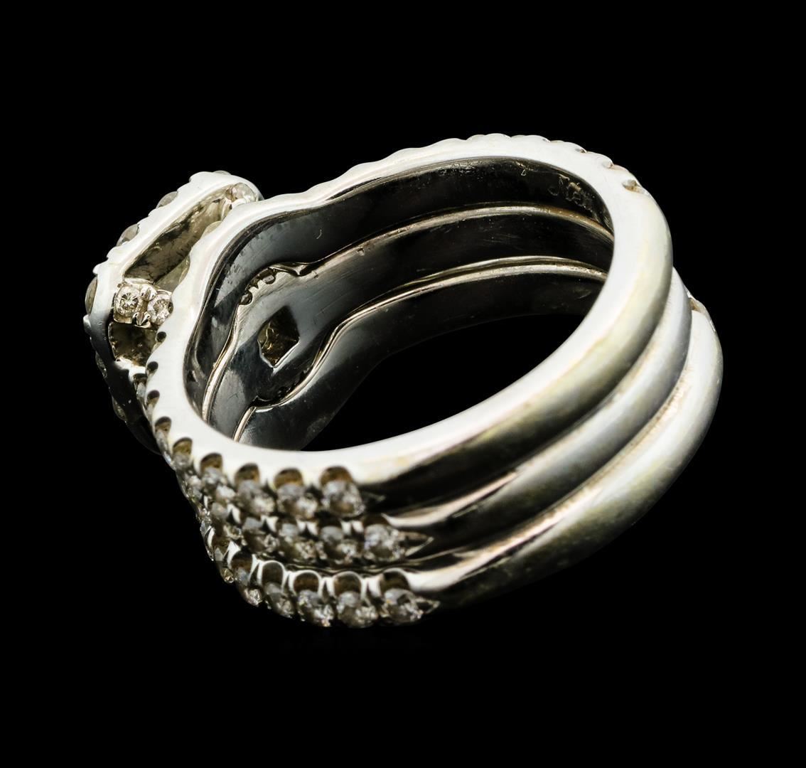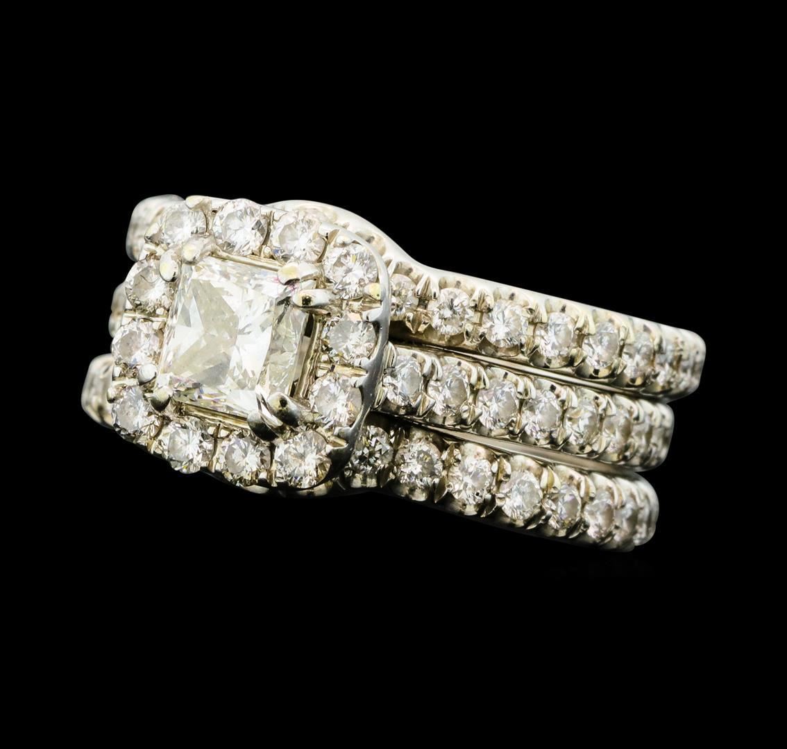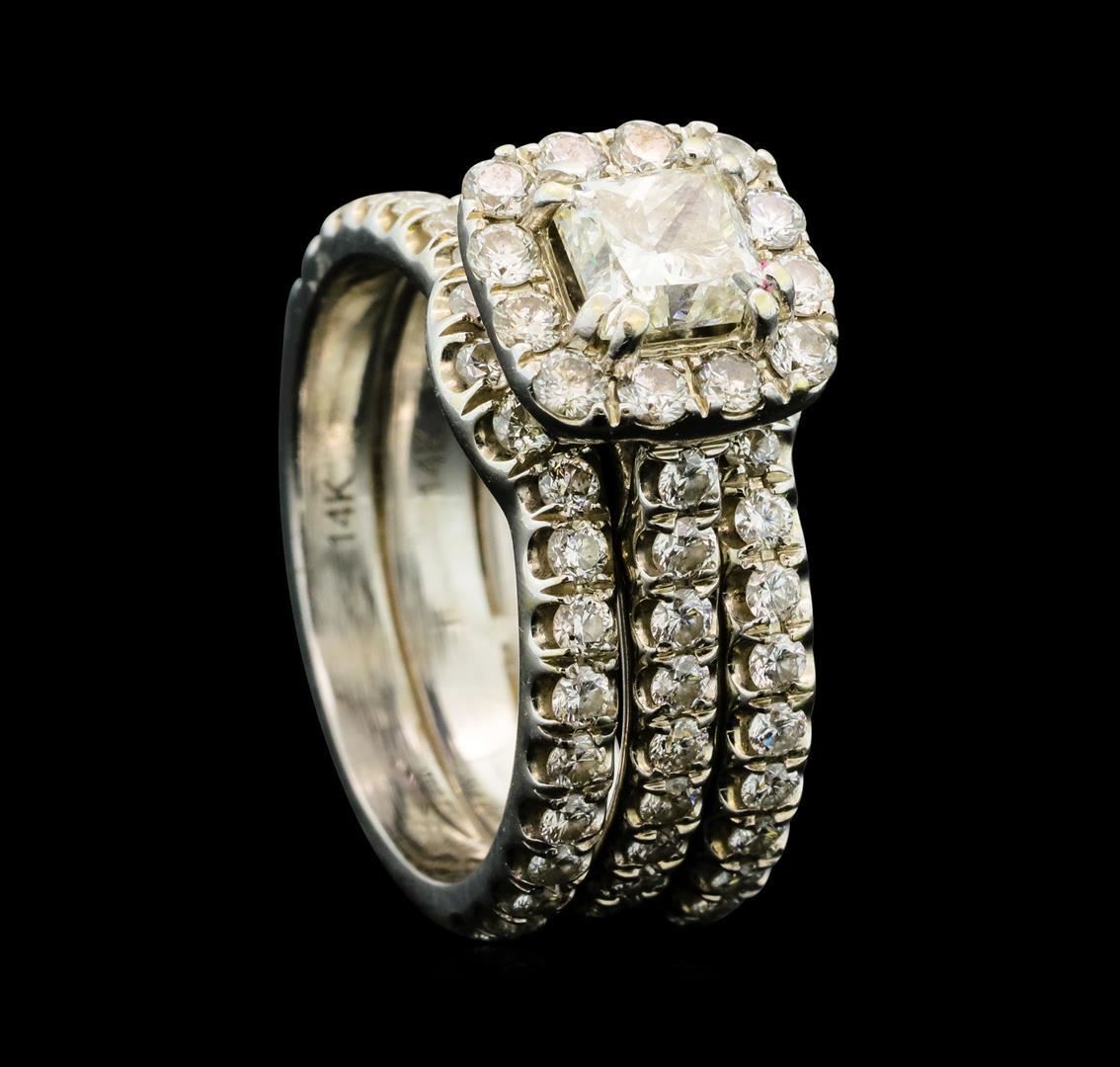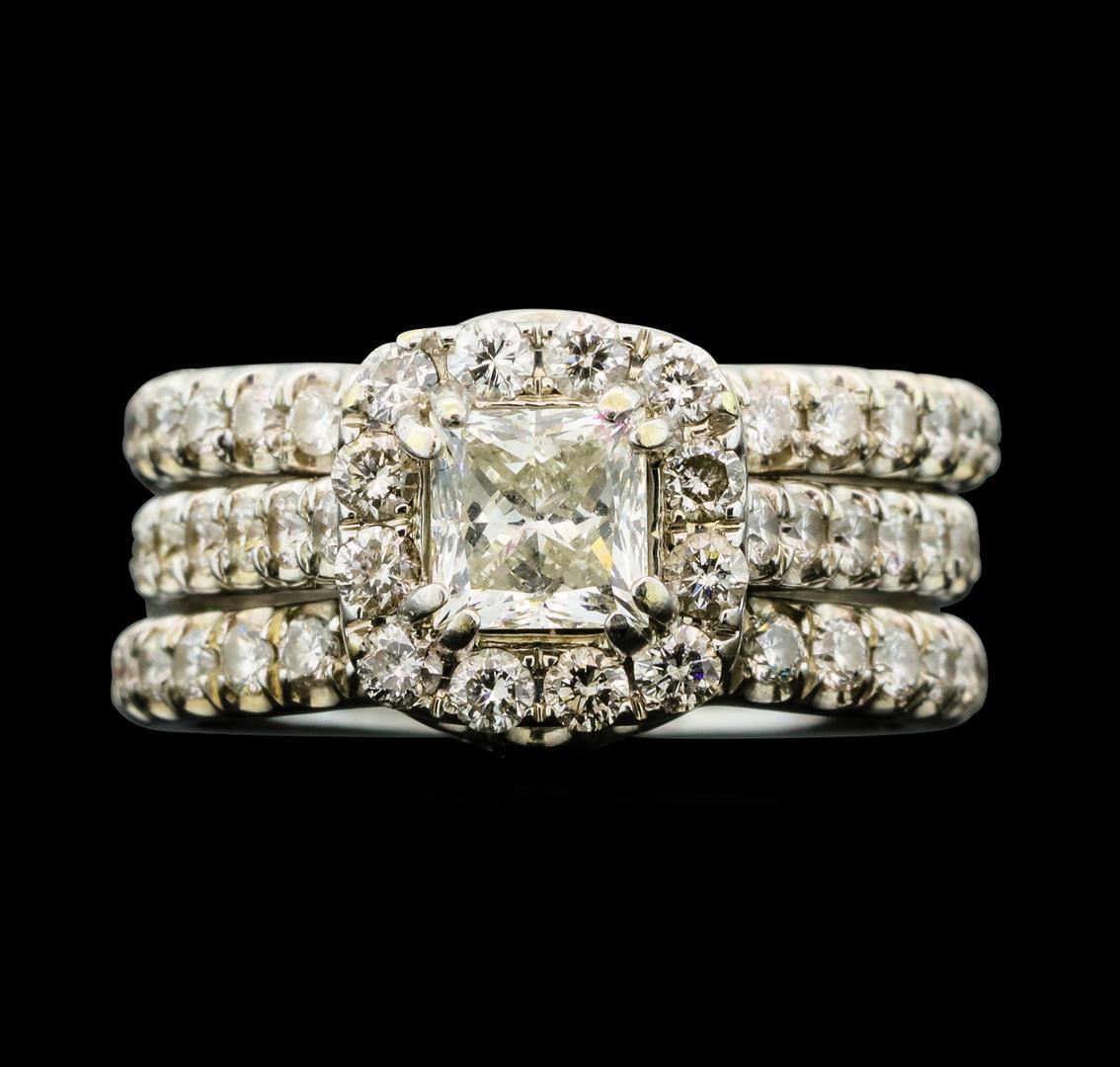 One set electronically tested 14KT white gold lady's combination cast & assembled wedding bands with a basket halo with a bright polish finish. The featured lady's wedding set has a triple shank measuring 7.42 millimeters wide. Trademark is Neil Lane. Identified with markings of '14K'. Condition is like new, good workmanship. Containing: One prong set princess cut diamond, measuring 4.90 x 4.80 x 3.65mm (depth est.) approximate weight of 0.75ct. Graded in the setting. Clarity SI-1. Color: I Cut Good Seventy-Eight prong set round brilliant cut diamonds, measuring 1.60 - 1.40 x 0.93mm (depth est.) approximate total weight of 78 Stones = 1.00ct. Graded in the setting. Clarity VS-2 to SI-1. Color: G - H Cut Good. Total Weight of Diamonds 1.75ct.. Total Weight of Bands 7.90gm. Designed by Neil Lane. GAS Appraised.
