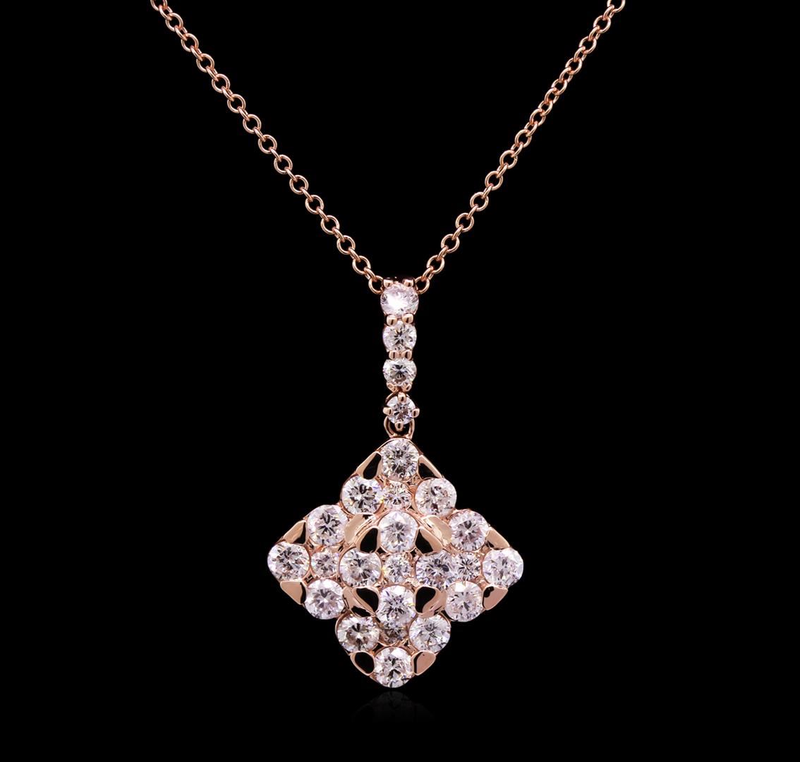 One electronically tested 14KT rose gold ladies cast & assembled diamond pendant and chain. The pendant features a square gallery of round brilliant diamonds completed by an elaborate under gallery and a diamond set bail. The pendant is supported an eighteen inch length 14KT rose gold designer style chain, terminating in a spring ring clasp. Bright polish finish. Identified with markings of "K14". Condition is new, good workmanship. Containing: Twenty-Five prong set round brilliant cut diamonds, measuring 2.90 - 2.00 x 1.47mm exact total weight 25 Stones = 1.75ct. Graded in the setting. Clarity: SI-2 to I-1. Color: G - H. Total Weight of Diamonds 1.75ct. Total Weight of Pendant And Chain 5.96gm. AIG Appraised at $6,005.00.