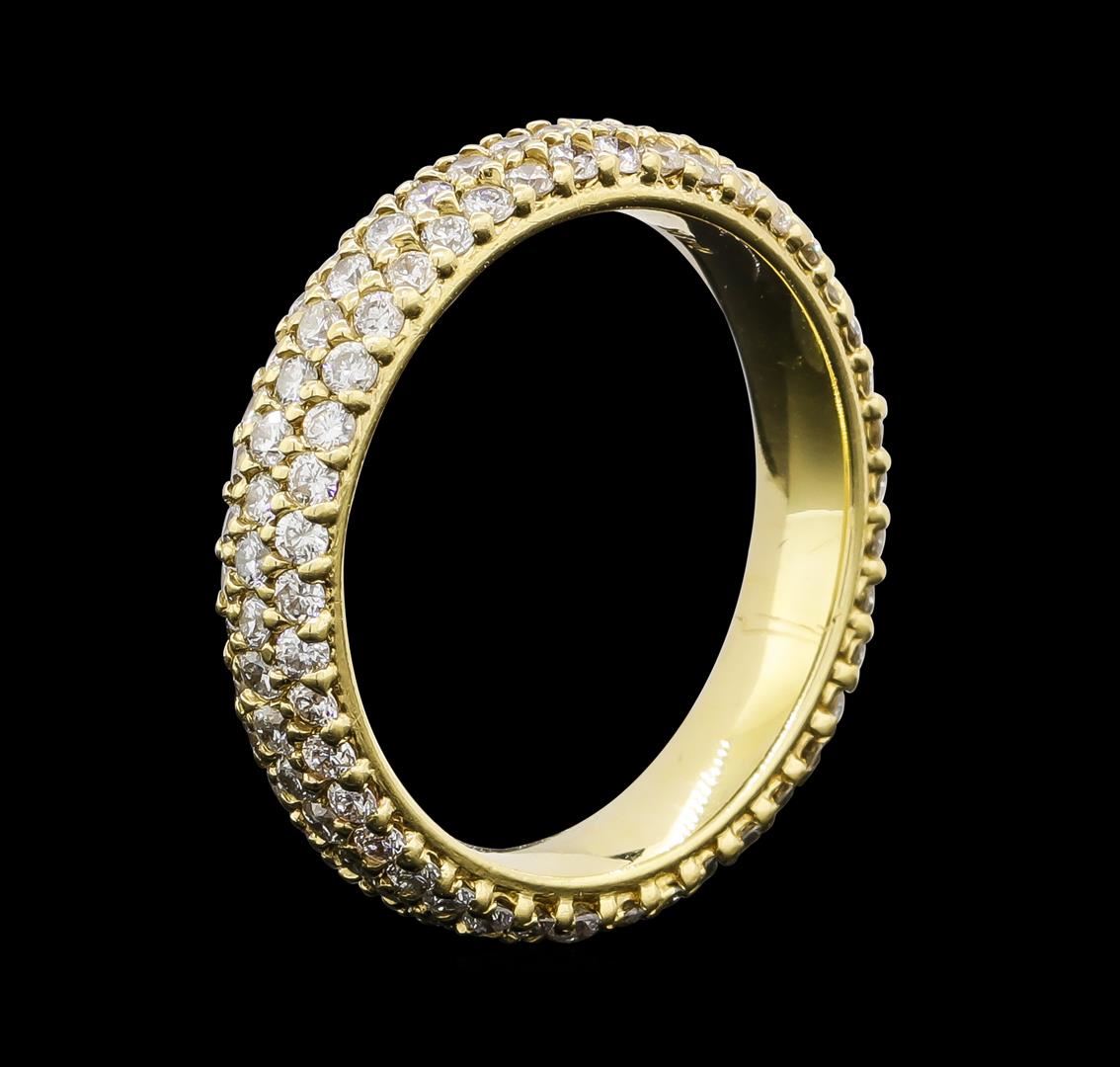 One electronically tested 14KT yellow gold lady's cast three row half dome eternity band with a bright polish finish. The featured lady's ring has a shank measuring 4.18 millimeters wide. Identified with markings of '14K'. Condition is new, good workmanship. Containing: One Hundred Twenty-Six prong set round brilliant cut diamonds, measuring 1.60 - 1.50 x 0.96mm (depth est.) approximate total weight of 126 Stones = 1.75ct. Graded in the setting. Clarity SI-1 to SI-3. Color: H - I Cut Good. Total Weight of Diamonds 1.75ct.. Total Weight of Band 4.50gm. GAS Appraised.