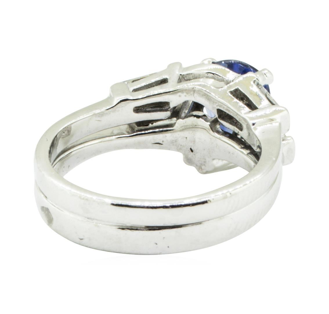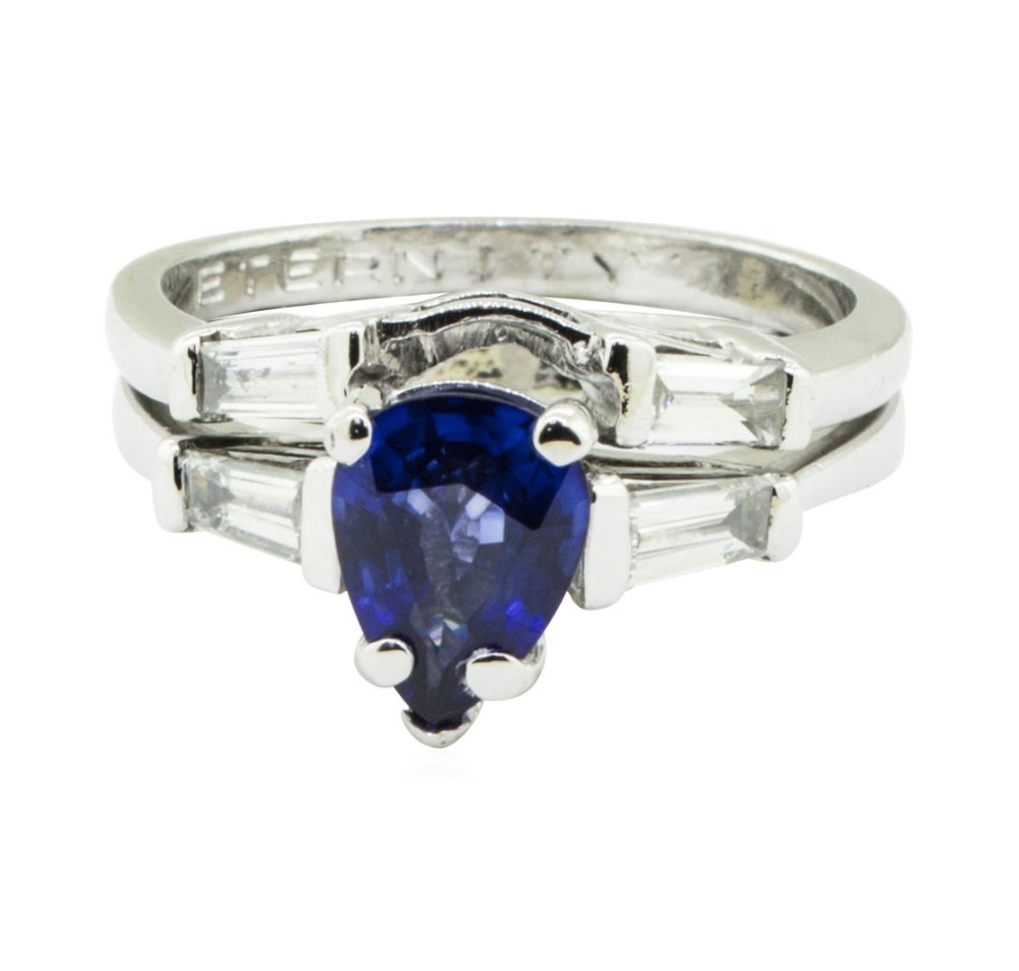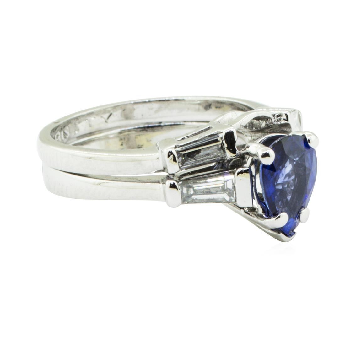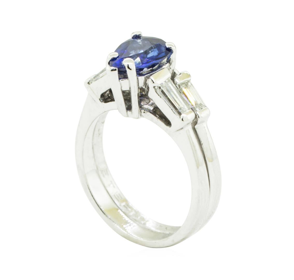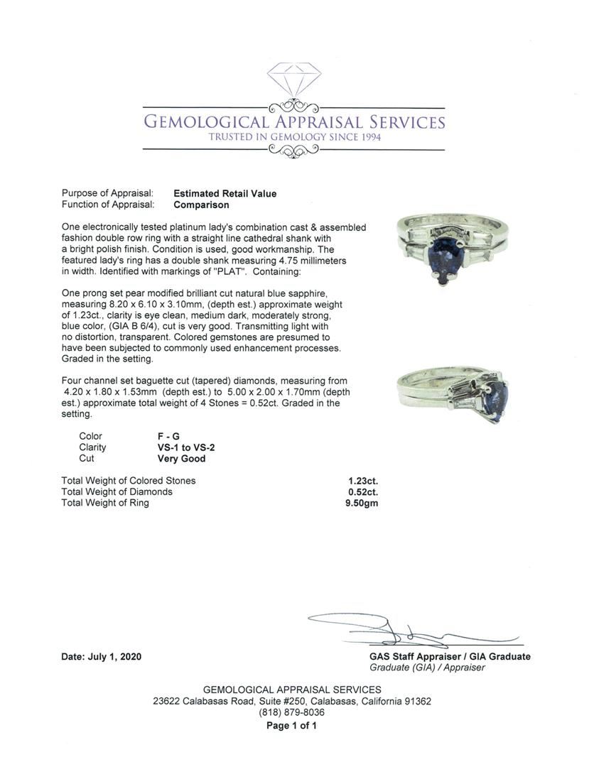 One electronically tested platinum lady's combination cast & assembled fashion double row ring with a straight line cathedral shank with a bright polish finish. The featured lady's ring has a double shank measuring 4.75 millimeters in width. Identified with markings of 'PLAT'. Condition is used, good workmanship. Containing: One prong set pear modified brilliant cut natural blue sapphire, measuring 8.20 x 6.10 x 3.10mm, (depth est.) approximate weight of 1.23ct., clarity is eye clean, medium dark, moderately strong, blue color, (GIA B 6/4), cut is very good. Transmitting light with no distortion, transparent. Colored gemstones are presumed to have been subjected to commonly used enhancement processes. Graded in the setting. Four channel set baguette cut (tapered) diamonds, measuring from 4.20 x 1.80 x 1.53mm (depth est.) to 5.00 x 2.00 x 1.70mm (depth est.) approximate total weight of 4 Stones = 0.52ct. Graded in the setting. Color F - G Clarity VS-1 to VS-2 Cut Very Good. Total Weight of Colored Stones 1.23ct.. Total Weight of Diamonds 0.52ct.. Total Weight of Ring 9.50gm GAS Appraised at $4460.00. GAS Appraised.