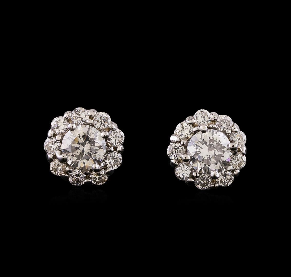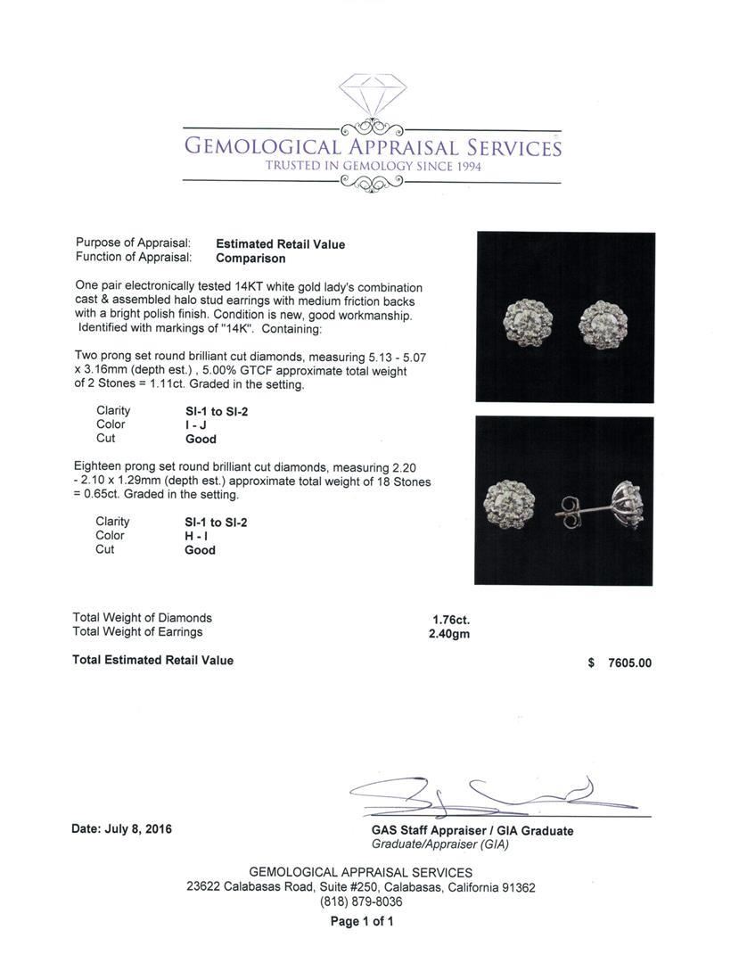 One pair electronically tested 14KT white gold lady's combination cast & assembled halo stud earrings with medium friction backs with a bright polish finish. Identified with markings of "14K". Condition is new, good workmanship. Containing: Two prong set round brilliant cut diamonds, measuring 5.13 - 5.07 x 3.16mm (depth est.), 5.00.%. GTCF approximate total weight of 2 Stones = 1.11ct. Graded in the setting. Clarity: SI-1 to SI-2. Color: I - Good Eighteen prong set round brilliant cut diamonds, measuring 2.20 - 2.10 x 1.29mm (depth est.) approximate total weight of 18 Stones = 0.65ct. Graded in the setting. Clarity: SI-1 to SI-2. Color: H - I. Cut Good. Total Weight of Diamonds 1.76ct. Total Weight of Earrings 2.40gm. GAS Appraised.