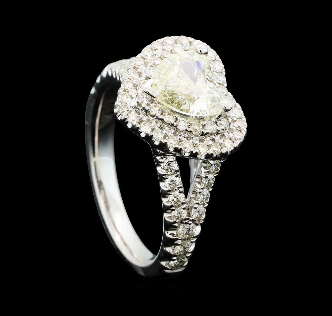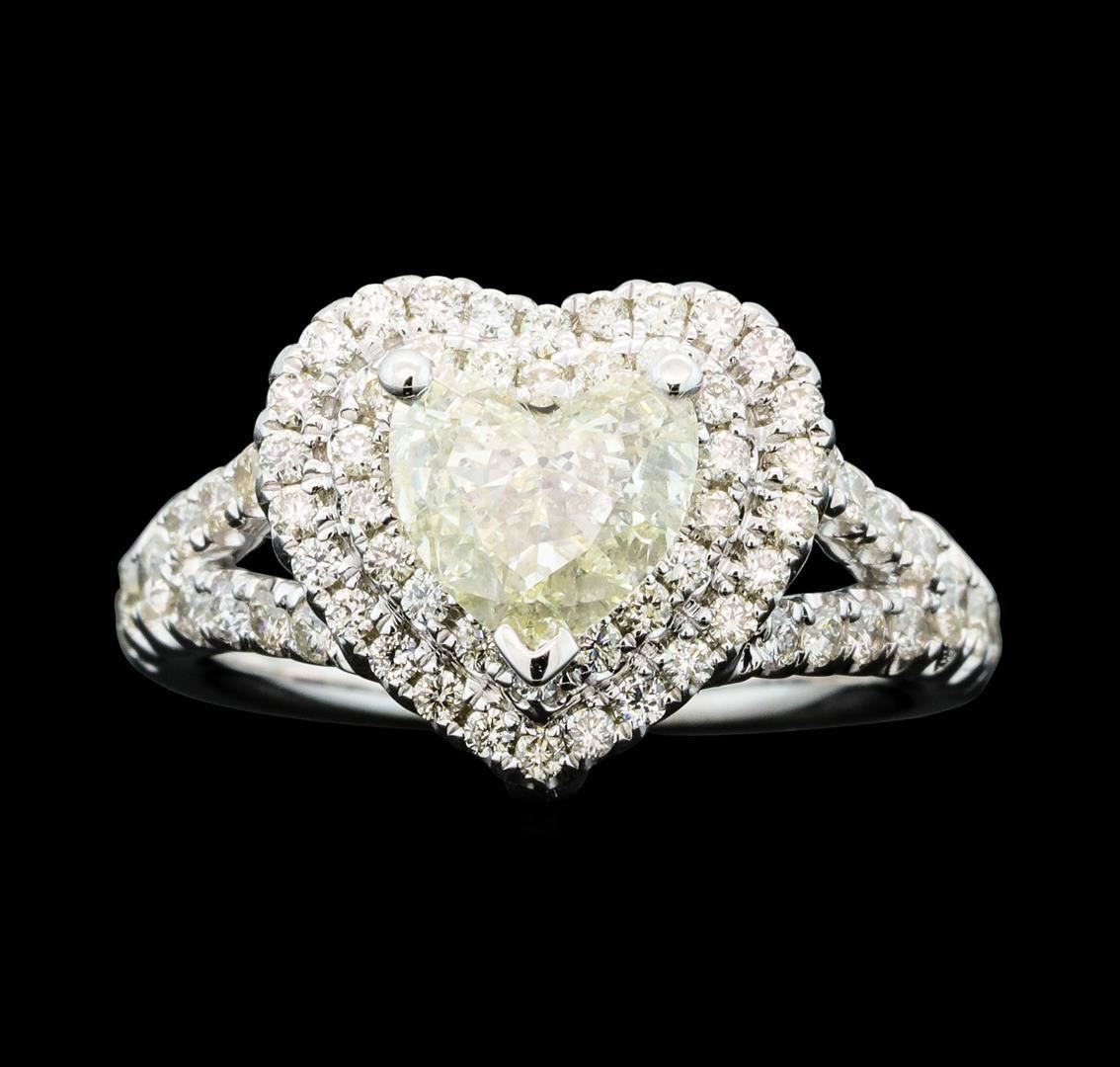 One electronically tested 14KT white gold lady's cast fashion heart shape ring with a split shank double halo with a bright polish finish. The featured lady's ring has a shank measuring 2.40 millimeters wide. Identified with markings of '14K'. Condition is new, good workmanship. Containing: One prong set heart shaped cut diamond, measuring 7.30 x 6.90 x 2.93mm (depth est.) , 10.00.%. GTCF approximate weight of 0.96ct. Graded in the setting. Clarity SI-2. Color: J - K Cut Good Six prong set round brilliant cut diamonds, measuring 2.10 - 2.00 x 1.27mm (depth est.) approximate total weight of 6 Stones = 0.20ct. Graded in the setting. Clarity SI-1 to SI-2. Color: H - I Cut Very Good Sixteen prong set round brilliant cut diamonds, measuring 1.70 - 1.60 x 1.02mm (depth est.) approximate total weight of 16 Stones = 0.27ct. Graded in the setting. Clarity SI-1 to SI-2. Color: H - I Cut Very Good Forty-Four prong set round brilliant cut diamonds, measuring 1.30 - 1.20 x 0.78mm (depth est.) approximate total weight of 44 Stones = 0.33ct. Graded in the setting. Clarity SI-1 to SI-2. Color: G - I Cut Very Good. Total Weight of Diamonds 1.76ct.. Total Weight of Ring 5.70gm. GAS Appraised.