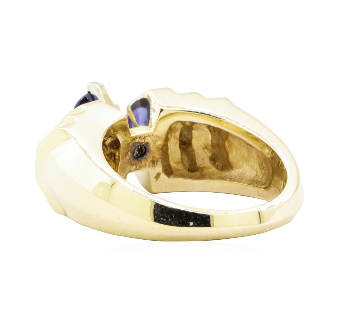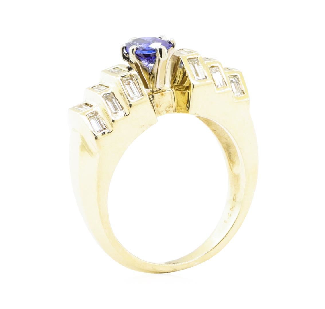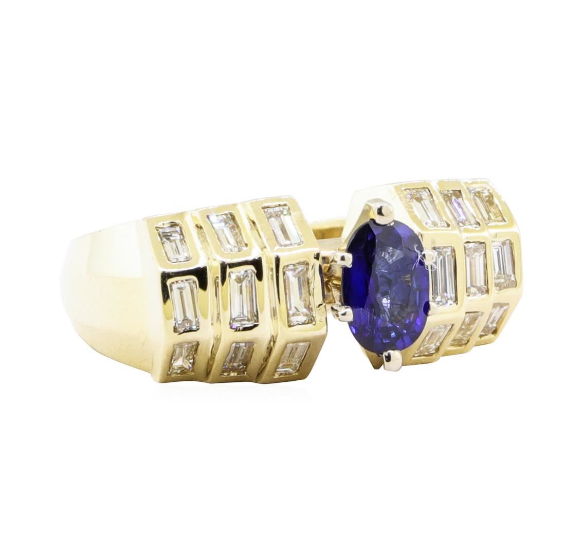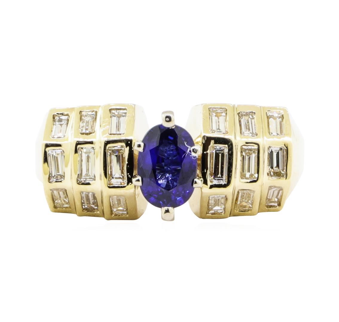 One electronically tested 14KT yellow gold lady's combination cast & assembled fashion ring with a tapered knife edge shank with a bright polish finish. The featured lady's ring has rasied shoulders and a shank measuring 2.60 millimeters wide. Identified with markings of '14KP'. Condition is Good. Containing: One prong set oval modified mixed cut natural blue sapphire, measuring 6.90 x 4.91 x 3.00mm, (depth est.) approximate weight of 0.86ct., clarity is eye clean, medium dark, moderately strong, blue color, (GIA B 6/4), cut is good. Transmitting light with no distortion, transparent. Colored gemstones are presumed to have been subjected to commonly used enhancement processes. Graded in the setting. Eighteen bezel set baguette cut diamonds, measuring from 2.80 x 1.40 x 1.19mm (depth est.) to 3.30 x 1.50 x 1.28mm (depth est.) approximate total weight of 18 Stones = 0.90ct. Graded in the setting. Color G - H Clarity VS-1 to VS-2 Cut Very Good. Total Weight of Colored Stones 0.86ct.. Total Weight of Diamonds 0.90ct.. Total Weight of Ring 12.60gm GAS Appraised at $5555.00. GAS Appraised.
