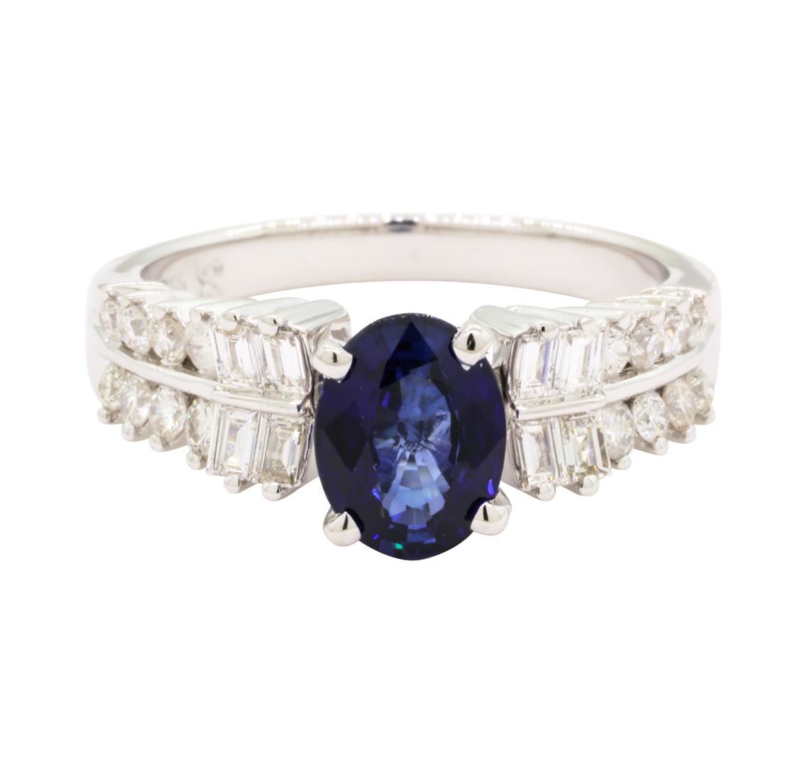 One electronically tested 18KT white gold lady's combination cast & assembled fashion ring with a tapered cathedral shank with a bright polish finish. The featured lady's ring has a shank measuring 2.40 millimeters wide. Identified with markings of '750'. Condition is new, good workmanship. Containing: One prong set oval modified mixed cut natural blue sapphire, measuring 7.95 x 6.03 x 3.40mm, (depth est.) approximate weight of 1.37ct., clarity is eye clean, medium dark, very slightly grayish, blue color, (GIA B 6/3), cut is good. Transmitting light with no distortion, transparent. Colored gemstones are presumed to have been subjected to commonly used enhancement processes. Graded in the setting. Eight channel and prong set baguette cut diamonds, measuring from 2.25 x 1.60 x 1.36mm (depth est.) to 2.30 x 1.75 x 1.49mm (depth est.) approximate total weight of 8 Stones = 0.40ct. Graded in the setting. Color H - I Clarity VS-1 to VS-2 Cut Very Good Sixteen channel and prong set round brilliant cut diamonds, measuring 1.60 - 1.40 x 0.90mm (depth est.) approximate total weight of 16 Stones = 0.19ct. Graded in the setting. Color H - I Clarity SI-1 to SI-2 Cut Good. Total Weight of Colored Stones 1.37ct.. Total Weight of Diamonds 0.59ct.. Total Weight of Ring 5.00gm GAS Appraised at $3640.00. GAS Appraised.
