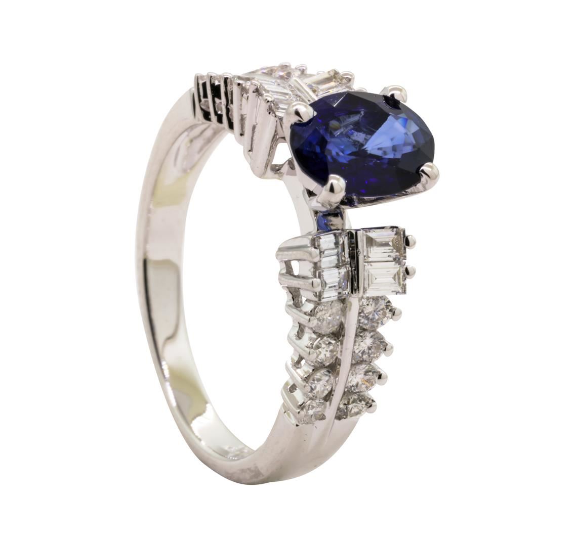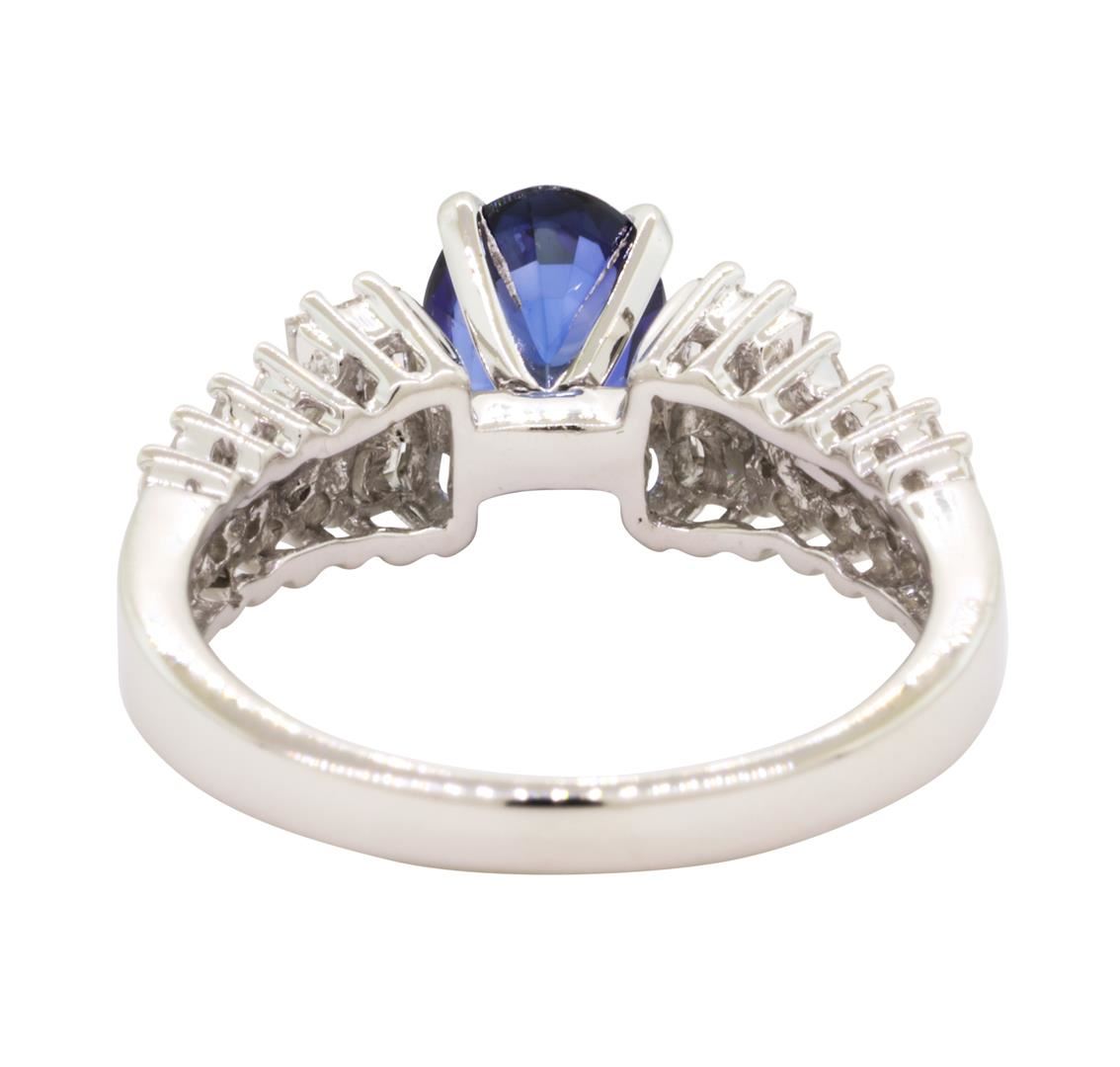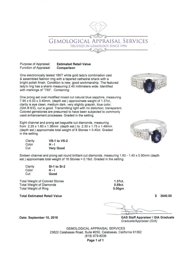 One electronically tested 18KT white gold lady's combination cast & assembled fashion ring with a tapered cathedral shank with a bright polish finish. The featured lady's ring has a shank measuring 2.40 millimeters wide. Identified with markings of '750'. Condition is new, good workmanship. Containing: One prong set oval modified mixed cut natural blue sapphire, measuring 7.95 x 6.03 x 3.40mm, (depth est.) approximate weight of 1.37ct., clarity is eye clean, medium dark, very slightly grayish, blue color, (GIA B 6/3), cut is good. Transmitting light with no distortion, transparent. Colored gemstones are presumed to have been subjected to commonly used enhancement processes. Graded in the setting. Eight channel and prong set baguette cut diamonds, measuring from 2.25 x 1.60 x 1.36mm (depth est.) to 2.30 x 1.75 x 1.49mm (depth est.) approximate total weight of 8 Stones = 0.40ct. Graded in the setting. Color H - I Clarity VS-1 to VS-2 Cut Very Good Sixteen channel and prong set round brilliant cut diamonds, measuring 1.60 - 1.40 x 0.90mm (depth est.) approximate total weight of 16 Stones = 0.19ct. Graded in the setting. Color H - I Clarity SI-1 to SI-2 Cut Good. Total Weight of Colored Stones 1.37ct.. Total Weight of Diamonds 0.59ct.. Total Weight of Ring 5.00gm GAS Appraised at $3640.00. GAS Appraised.