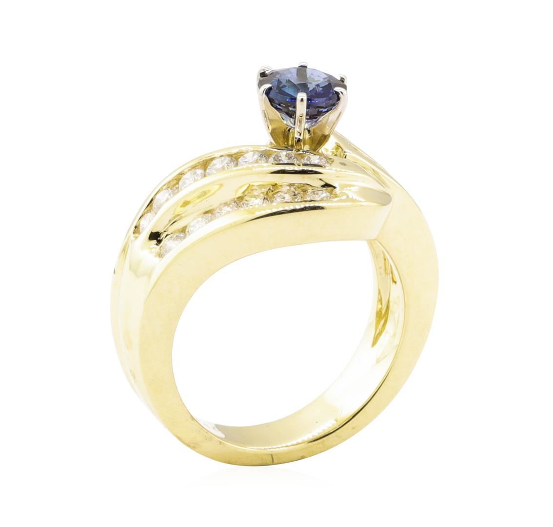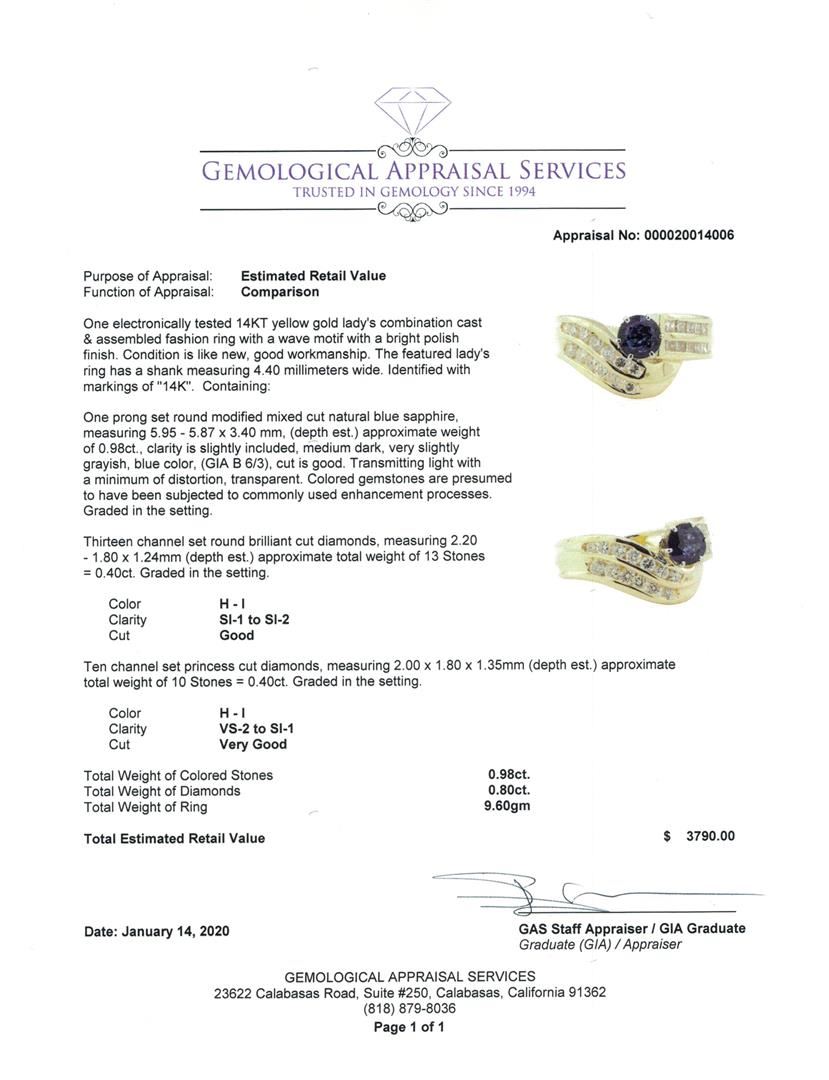 One electronically tested 14KT yellow gold lady's combination cast & assembled fashion ring with a wave motif with a bright polish finish. The featured lady's ring has a shank measuring 4.40 millimeters wide. Identified with markings of '14K'. Condition is like new, good workmanship. Containing: One prong set round modified mixed cut natural blue sapphire, measuring 5.95 - 5.87 x 3.40 mm, (depth est.) approximate weight of 0.98ct., clarity is slightly included, medium dark, very slightly grayish, blue color, (GIA B 6/3), cut is good. Transmitting light with a minimum of distortion, transparent. Colored gemstones are presumed to have been subjected to commonly used enhancement processes. Graded in the setting. Thirteen channel set round brilliant cut diamonds, measuring 2.20 - 1.80 x 1.24mm (depth est.) approximate total weight of 13 Stones = 0.40ct. Graded in the setting. Color H - I Clarity SI-1 to SI-2 Cut Good Ten channel set princess cut diamonds, measuring 2.00 x 1.80 x 1.35mm (depth est.) approximate total weight of 10 Stones = 0.40ct. Graded in the setting. Color H - I Clarity VS-2 to SI-1 Cut Very Good. Total Weight of Colored Stones 0.98ct.. Total Weight of Diamonds 0.80ct.. Total Weight of Ring 9.60gm GAS Appraised at $3790.00. GAS Appraised.