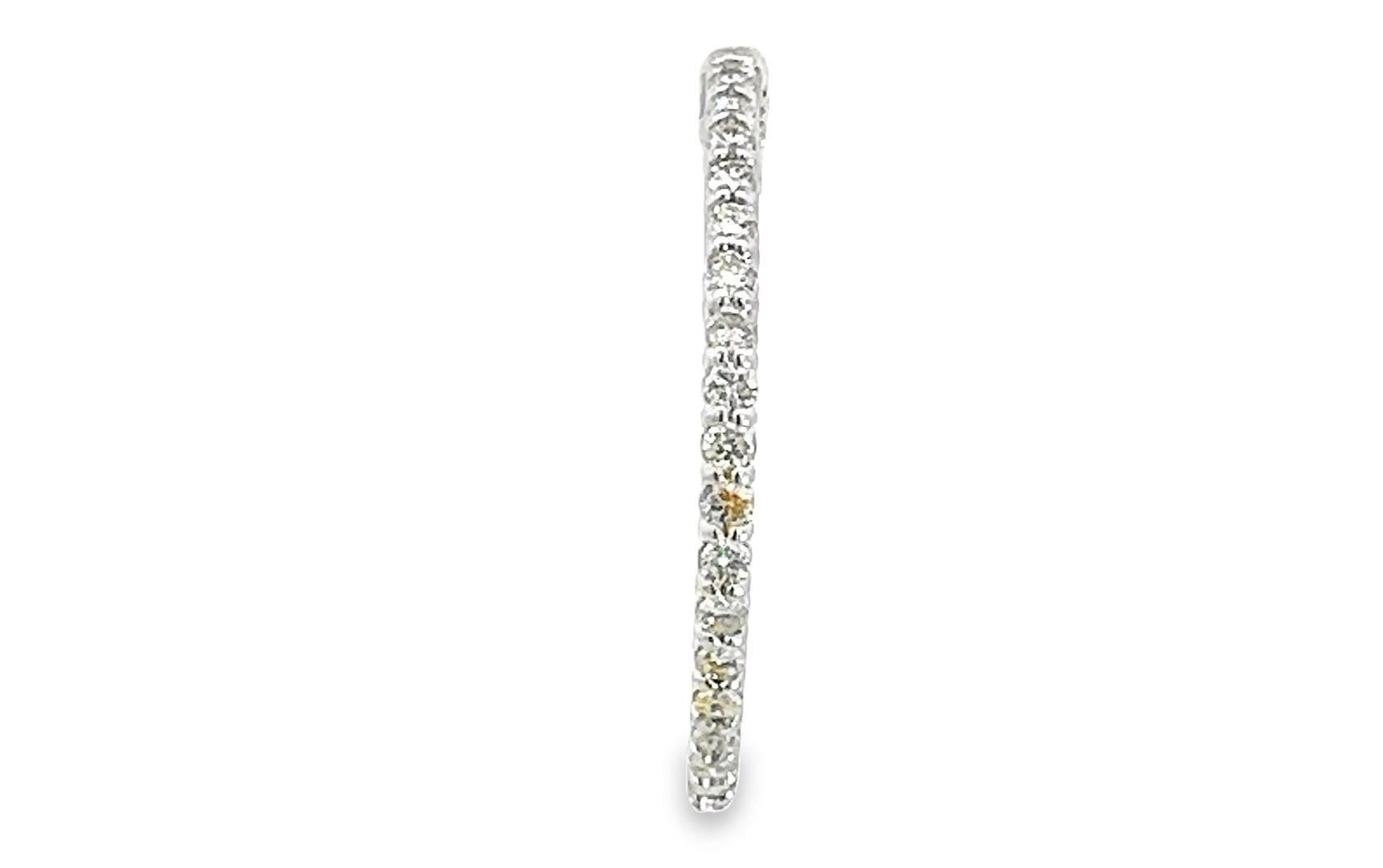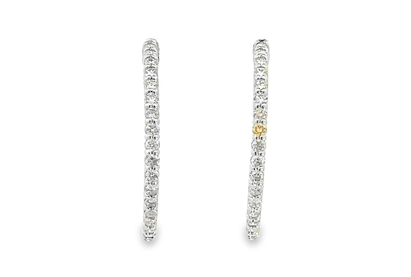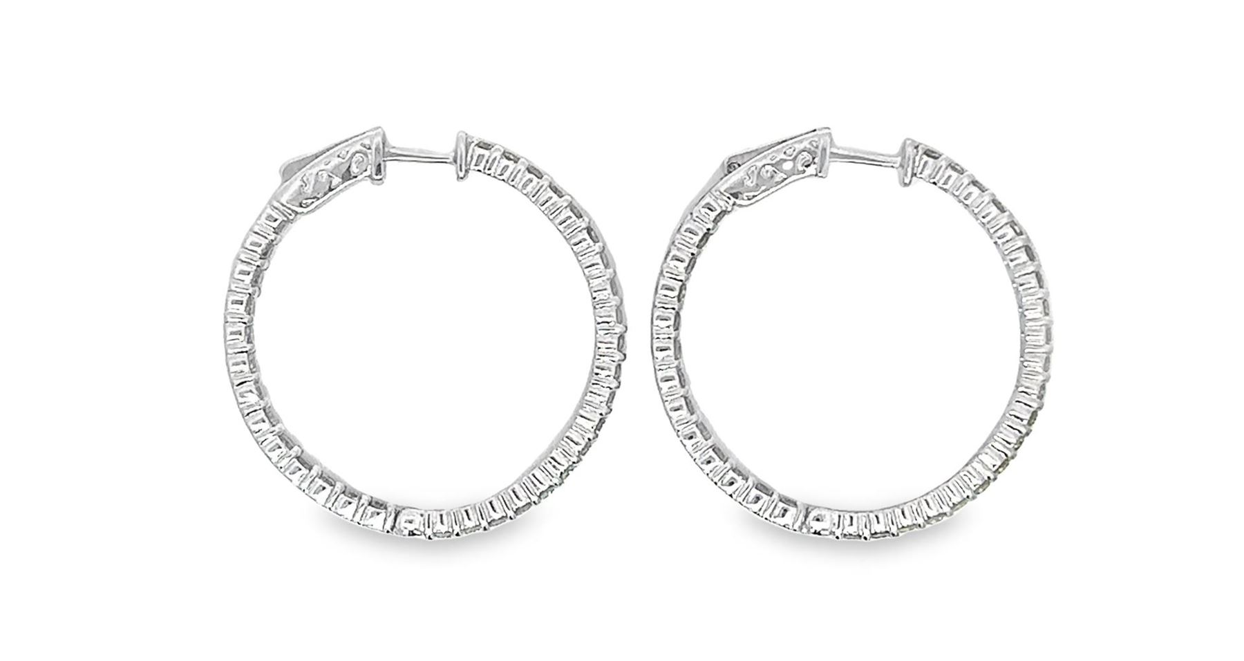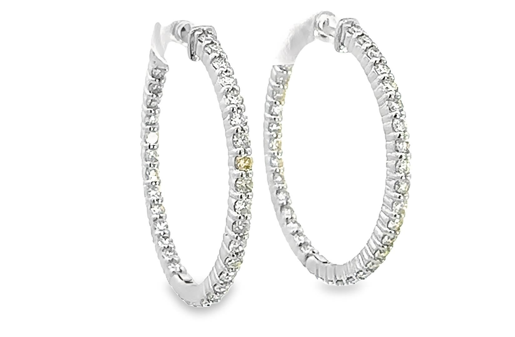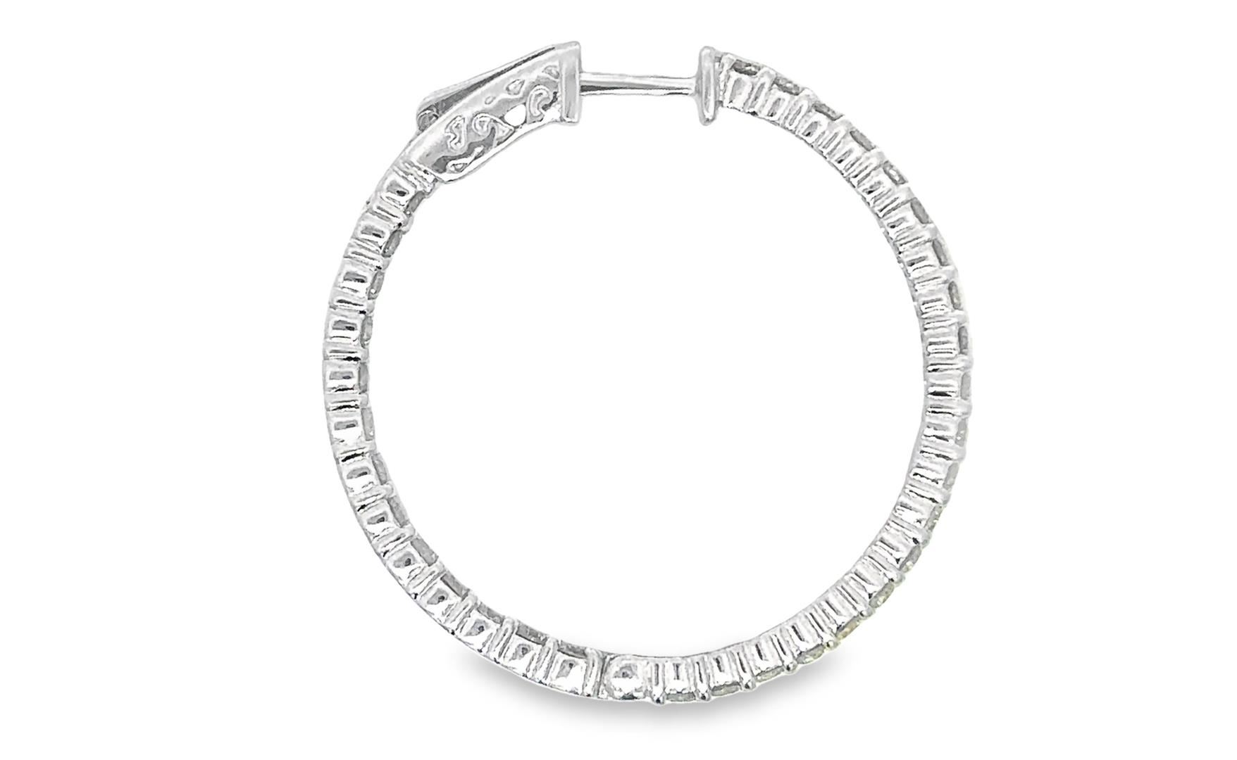 One pair electronically tested 14KT white gold lady's combination cast & assembled fashion inside-out hoop earrings with a bright polish finish. The featured hoop earring has a diameter of 30 millimeter. Identified with markings of "14K". Condition is new, good workmanship. Containing: Sixty-Six prong set round brilliant cut diamonds, measuring 1.90 - 1.85 x 1.22mm (depth est.) approximate total weight of 66 Stones = 1.80ct. Graded in the setting. Color I - J Clarity VS-2 to SI-1 Cut Very Good Total Weight of Diamonds 1.80ct. Total Weight of Earrings 7.40gm Estimated Retail Value $ 7140.00