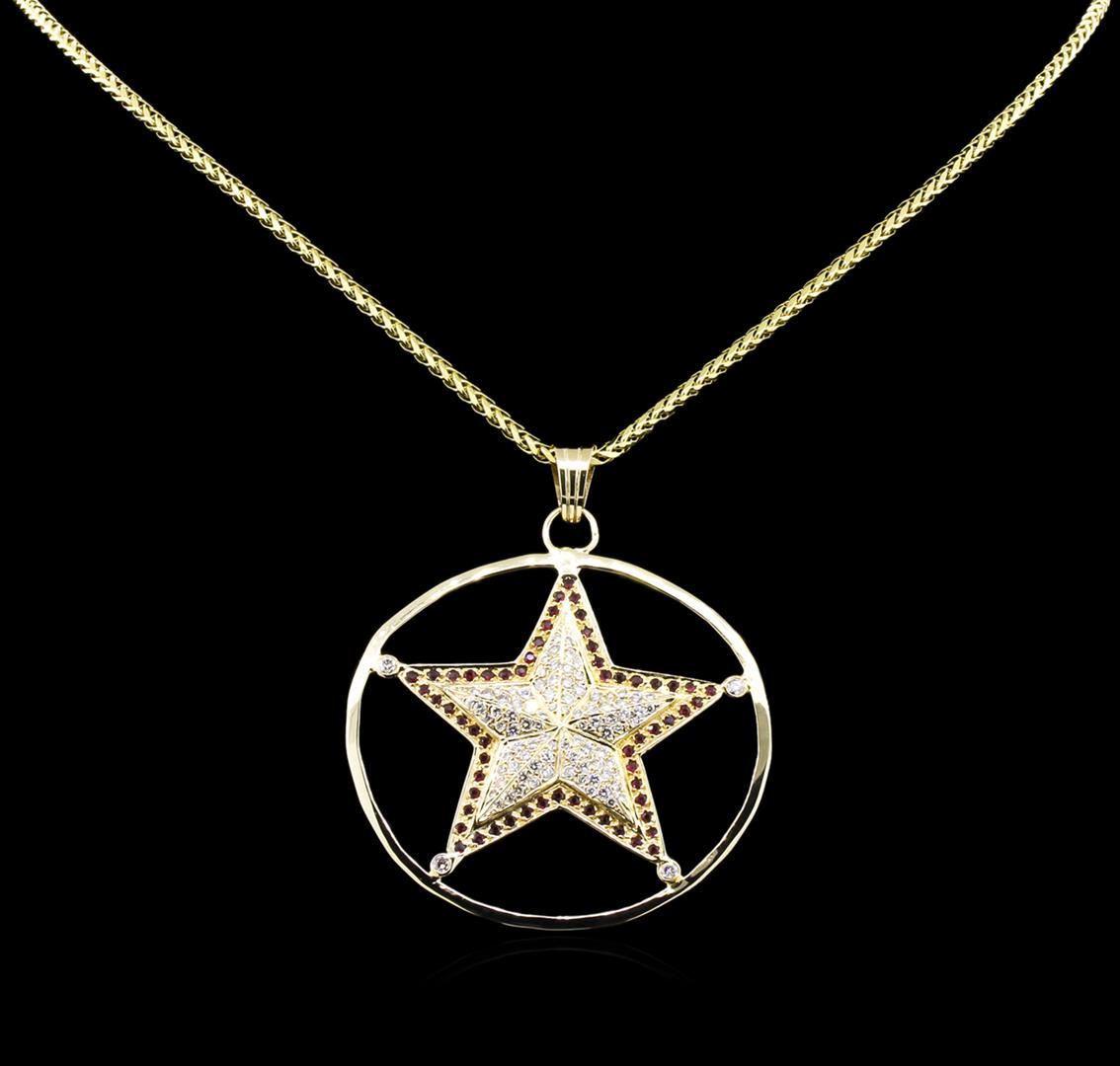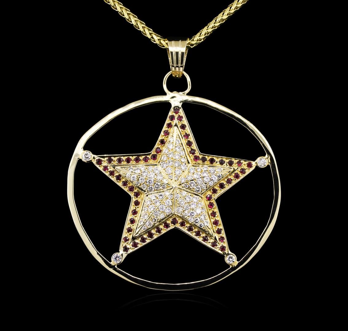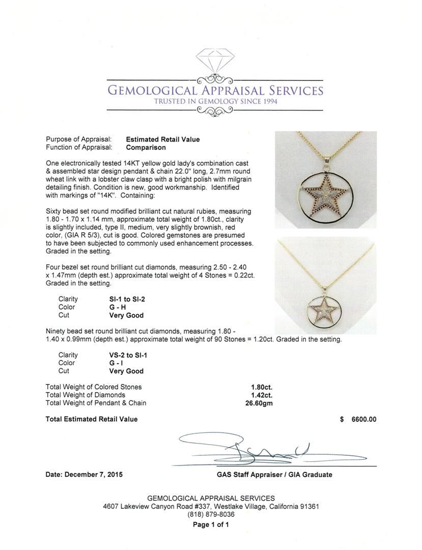 One electronically tested 14KT yellow gold lady's combination cast & assembled star design pendant & chain 22.0" long, 2.7mm round wheat link with a lobster claw clasp with a bright polish with milgrain detailing finish. Identified with markings of "14K". Condition is new, good workmanship. Containing: Sixty bead set round modified brilliant cut natural rubies, measuring 1.80 - 1.70 x 1.14 mm, approximate total weight of 1.80ct., clarity is slightly included, type II, medium, very slightly brownish, red color, (GIA R 5/3), cut is good. Colored gemstones are presumed to have been subjected to commonly used enhancement processes. Graded in the setting. Four bezel set round brilliant cut diamonds, measuring 2.50 - 2.40 x 1.47mm (depth est.) approximate total weight of 4 Stones = 0.22ct. Graded in the setting. Clarity: SI-1 to SI-2. Color: G - Very Good Ninety bead set round brilliant cut diamonds, measuring 1.80 - 1.40 x 0.99mm (depth est.) approximate total weight of 90 Stones = 1.20ct. Graded in the setting. Clarity: VS-2 to SI-1. Color: G - I. Cut Very Good. Total Weight of Colored Stones 1.80ct. Total Weight of Diamonds 1.42ct. Total Weight of Pendant & Chain 26.60gm. GAS Appraised at $6,600.00.