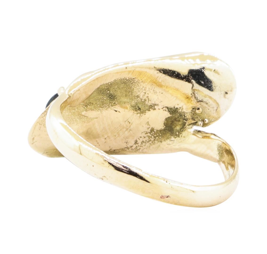 One ring with a bypass floral motif featuring: 14KT yellow gold weighing 4.6 grams containing two blue sapphires weighing 1.80ctw.