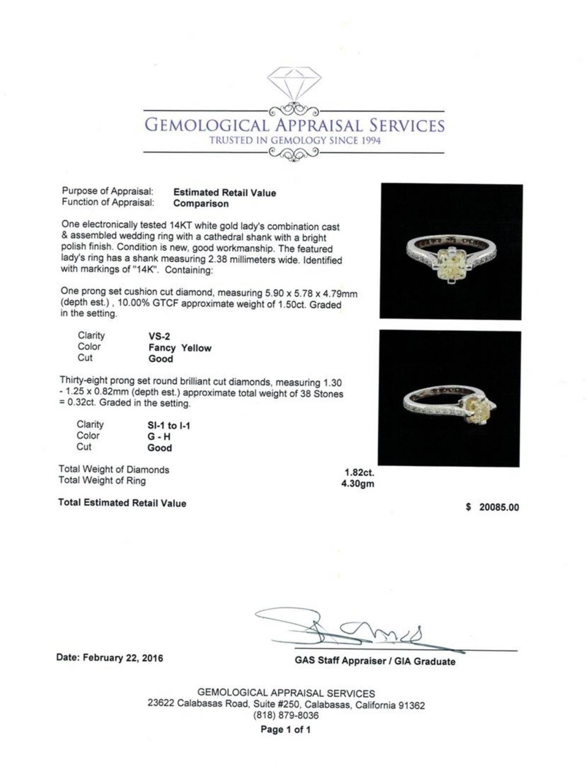 One electronically tested 14KT white gold lady's combination cast & assembled wedding ring with a cathedral shank with a bright polish finish. The featured lady's ring has a shank measuring 2.38 millimeters wide. Identified with markings of "14K". Condition is new, good workmanship. Containing: One prong set cushion cut diamond, measuring 5.90 x 5.78 x 4.79mm (depth est.) , 10.00.%. GTCF approximate weight of 1.50ct. Graded in the setting. Clarity: VS-2 Cut Good Thirty-Eight prong set round brilliant cut diamonds, measuring 1.30 - 1.25 x 0.82mm (depth est.) approximate total weight of 38 Stones = 0.32ct. Graded in the setting. Clarity: SI-1 to I-1. Color: G - H. Cut Good. Total Weight of Diamonds 1.82ct. Total Weight of Ring 4.30gm. GAS Appraised at $20,085.00.