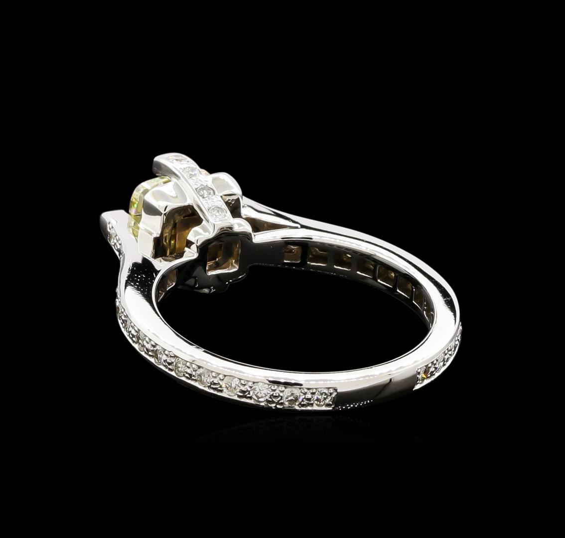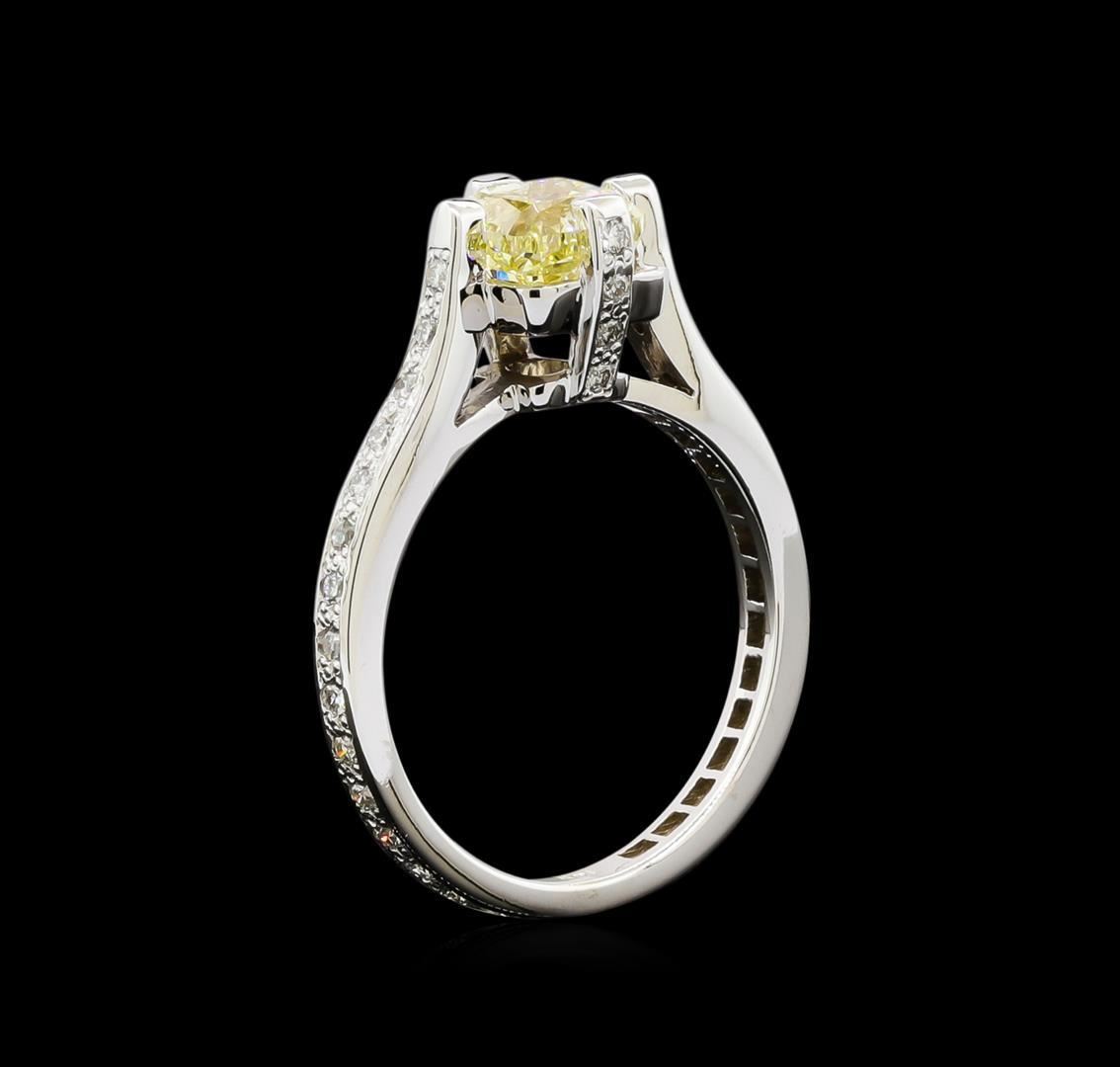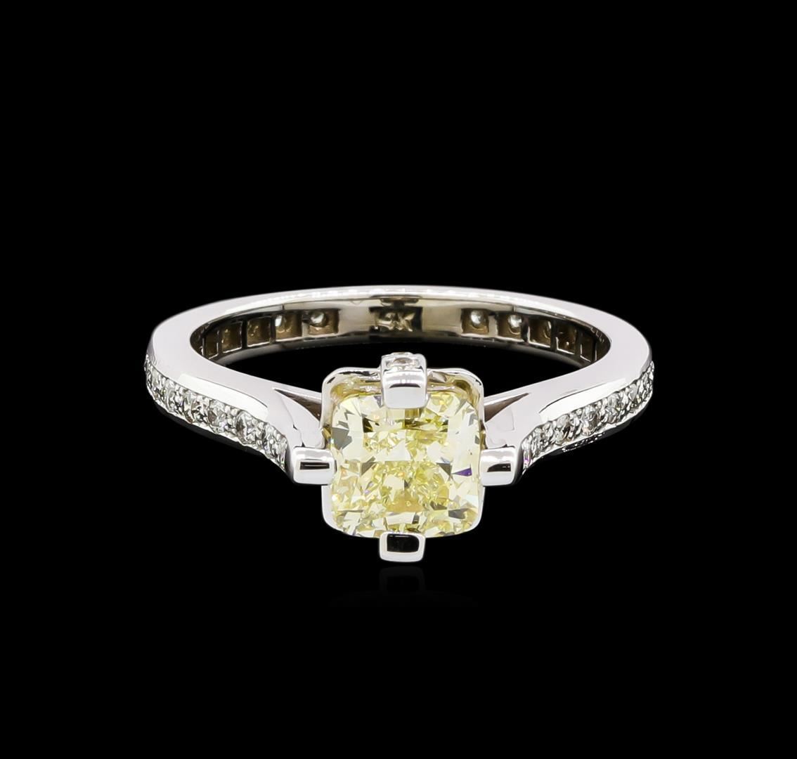 One electronically tested 14KT white gold lady's combination cast & assembled wedding ring with a cathedral shank with a bright polish finish. The featured lady's ring has a shank measuring 2.38 millimeters wide. Identified with markings of "14K". Condition is new, good workmanship. Containing: One prong set cushion cut diamond, measuring 5.90 x 5.78 x 4.79mm (depth est.) , 10.00.%. GTCF approximate weight of 1.50ct. Graded in the setting. Clarity: VS-2 Cut Good Thirty-Eight prong set round brilliant cut diamonds, measuring 1.30 - 1.25 x 0.82mm (depth est.) approximate total weight of 38 Stones = 0.32ct. Graded in the setting. Clarity: SI-1 to I-1. Color: G - H. Cut Good. Total Weight of Diamonds 1.82ct. Total Weight of Ring 4.30gm. GAS Appraised.