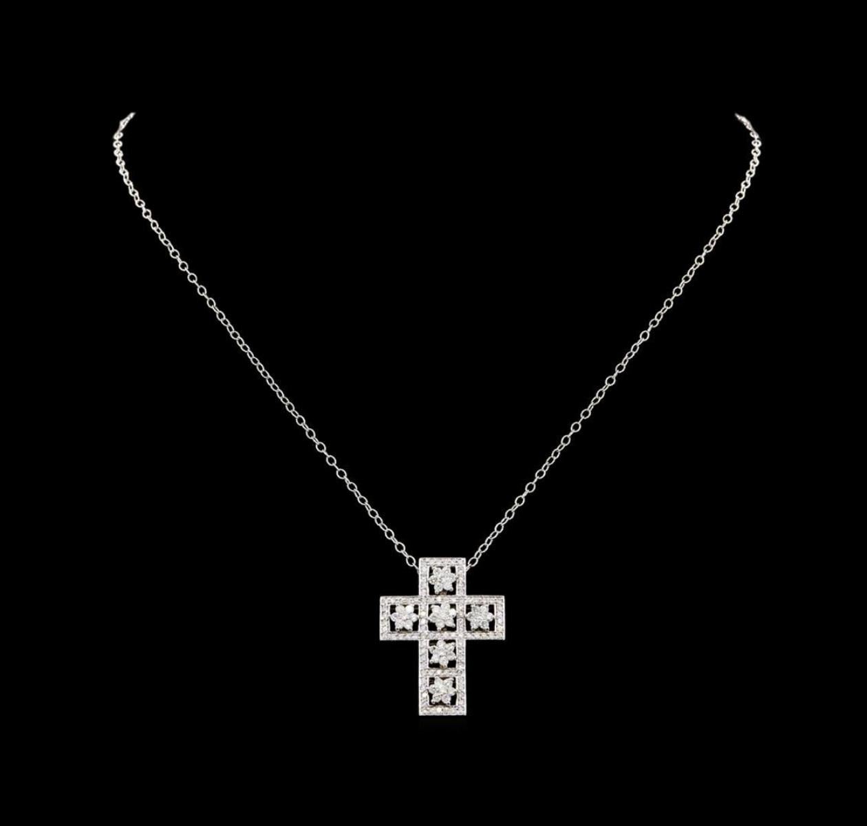 One electronically tested 14KT white gold lady's combination cast & assembled cross pendant & chain 18.0' long, 2.0mm twisted oval cable link with a lobster claw clasp with a bright polish finish. Identified with markings of '14K'. Condition is new, good workmanship. Containing: Forty-Two prong set round brilliant cut diamonds, measuring 1.95 - 1.85 x 1.18mm (depth est.) approximate total weight of 42 Stones = 1.10ct. Graded in the setting. Clarity SI-1 to SI-2. Color: H - I Cut Good Ninety prong set round brilliant cut diamonds, measuring 1.35 - 1.25 x 0.79mm (depth est.) approximate total weight of 90 Stones = 0.73ct. Graded in the setting. Clarity SI-1 to SI-2. Color: H - I Cut Good. Total Weight of Diamonds 1.83ct.. Total Weight of Pendant & Chain 15.20gm. GAS Appraised.
