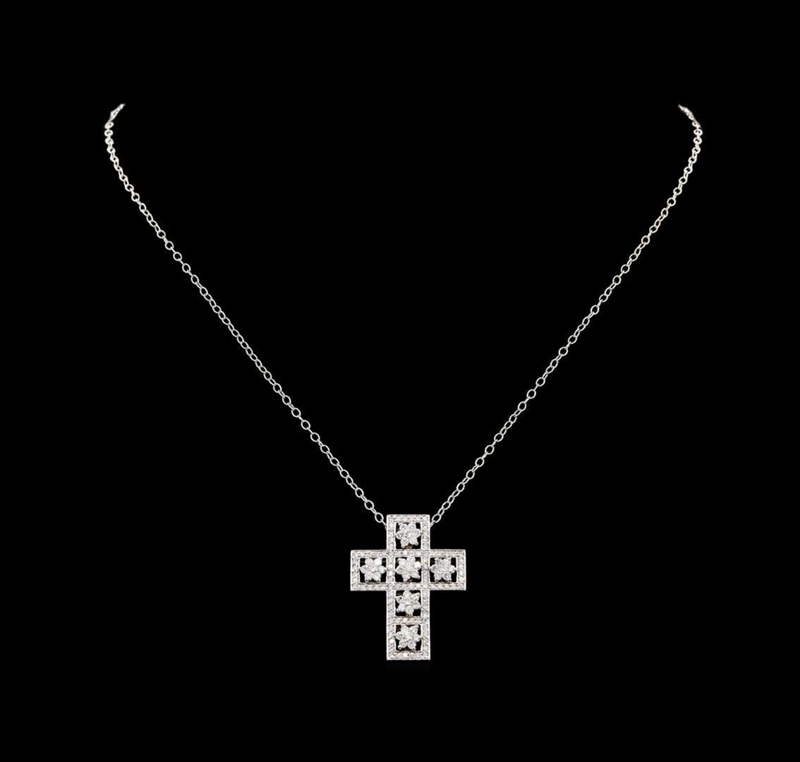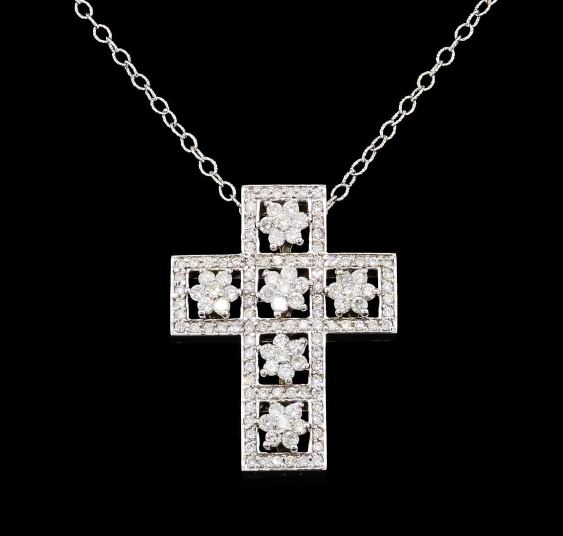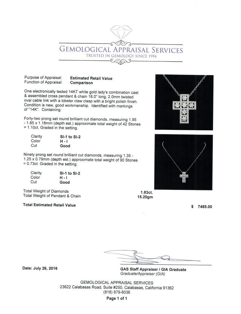 One electronically tested 14KT white gold lady's combination cast & assembled cross pendant & chain 18.0' long, 2.0mm twisted oval cable link with a lobster claw clasp with a bright polish finish. Identified with markings of '14K'. Condition is new, good workmanship. Containing: Forty-Two prong set round brilliant cut diamonds, measuring 1.95 - 1.85 x 1.18mm (depth est.) approximate total weight of 42 Stones = 1.10 ct. Graded in the setting. Clarity SI-1 to SI-2. Color: H - I Cut Good Ninety prong set round brilliant cut diamonds, measuring 1.35 - 1.25 x 0.79mm (depth est.) approximate total weight of 90 Stones = 0.73ct. Graded in the setting. Clarity SI-1 to SI-2. Color: H - I Cut Good. Total Weight of Diamonds 1.83ct.. Total Weight of Pendant & Chain 15.20gm. GAS Appraised.