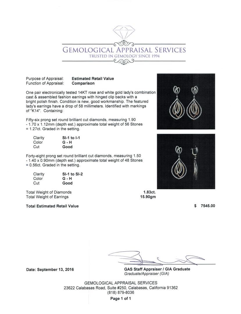 One pair electronically tested 14KT rose and white gold lady's combination cast & assembled fashion earrings with hinged clip backs with a bright polish finish. The featured lady's earrings have a drop of 58 millimeters. Identified with markings of 'K14'. Condition is new, good workmanship. Containing: Fifty-Six prong set round brilliant cut diamonds, measuring 1.90 - 1.70 x 1.12mm (depth est.) approximate total weight of 56 Stones = 1.27ct. Graded in the setting. Clarity SI-1 to I-1. Color: G - H Cut Good Forty-Eight prong set round brilliant cut diamonds, measuring 1.50 - 1.40 x 0.90mm (depth est.) approximate total weight of 48 Stones = 0.56ct. Graded in the setting. Clarity SI-1 to SI-2. Color: G - H Cut Good. Total Weight of Diamonds 1.83ct.. Total Weight of Earrings 15.90gm GAS Appraised.