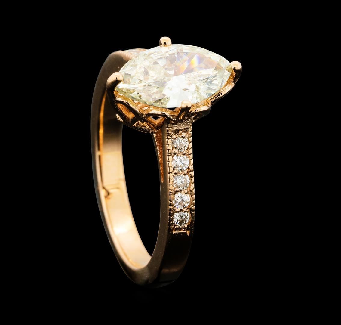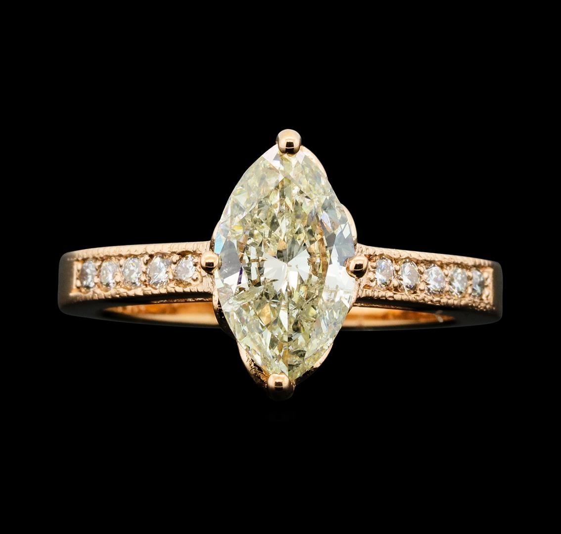 One electronically tested 14KT rose gold lady's cast wedding ring with a cathedral shank with a bright polish with milgrain detailing finish. The featured lady's ring has a shank measuring 2.60 millimeters wide. Identified with markings of '14K'. Condition is new, good workmanship. Containing: One prong set marquise shaped cut diamond, measuring 11.30 x 6.55 x 3.40mm (depth est.) , 13.00.%. GTCF approximate weight of 1.64ct. Graded in the setting. Clarity I-1. Color: K - L Cut Very Good Ten prong set round brilliant cut diamonds, measuring 1.80 - 1.70 x 1.05mm (depth est.) approximate total weight of 10 Stones = 0.19ct. Graded in the setting. Clarity VS-2 to SI-2. Color: H - I Cut Very Good. Total Weight of Diamonds 1.83ct.. Total Weight of Ring 4.80gm. GAS Appraised.