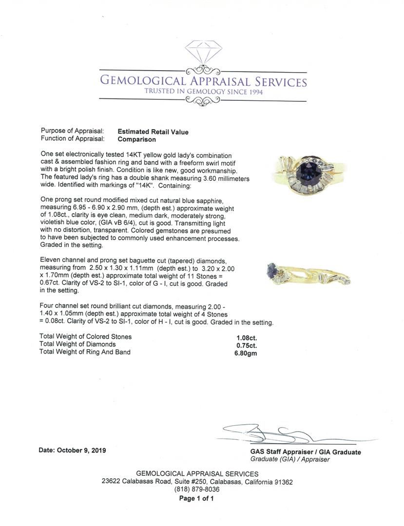 One set electronically tested 14KT yellow gold lady's combination cast & assembled fashion ring and band with a freeform swirl motif with a bright polish finish. The featured lady's ring has a double shank measuring 3.60 millimeters wide. Identified with markings of '14K'. Condition is Good. Containing: One prong set round modified mixed cut natural blue sapphire, measuring 6.95 - 6.90 x 2.90 mm, (depth est.) approximate weight of 1.08ct., clarity is eye clean, medium dark, moderately strong, violetish blue color, (GIA vB 6/4), cut is good. Transmitting light with no distortion, transparent. Colored gemstones are presumed to have been subjected to commonly used enhancement processes. Graded in the setting. Eleven channel and prong set baguette cut (tapered) diamonds, measuring from 2.50 x 1.30 x 1.11mm (depth est.) to 3.20 x 2.00 x 1.70mm (depth est.) approximate total weight of 11 Stones = 0.67ct. Graded in the setting. Color G - I Clarity VS-2 to SI-1 Cut Good Four channel set round brilliant cut diamonds, measuring 2.00 - 1.40 x 1.05mm (depth est.) approximate total weight of 4 Stones = 0.08ct. Graded in the setting. Color H - I Clarity VS-2 to SI-1 Cut Good. Total Weight of Colored Stones 1.08ct.. Total Weight of Diamonds 0.75ct.. Total Weight of Ring And Band 6.80gm GAS Appraised at $4340.00. GAS Appraised.