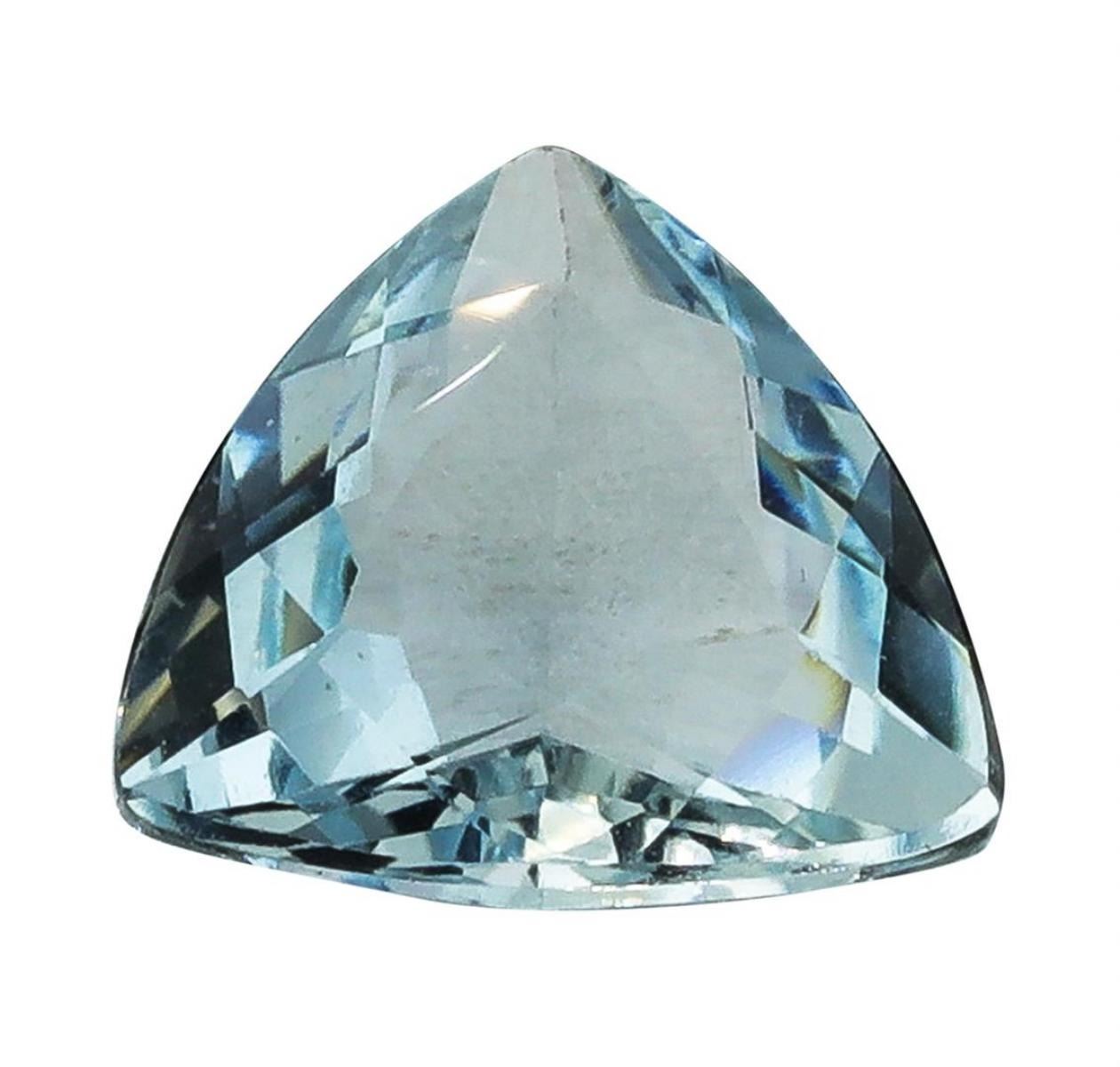 One natural trilliant cut aquamarine with an exact weight of 1.84ct., clarity is eye clean, slightly grayish greenish blue, medium light. Gemological Appraisals Services estimates the retail value at $708.4 GAS Appraised.