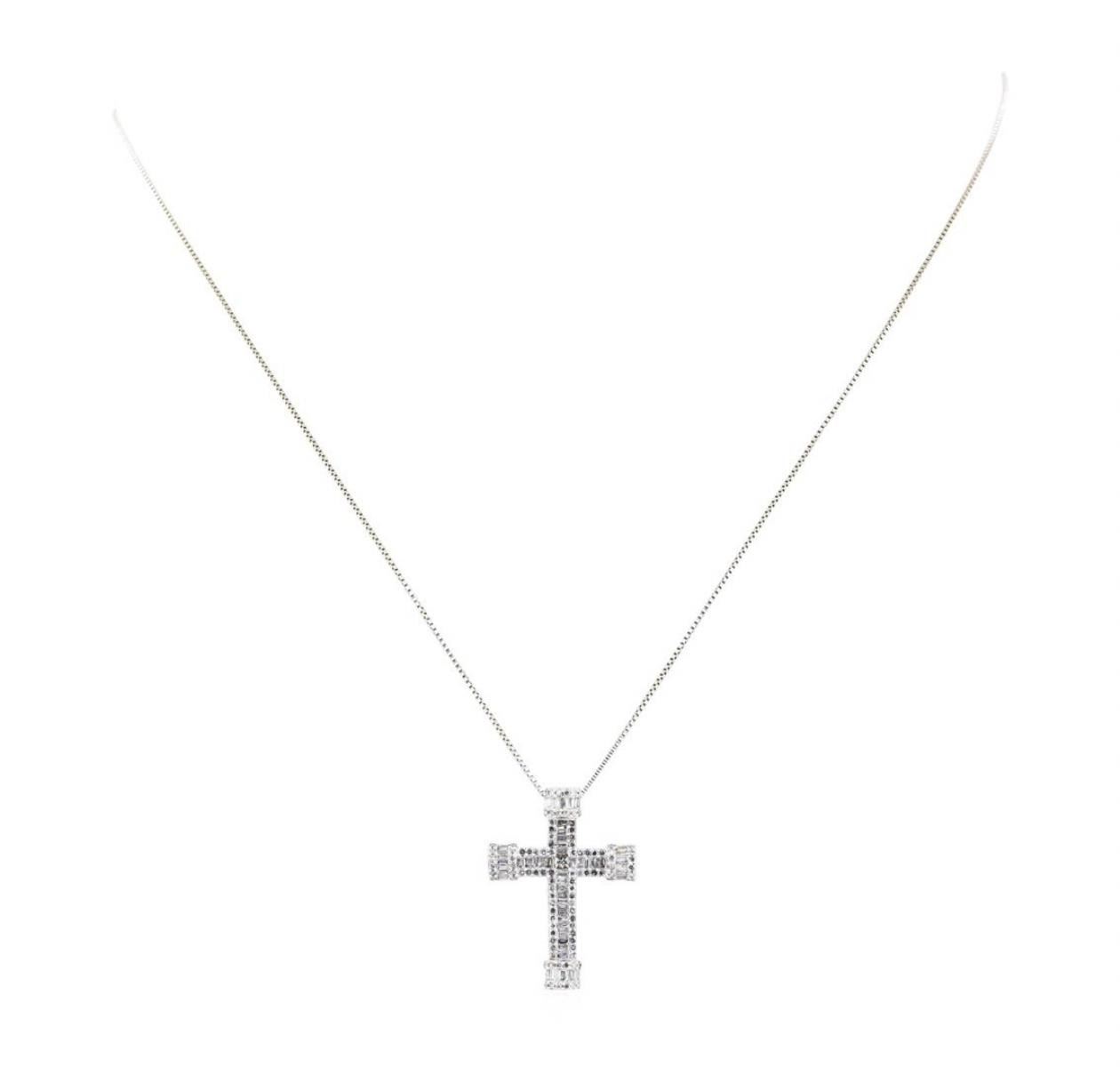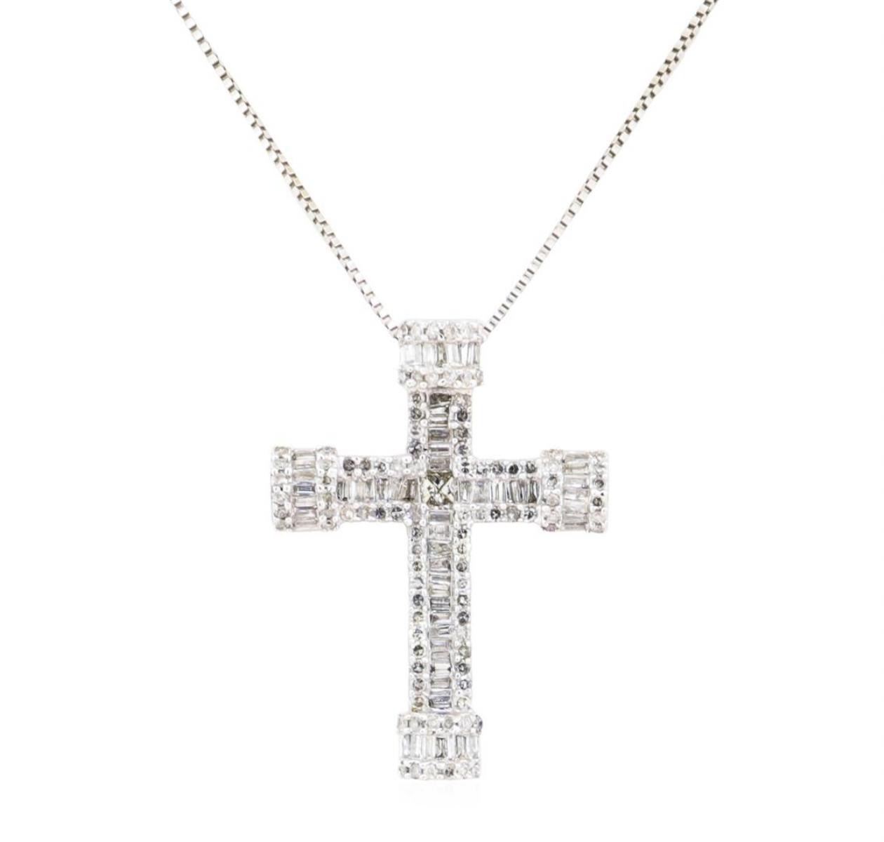 One electronically tested 14KT white gold lady's combination cast & assembled fashion cross pendant and chain 26.0' long, 1mm square box link with a lobster claw clasp with a bright polish finish. Identified with markings of '14K'. Condition is Good. Cont GAS Appraised.