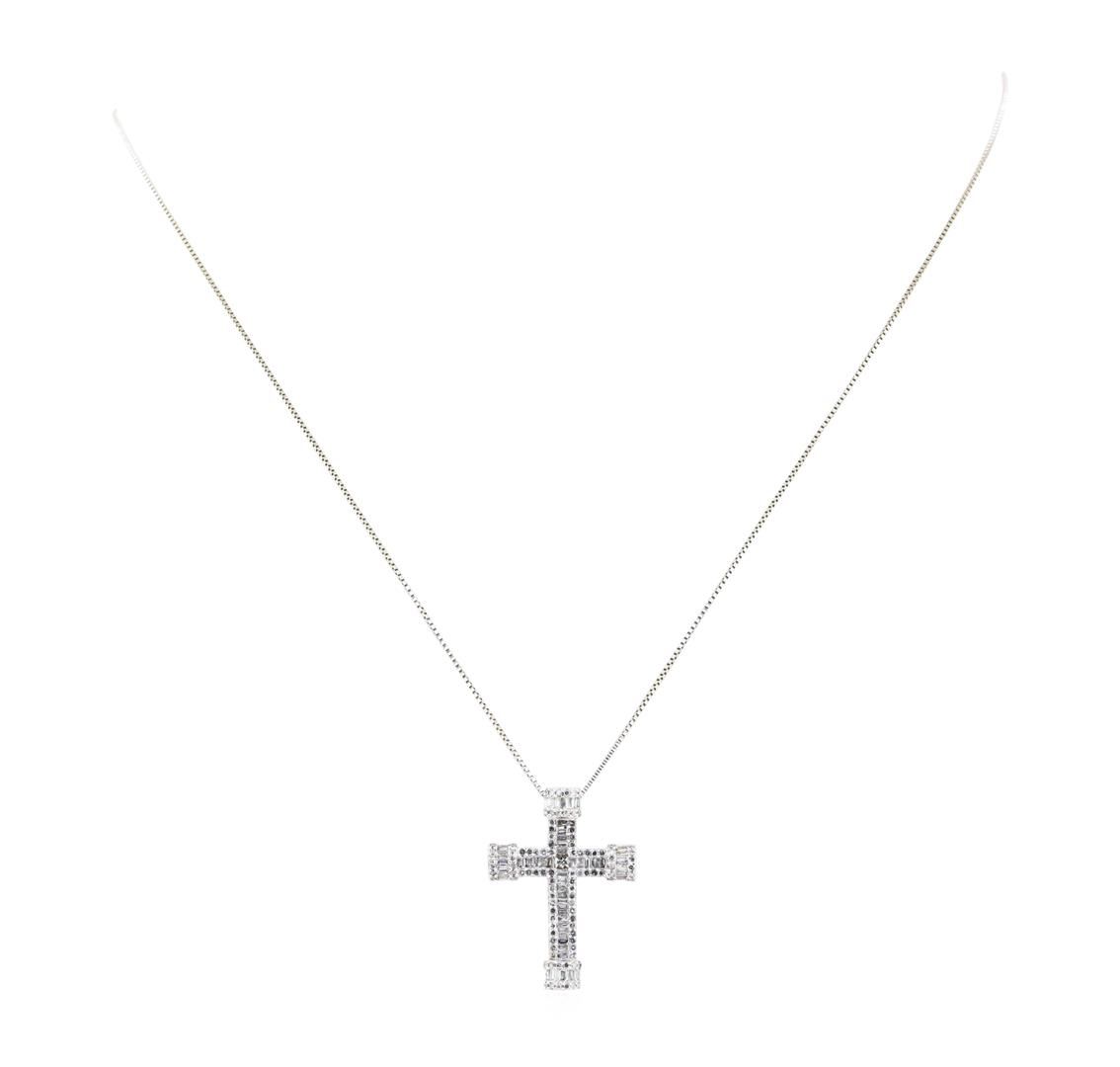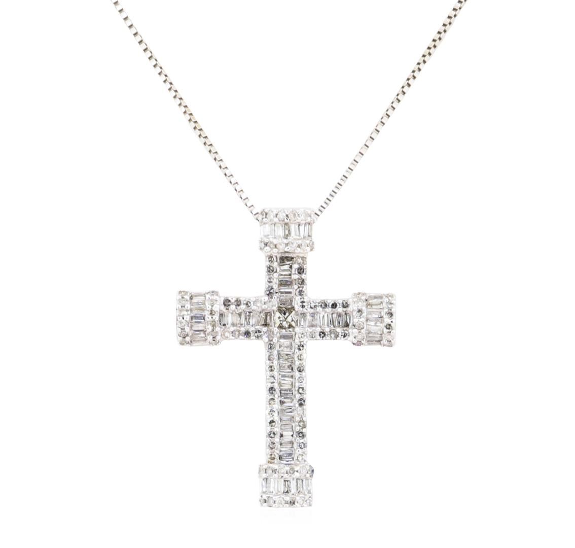 One electronically tested 14KT white gold lady's combination cast & assembled fashion cross pendant and chain 26.0' long, 1mm square box link with a lobster claw clasp with a bright polish finish. Identified with markings of '14K'. Condition is Good. Cont GAS Appraised.