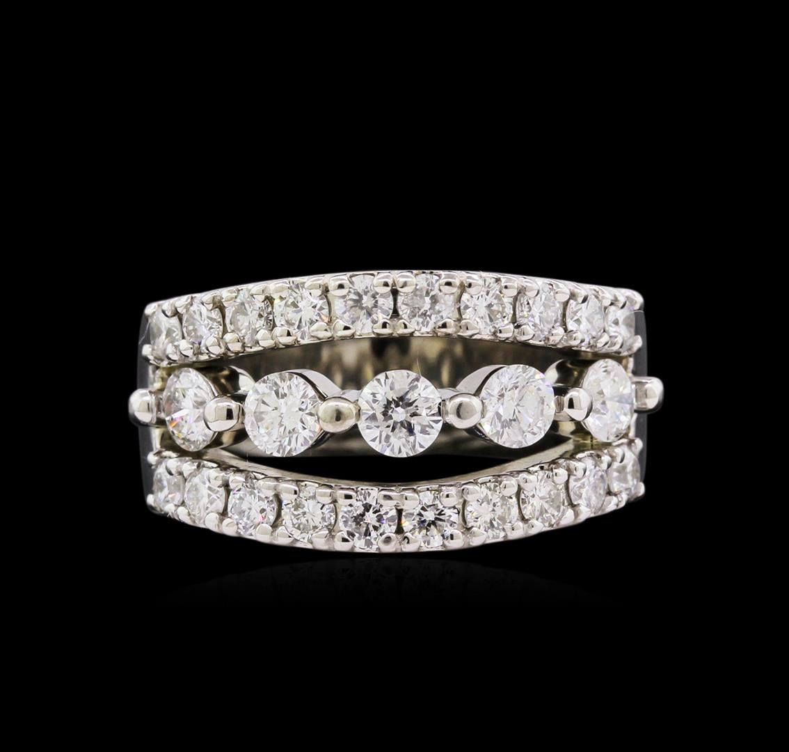 One electronically tested 14KT white gold ladies cast diamond ring with a bright polish finish. The ring features a floating diamond ribbon set within mirroring diamond ribbons, completed by a six millimeter wide band. Identified with markings of "14K". Condition is new, good workmanship. Containing: Five prong set round brilliant cut diamonds, measuring 3.70 - 3.50 x 2.16mm exact total weight 5 Stones = 0.82ct. Graded in the setting. Clarity: SI-2 to I-1. Color: G - H Twenty prong set round brilliant cut diamonds, measuring 2.40 - 2.30 x 1.41mm exact total weight 20 Stones = 1.02ct. Graded in the setting. Clarity: SI-2 to I-1. Color: G - I. Total Weight of Diamonds 1.84ct. Total Weight of Ring 11.79gm. AIG Appraised at $7,490.00.