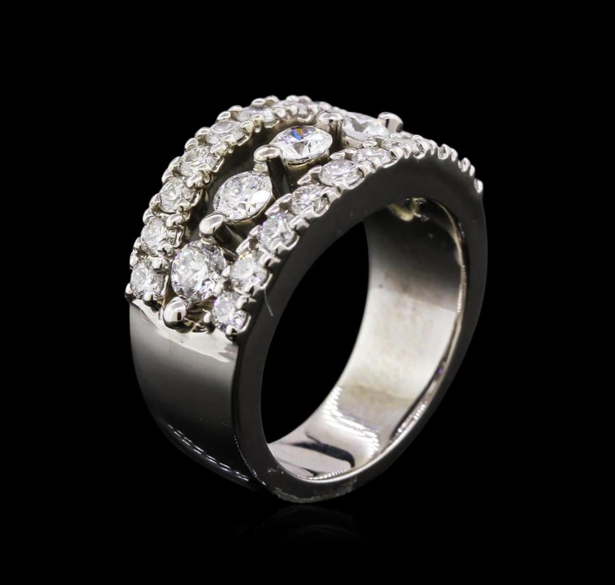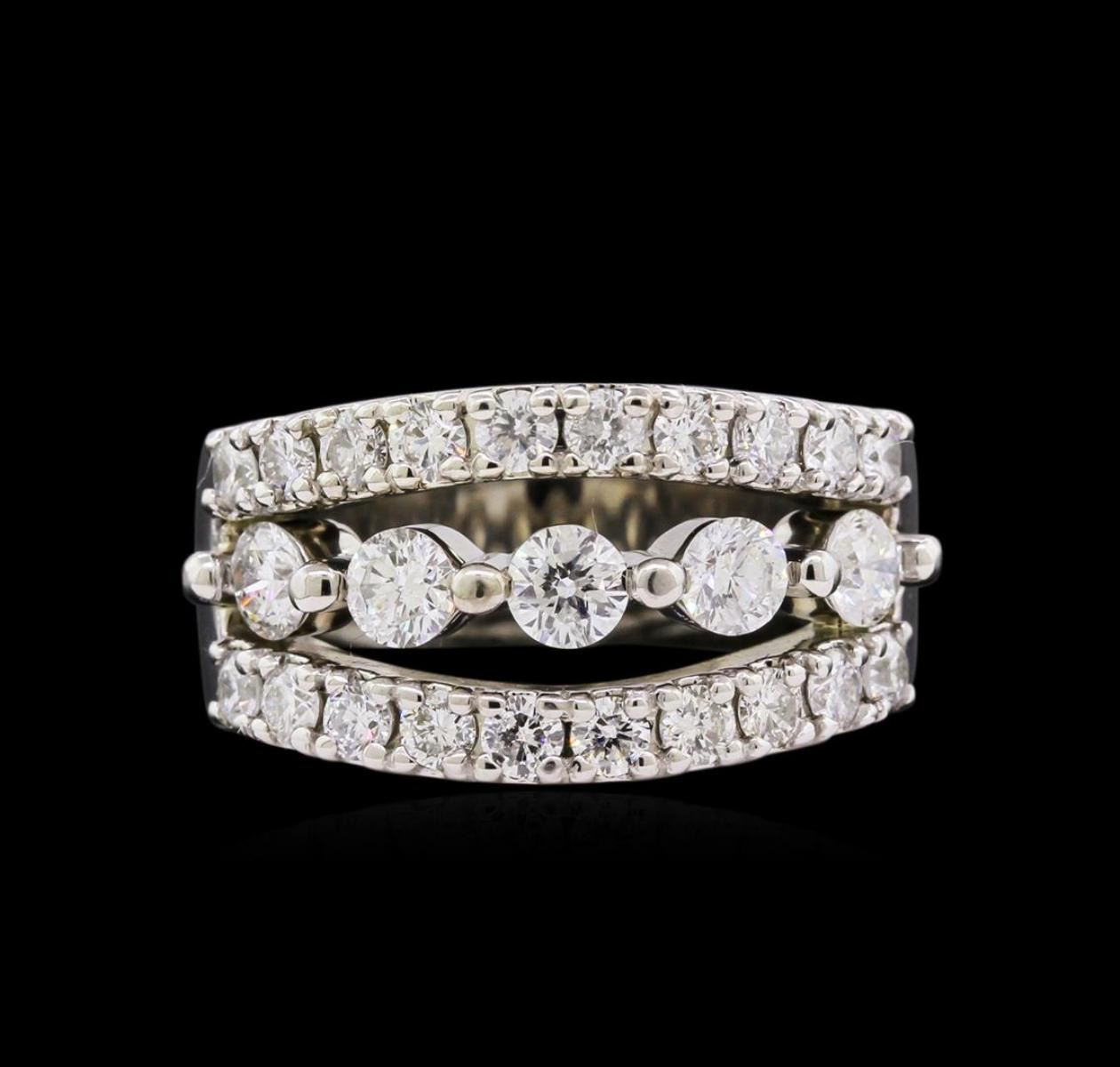 One electronically tested 14KT white gold ladies cast diamond ring with a bright polish finish. The ring features a floating diamond ribbon set within mirroring diamond ribbons, completed by a six millimeter wide band. Identified with markings of "14K". Condition is new, good workmanship. Containing: Five prong set round brilliant cut diamonds, measuring 3.70 - 3.50 x 2.16mm exact total weight 5 Stones = 0.82ct. Graded in the setting. Clarity: SI-2 to I-1. Color: G - H Twenty prong set round brilliant cut diamonds, measuring 2.40 - 2.30 x 1.41mm exact total weight 20 Stones = 1.02ct. Graded in the setting. Clarity: SI-2 to I-1. Color: G - I. Total Weight of Diamonds 1.84ct. Total Weight of Ring 11.79gm. AIG Appraised at $7,490.00.