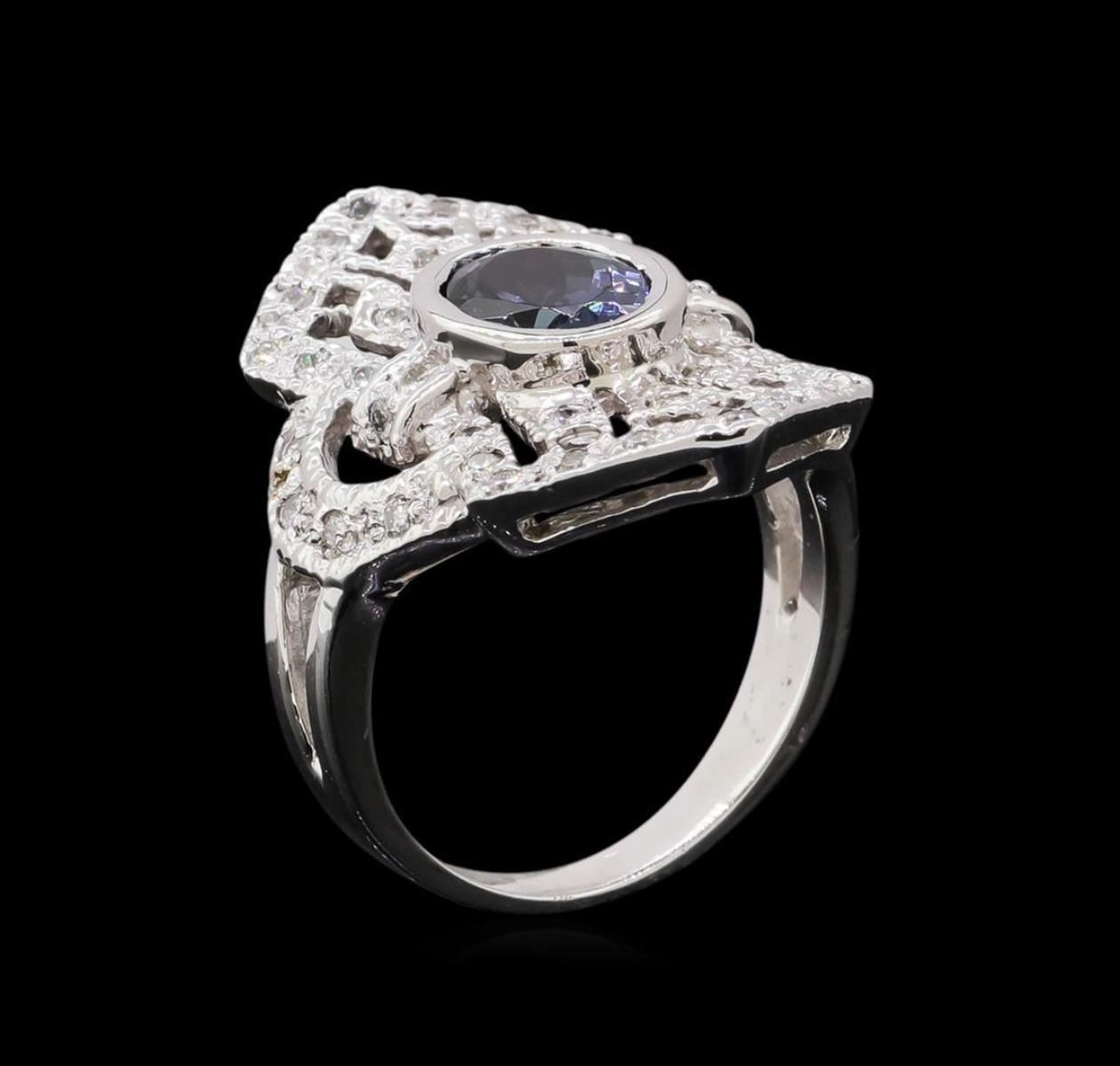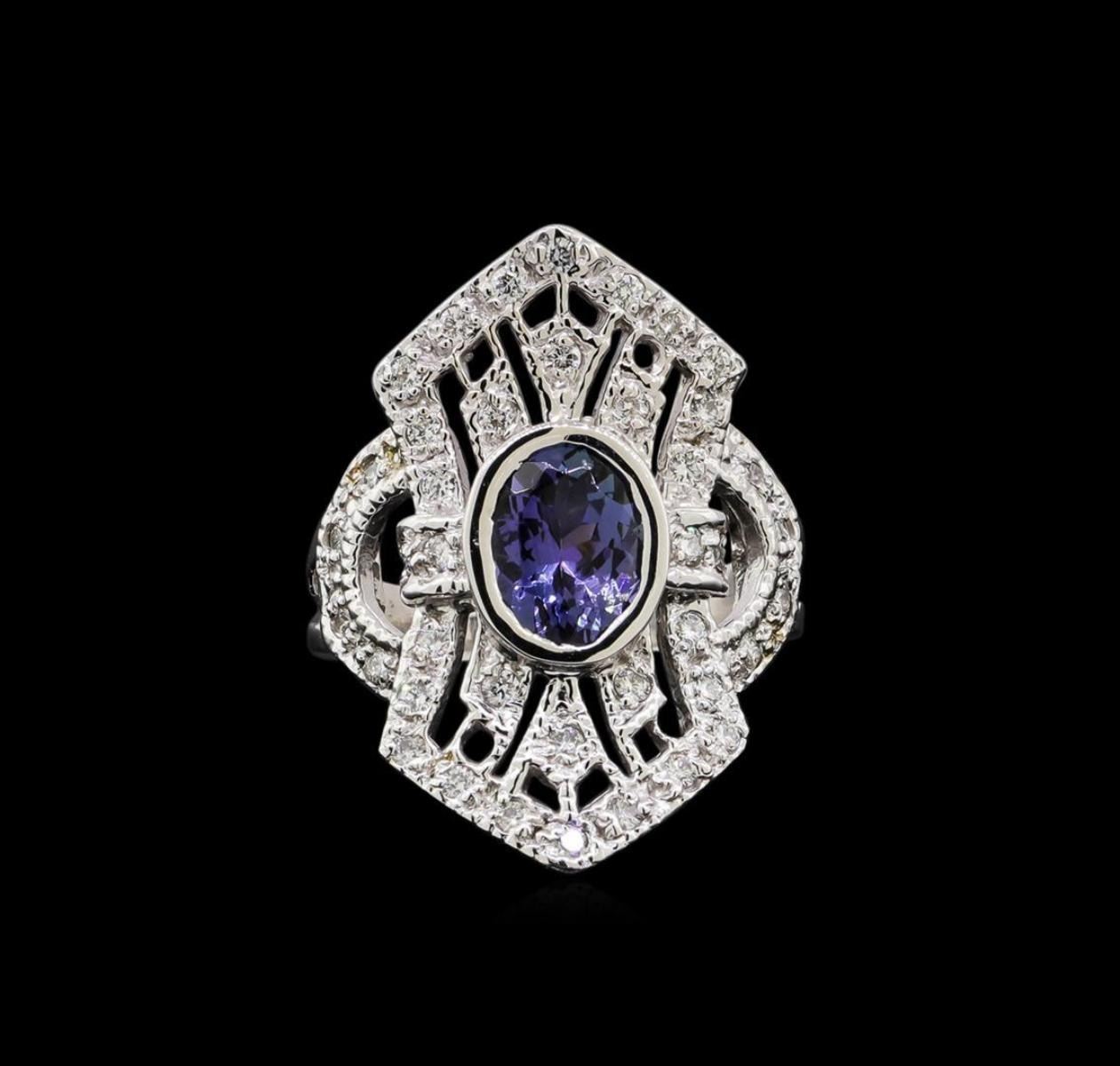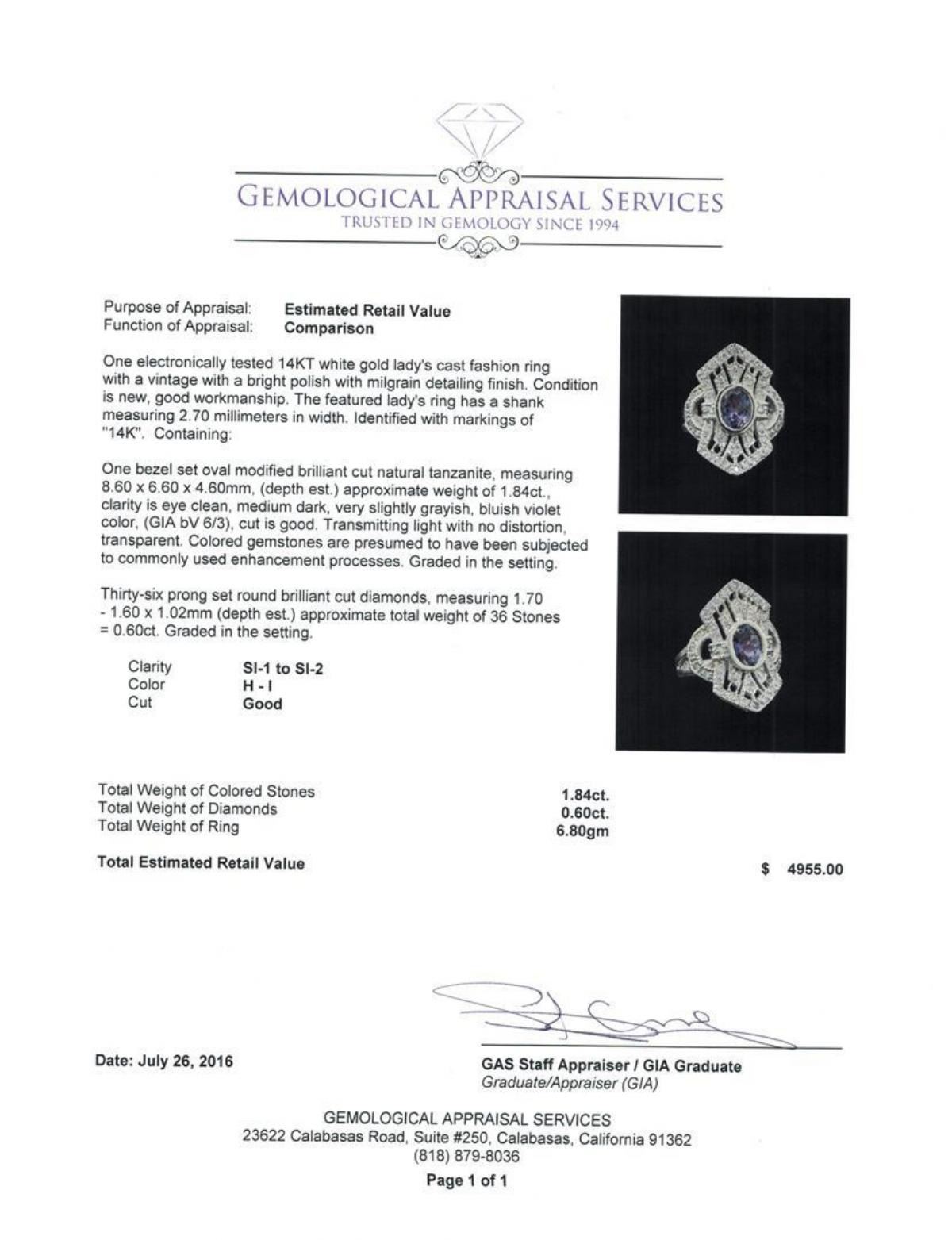 One electronically tested 14KT white gold lady's cast fashion ring with a vintage with a bright polish with milgrain detailing finish. The featured lady's ring has a shank measuring 2.70 millimeters in width. Identified with markings of '14K'. Condition is new, good workmanship. Containing: One bezel set oval modified brilliant cut natural tanzanite, measuring 8.60 x 6.60 x 4.60mm, (depth est.) approximate weight of 1.84ct., clarity is eye clean, medium dark, very slightly grayish, bluish violet color, (GIA bV 6/3), cut is good. Transmitting light with no distortion, transparent. Colored gemstones are presumed to have been subjected to commonly used enhancement processes. Graded in the setting. Thirty-Six prong set round brilliant cut diamonds, measuring 1.70 - 1.60 x 1.02mm (depth est.) approximate total weight of 36 Stones = 0.60ct. Graded in the setting. Clarity SI-1 to SI-2. Color: H - I Cut Good. Total Weight of Colored Stones 1.84ct.. Total Weight of Diamonds 0.60ct.. Total Weight of Ring 6.80gm. GAS Appraised.