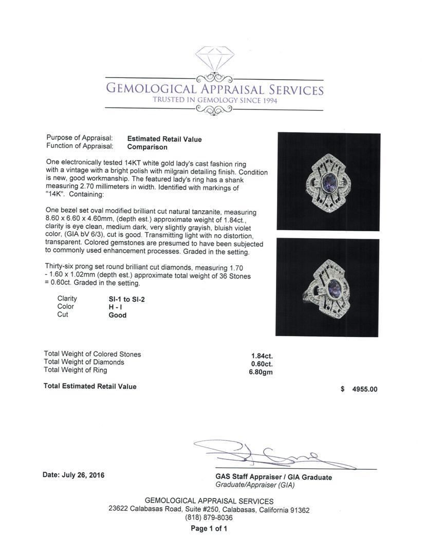 One electronically tested 14KT white gold lady's cast fashion ring with a vintage with a bright polish with milgrain detailing finish. The featured lady's ring has a shank measuring 2.70 millimeters in width. Identified with markings of '14K'. Condition is new, good workmanship. Containing: One bezel set oval modified brilliant cut natural tanzanite, measuring 8.60 x 6.60 x 4.60mm, (depth est.) approximate weight of 1.84ct., clarity is eye clean, medium dark, very slightly grayish, bluish violet color, (GIA bV 6/3), cut is good. Transmitting light with no distortion, transparent. Colored gemstones are presumed to have been subjected to commonly used enhancement processes. Graded in the setting. Thirty-Six prong set round brilliant cut diamonds, measuring 1.70 - 1.60 x 1.02mm (depth est.) approximate total weight of 36 Stones = 0.60ct. Graded in the setting. Clarity SI-1 to SI-2. Color: H - I Cut Good. Total Weight of Colored Stones 1.84ct.. Total Weight of Diamonds 0.60ct.. Total Weight of Ring 6.80gm. GAS Appraised.