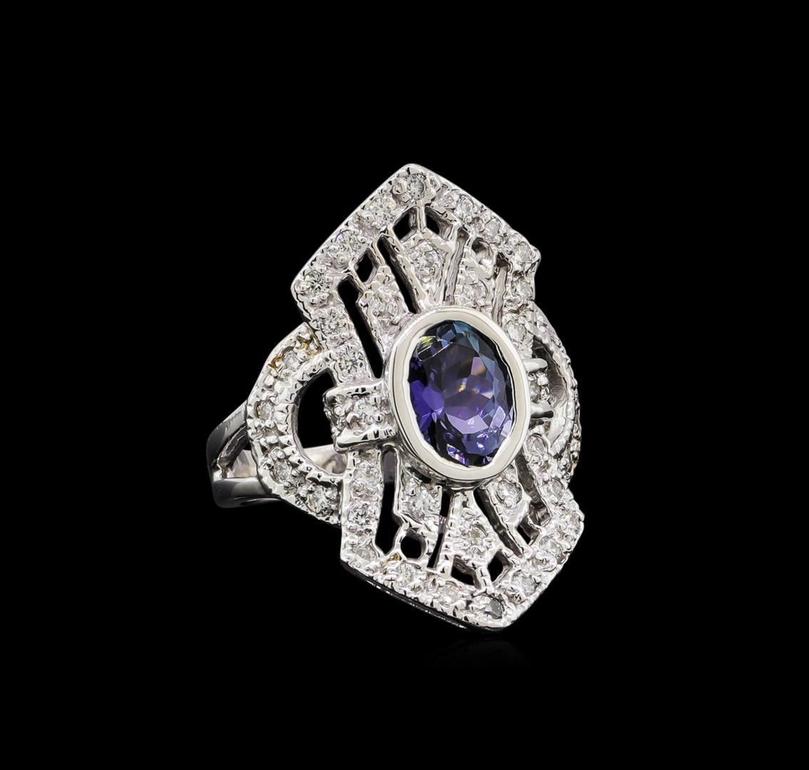 One electronically tested 14KT white gold lady's cast fashion ring with a vintage with a bright polish with milgrain detailing finish. The featured lady's ring has a shank measuring 2.70 millimeters in width. Identified with markings of '14K'. Condition is new, good workmanship. Containing: One bezel set oval modified brilliant cut natural tanzanite, measuring 8.60 x 6.60 x 4.60mm, (depth est.) approximate weight of 1.84ct., clarity is eye clean, medium dark, very slightly grayish, bluish violet color, (GIA bV 6/3), cut is good. Transmitting light with no distortion, transparent. Colored gemstones are presumed to have been subjected to commonly used enhancement processes. Graded in the setting. Thirty-Six prong set round brilliant cut diamonds, measuring 1.70 - 1.60 x 1.02mm (depth est.) approximate total weight of 36 Stones = 0.60ct. Graded in the setting. Clarity SI-1 to SI-2. Color: H - I Cut Good. Total Weight of Colored Stones 1.84ct.. Total Weight of Diamonds 0.60ct.. Total Weight of Ring 6.80gm. GAS Appraised.
