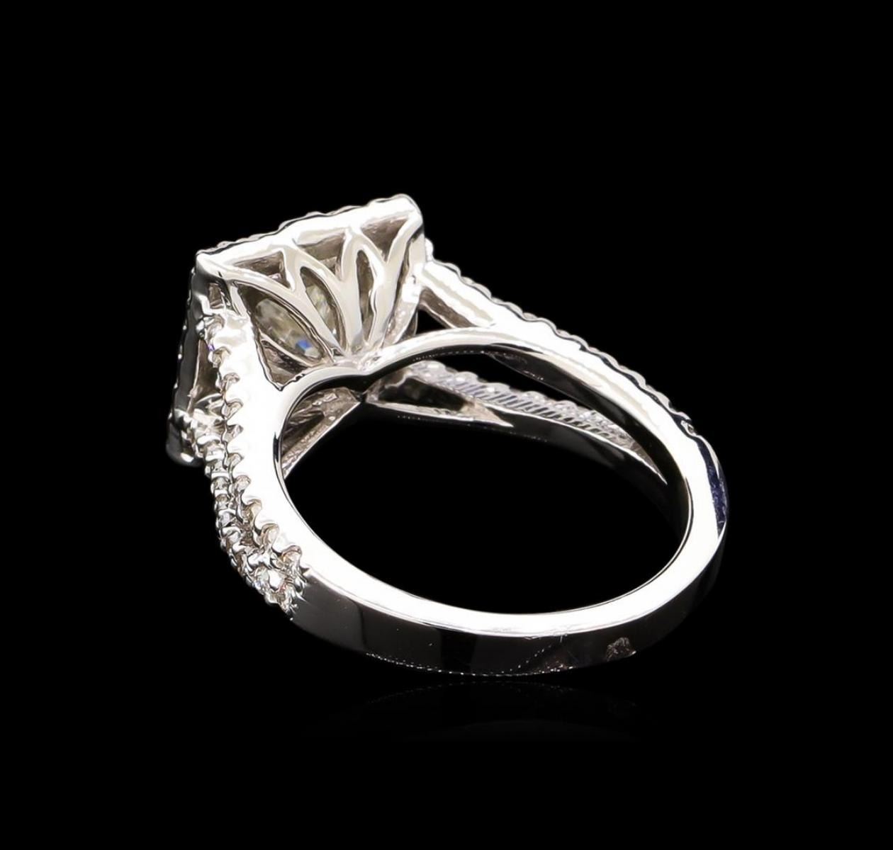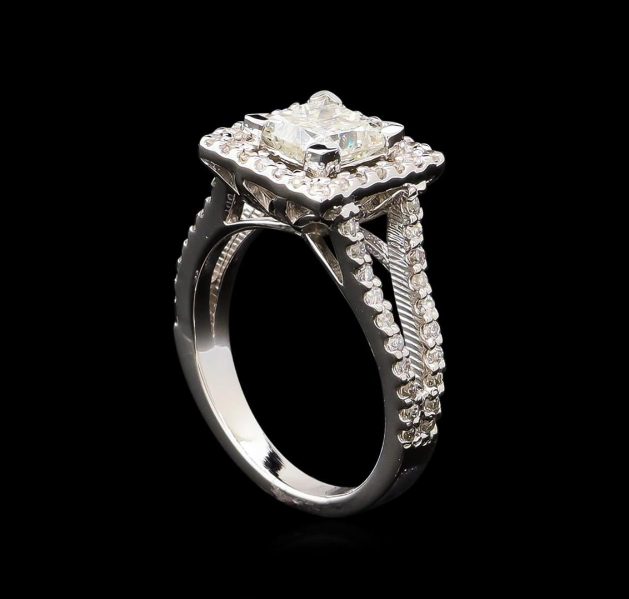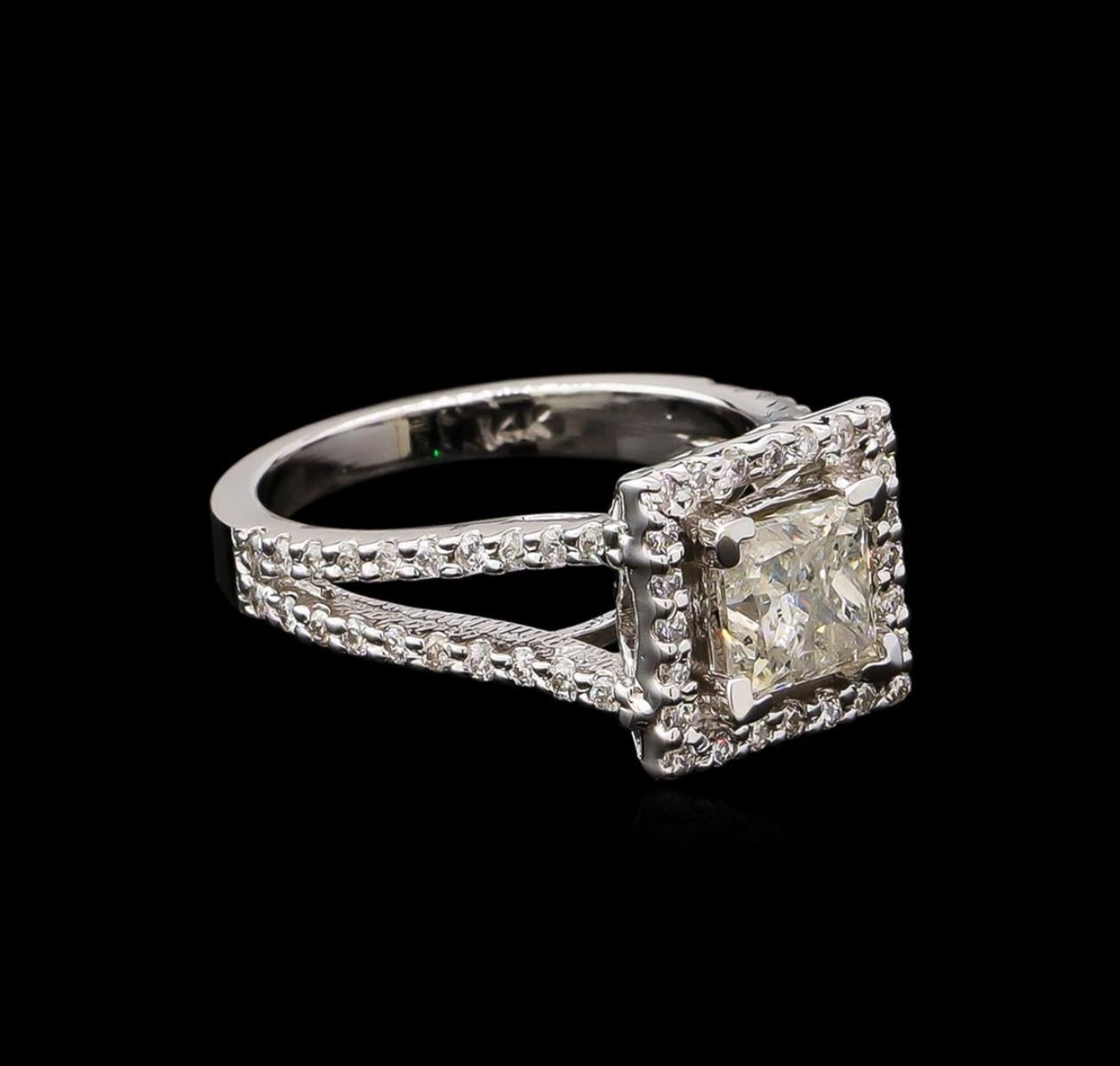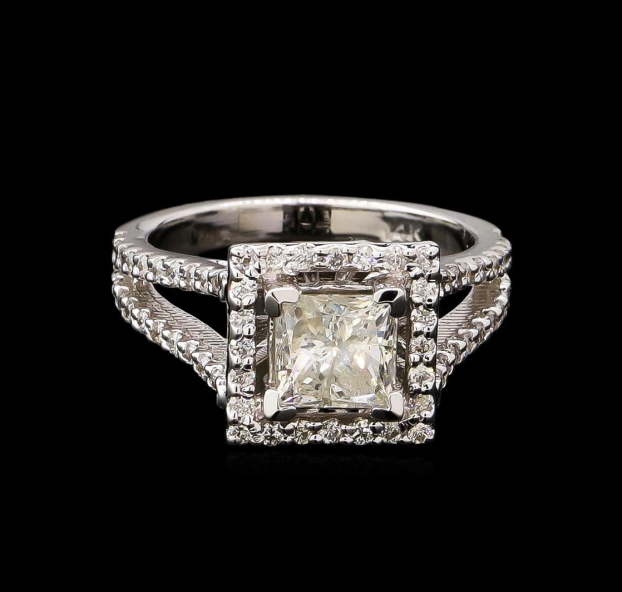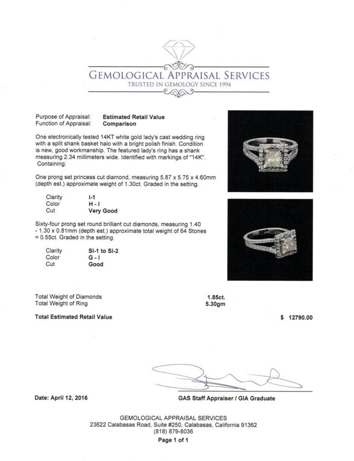 One electronically tested 14KT white gold lady's cast wedding ring with a split shank basket halo with a bright polish finish. The featured lady's ring has a shank measuring 2.34 millimeters wide. Identified with markings of "14K". Condition is new, good workmanship. Containing: One prong set princess cut diamond, measuring 5.87 x 5.75 x 4.60mm (depth est.) approximate weight of 1.30ct. Graded in the setting. Clarity: I-1. Color: H - I. Cut Very Good Sixty-Four prong set round brilliant cut diamonds, measuring 1.40 - 1.30 x 0.81mm (depth est.) approximate total weight of 64 Stones = 0.55ct. Graded in the setting. Clarity: SI-1 to SI-2. Color: G - I. Cut Good. Total Weight of Diamonds 1.85ct. Total Weight of Ring 5.30gm. GAS Appraised.