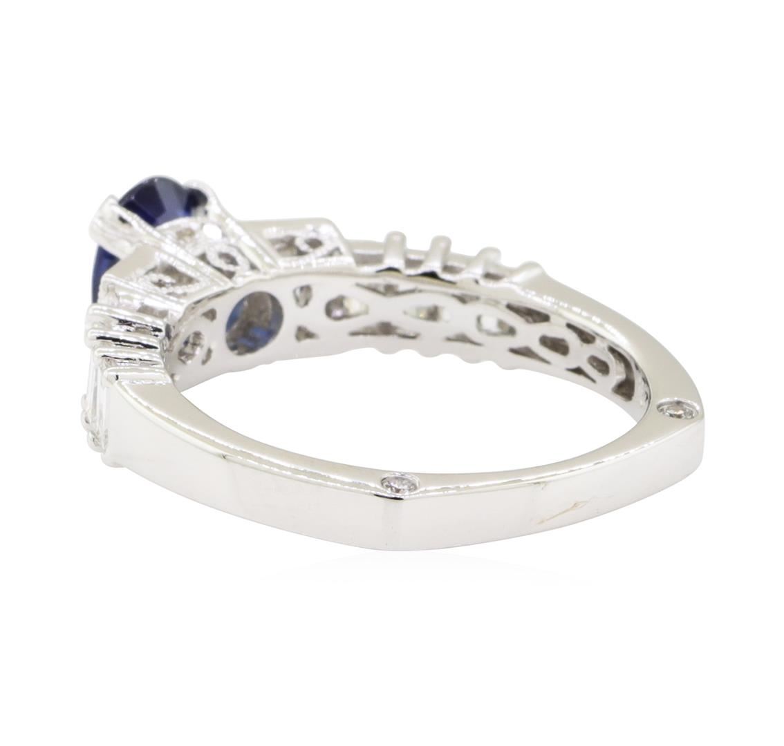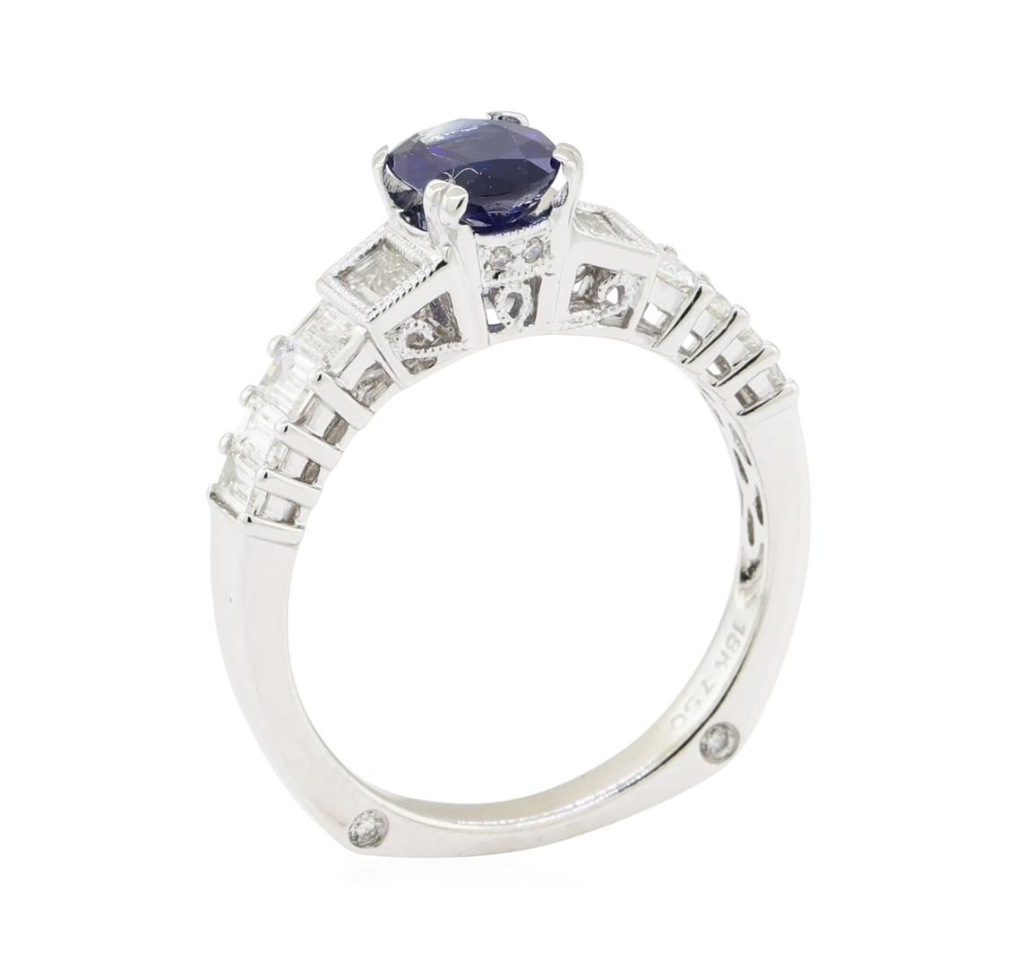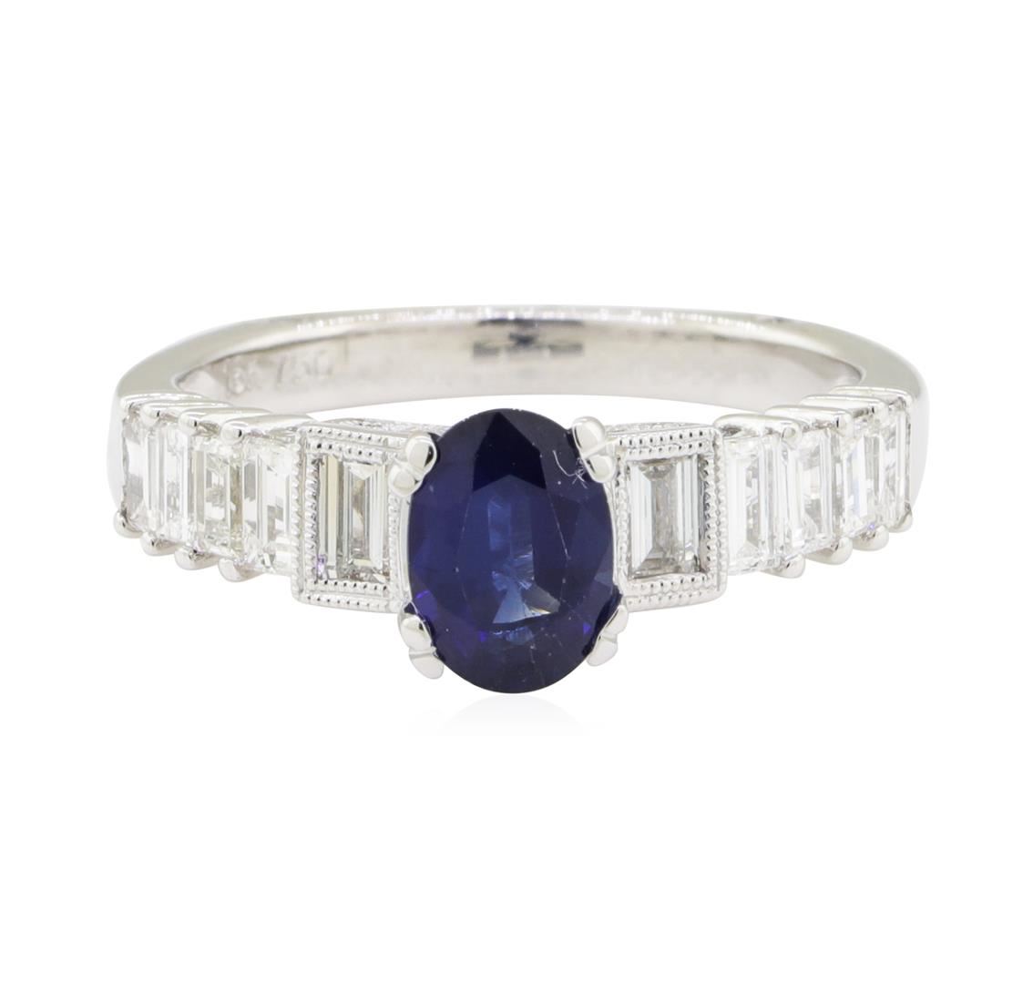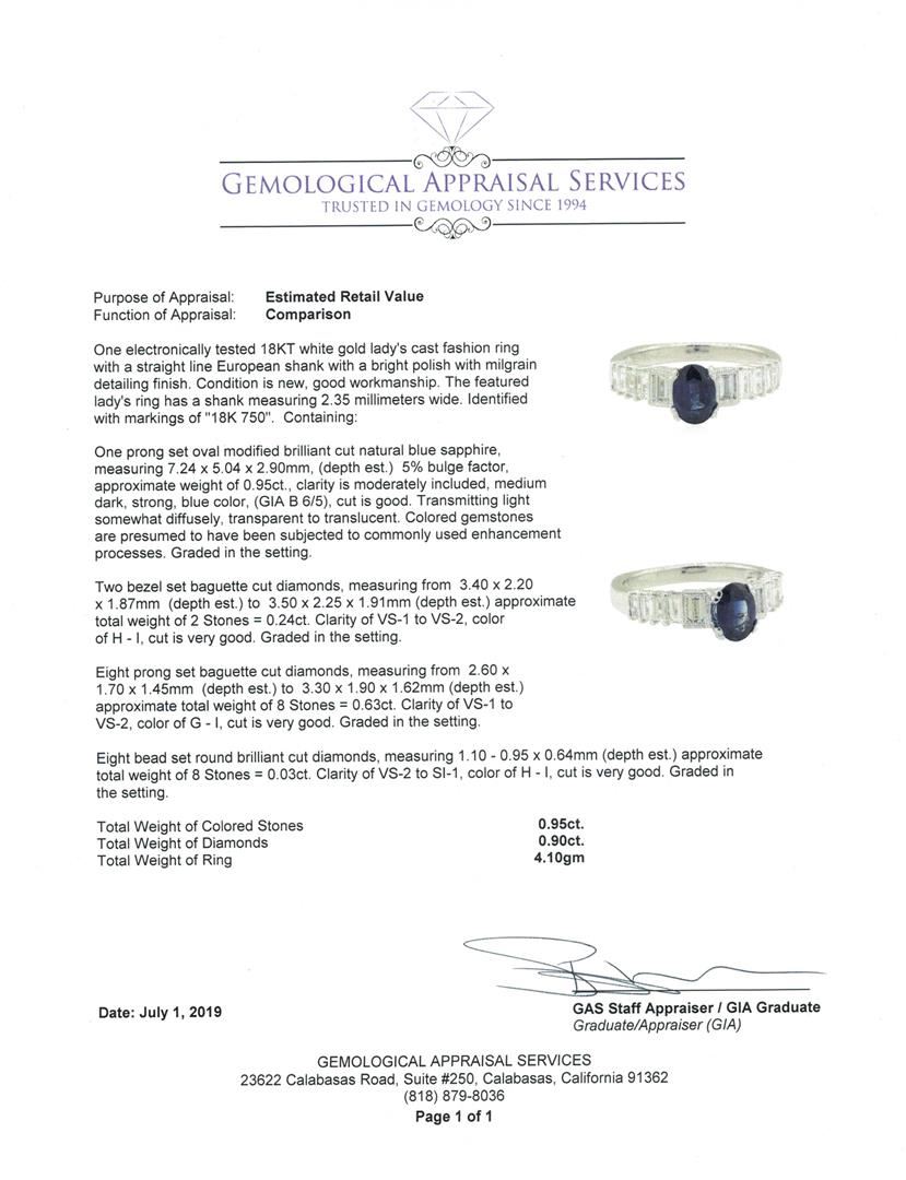 One electronically tested 18KT white gold lady's cast fashion ring with a straight line European shank with a bright polish with milgrain detailing finish. The featured lady's ring has a shank measuring 2.35 millimeters wide. Identified with markings of '18K 750'. Condition is new, good workmanship. Containing: One prong set oval modified brilliant cut natural blue sapphire, measuring 7.24 x 5.04 x 2.90mm, (depth est.) 5%. bulge factor, approximate weight of 0.95ct., clarity is moderately included, medium dark, strong, blue color, (GIA B 6/5), cut is good. Transmitting light somewhat diffusely, transparent to translucent. Colored gemstones are presumed to have been subjected to commonly used enhancement processes. Graded in the setting. Two bezel set baguette cut diamonds, measuring from 3.40 x 2.20 x 1.87mm (depth est.) to 3.50 x 2.25 x 1.91mm (depth est.) approximate total weight of 2 Stones = 0.24ct. Graded in the setting. Color H - I Clarity VS-1 to VS-2 Cut Very Good Eight prong set baguette cut diamonds, measuring from 2.60 x 1.70 x 1.45mm (depth est.) to 3.30 x 1.90 x 1.62mm (depth est.) approximate total weight of 8 Stones = 0.63ct. Graded in the setting. Color G - I Clarity VS-1 to VS-2 Cut Very Good Eight bead set round brilliant cut diamonds, measuring 1.10 - 0.95 x 0.64mm (depth est.) approximate total weight of 8 Stones = 0.03ct. Graded in the setting. Color H - I Clarity VS-2 to SI-1 Cut Very Good. Total Weight of Colored Stones 0.95ct.. Total Weight of Diamonds 0.90ct.. Total Weight of Ring 4.10gm GAS Appraised at $5220.00. GAS Appraised.