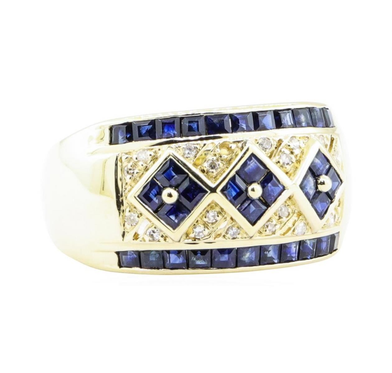 One electronically tested 14KT yellow gold lady's combination cast & assembled fashion wide band with a tapered shank with a bright polish finish. The featured lady's ring has a shank measuring 4.90 millimeters in width. Identified with markings of '14K'. Condition is Good. Containing: Thirty-four channel set square standard step cut natural blue sapphires, measuring 2.00 x 1.90 x 1.27mm, (depth est.) approximate total weight of 1.70 ct., clarity is eye clean, medium dark, moderately strong, blue color, (GIA B 6/4), cut is good. Colored gemstones are presumed to have been subjected to commonly used enhancement processes. Transmitting light with no distortion, transparent. Graded in the setting. Twenty prong set single cut diamonds, measuring 1.30 - 1.25 x 0.77mm (depth est.) approximate total weight of 20 Stones = 0.16ct. Graded in the setting. Color G - H Clarity VS-2 to SI-1 Cut Good. Total Weight of Colored Stones 1.70 ct.. Total Weight of Diamonds 0.16ct.. Total Weight of Wide Band 10.70gm GAS Appraised at $3610.00. GAS Appraised.