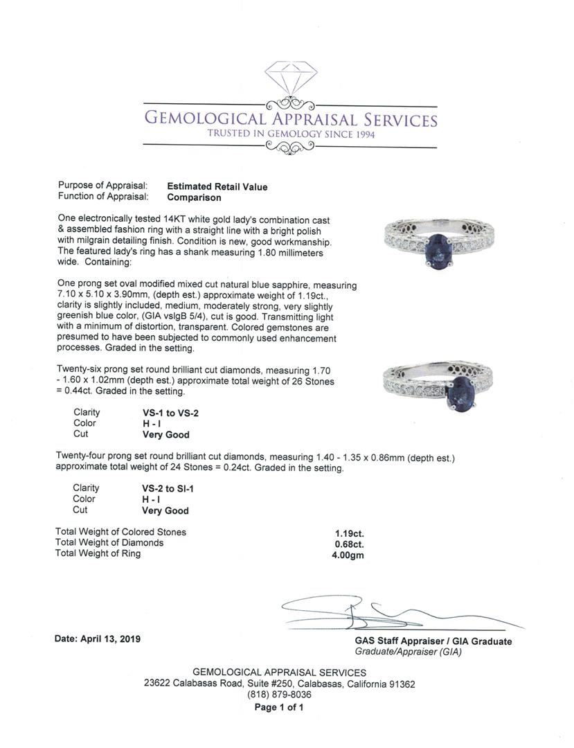One electronically tested 14KT white gold lady's combination cast & assembled fashion ring with a straight line with a bright polish with milgrain detailing finish. The featured lady's ring has a shank measuring 1.80 millimeters wide. Condition is new, good workmanship. Containing: One prong set oval modified mixed cut natural blue sapphire, measuring 7.10 x 5.10 x 3.90mm, (depth est.) approximate weight of 1.19ct., clarity is slightly included, medium, moderately strong, very slightly greenish blue color, (GIA vslgB 5/4), cut is good. Transmitting light with a minimum of distortion, transparent. Colored gemstones are presumed to have been subjected to commonly used enhancement processes. Graded in the setting. Twenty-Six prong set round brilliant cut diamonds, measuring 1.70 - 1.60 x 1.02mm (depth est.) approximate total weight of 26 Stones = 0.44ct. Graded in the setting. Color H - I Clarity VS-1 to VS-2 Cut Very Good Twenty-Four prong set round brilliant cut diamonds, measuring 1.40 - 1.35 x 0.86mm (depth est.) approximate total weight of 24 Stones = 0.24ct. Graded in the setting. Color H - I Clarity VS-2 to SI-1 Cut Very Good. Total Weight of Colored Stones 1.19ct.. Total Weight of Diamonds 0.68ct.. Total Weight of Ring 4.00gm GAS Appraised at $3870.00. GAS Appraised.