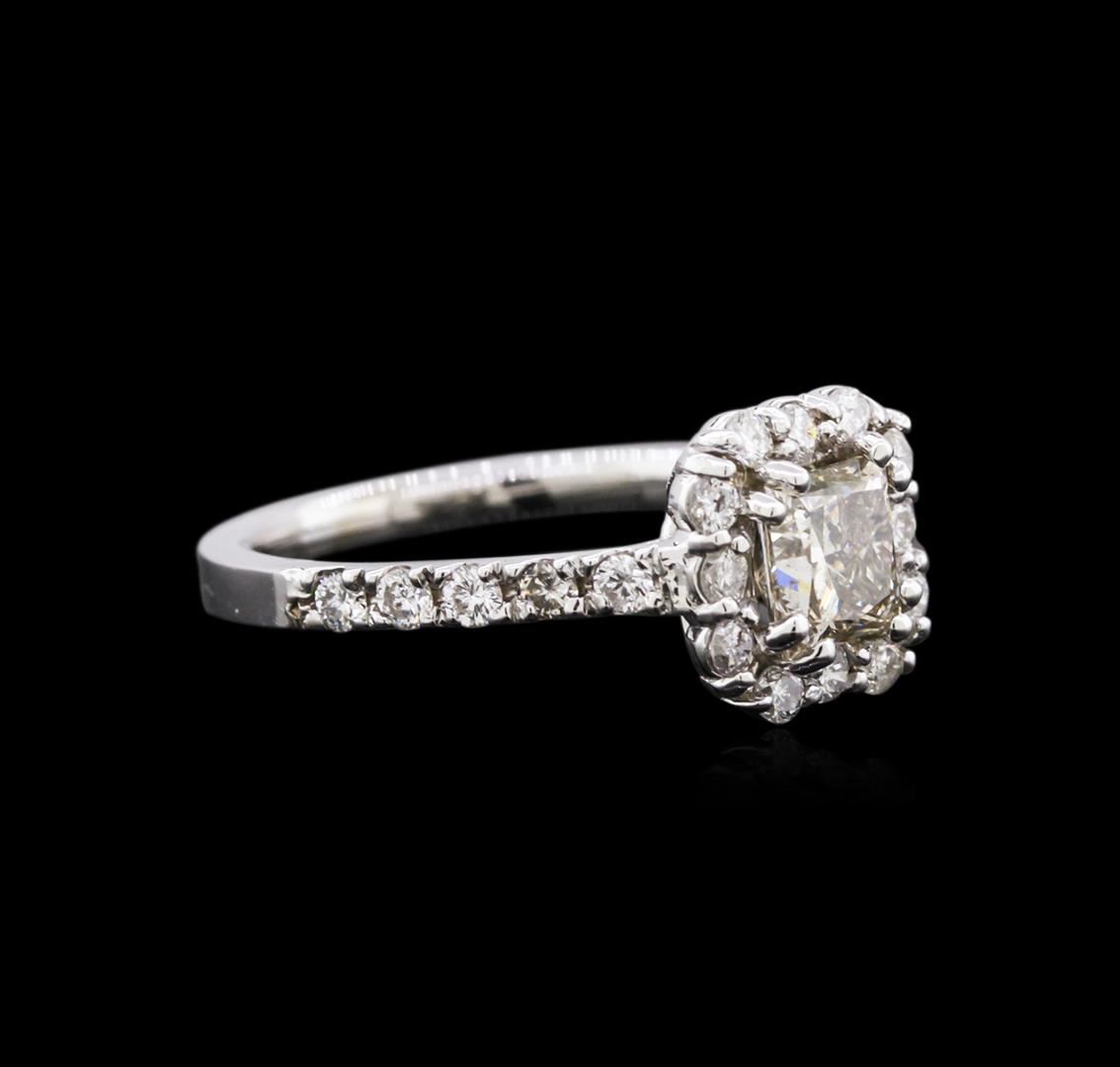 One electronically tested 14KT white gold ladies cast diamond engagement ring with a bright polish finish. Identified with markings of "14K". Condition is new. Containing: One prong set radiant shaped cut diamond, measuring 5.50 x 5.30 x 3.24mm (depth est.) approximate weight of 1.02ct. Clarity: I-1. Color: M, Cut is Good. Twenty-Two prong set round brilliant cut diamonds, measuring 2.00 - 1.50 x 1.05mm (depth est.) approximate total weight of 22 Stones = 0.85ct. Clarity: SI-1. Color: I - J, Cut is Good. Diamonds are graded in the mounting, unless otherwise stated. Total Weight of Diamonds 1.87ct. Total Weight of Engagement Ring 3.80 grams. GGL Appraised at $3,975.00.